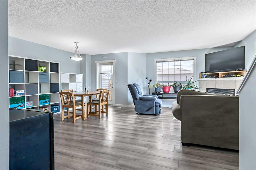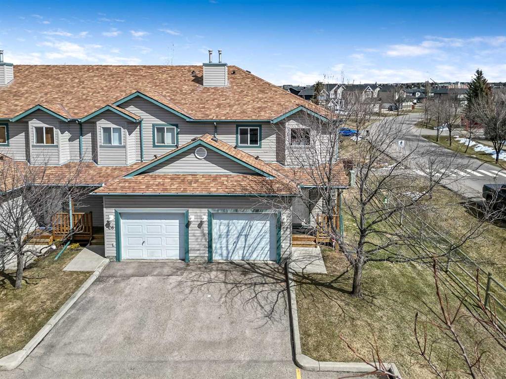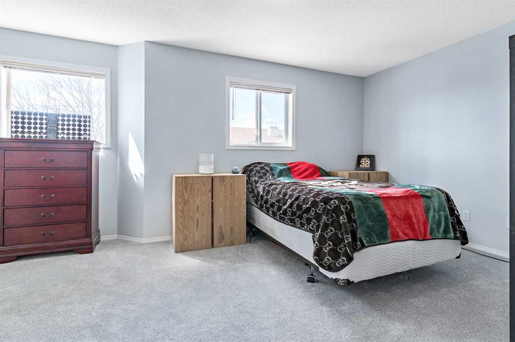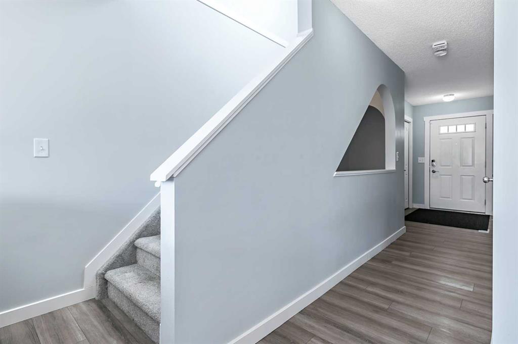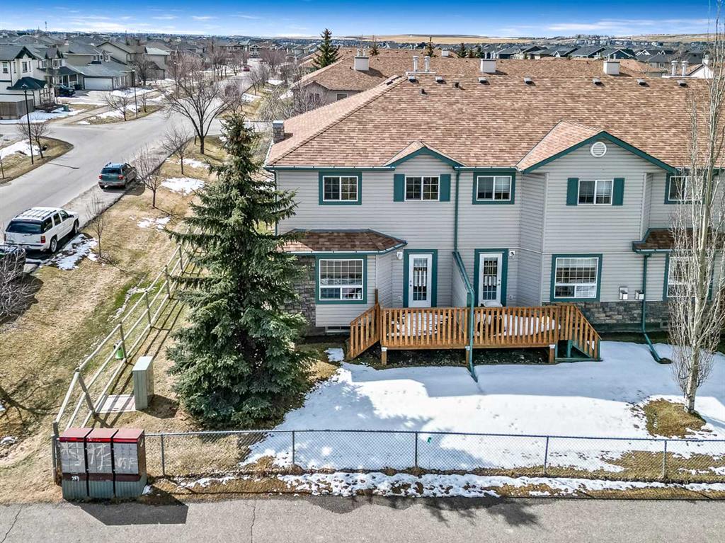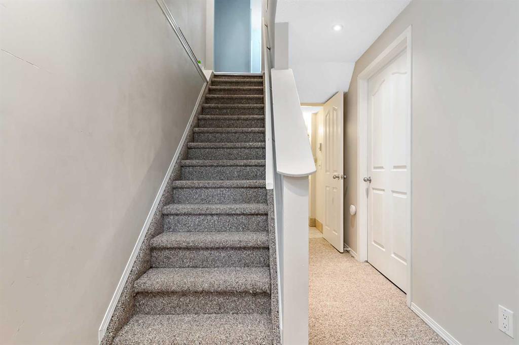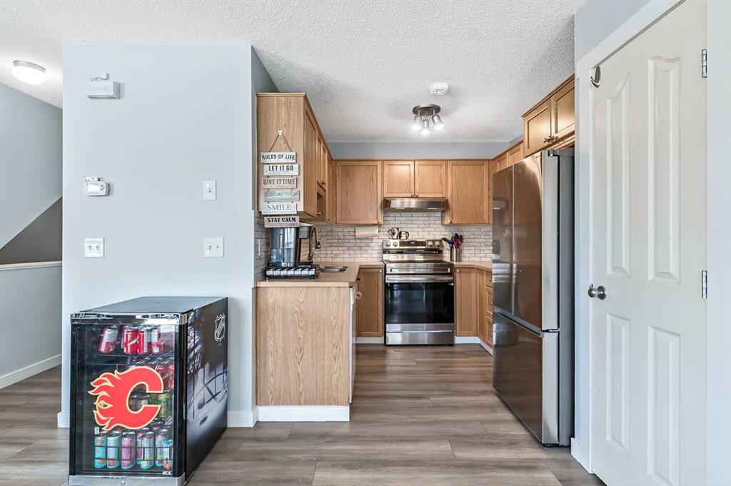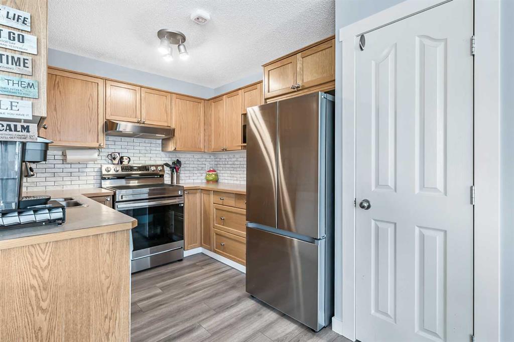 Welcome Home! This beautifully updated 1,342 sq. ft. two-storey townhome is located in the highly sought-after community of Canals in Airdrie. As an end unit backing onto a peaceful greenbelt and pathway system, this home offers both privacy and an abundance of natural light. Step inside to a spacious foyer that opens to a bright and inviting main floor, featuring brand new laminate flooring throughout. The kitchen has been tastefully refreshed with a new fridge, range, stylish backsplash, and plenty of cupboard and counter space—perfect for both everyday living and entertaining. The cozy family room is highlighted by a charming fireplace and large windows that flood the space with light. From here, step out onto your private deck—an ideal spot for BBQs and relaxing with friends. A renovated powder room completes the main level. Upstairs, you’ll find brand new carpet throughout, leading to two generously sized primary bedrooms and a versatile bonus area—perfect for a home office or reading nook. A well-appointed 4-piece bathroom is conveniently located between the bedrooms. The fully developed basement offers even more living space, including a large flex room that can easily serve as a bedroom, a laundry area with new washer and dryer, and an additional 4-piece bathroom.