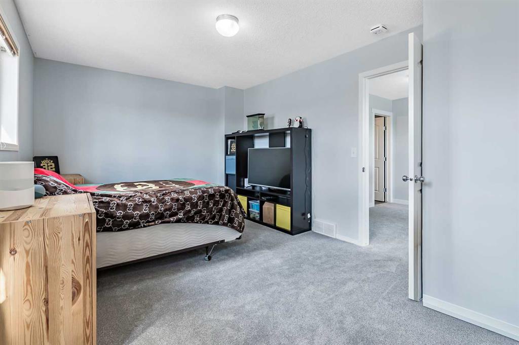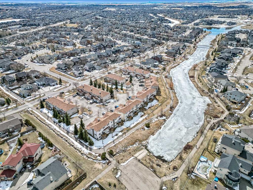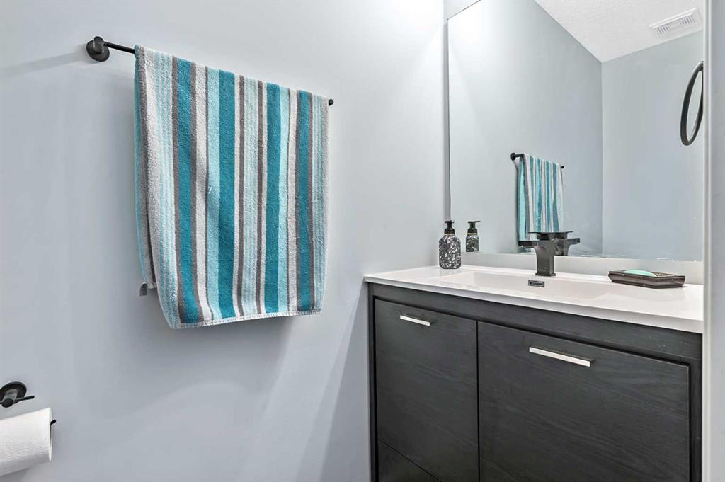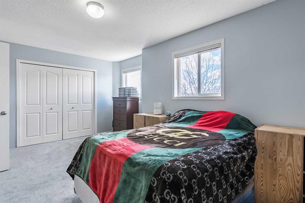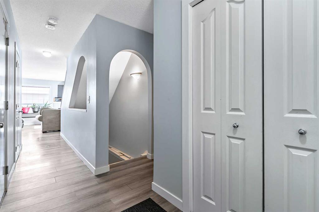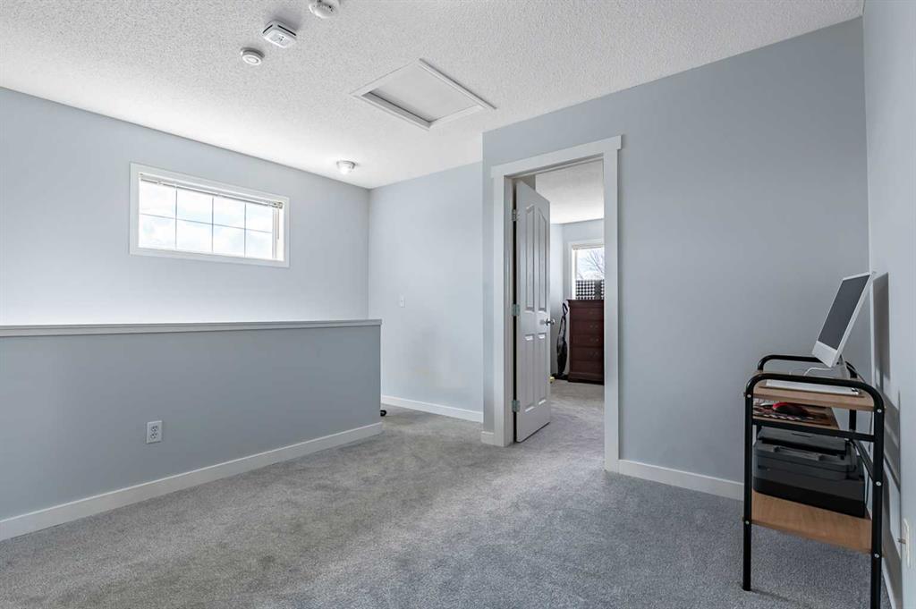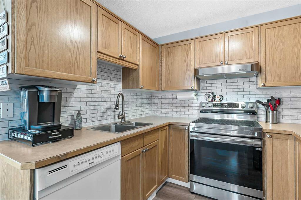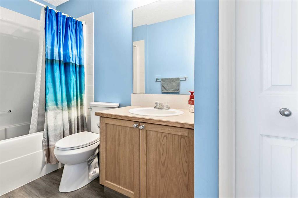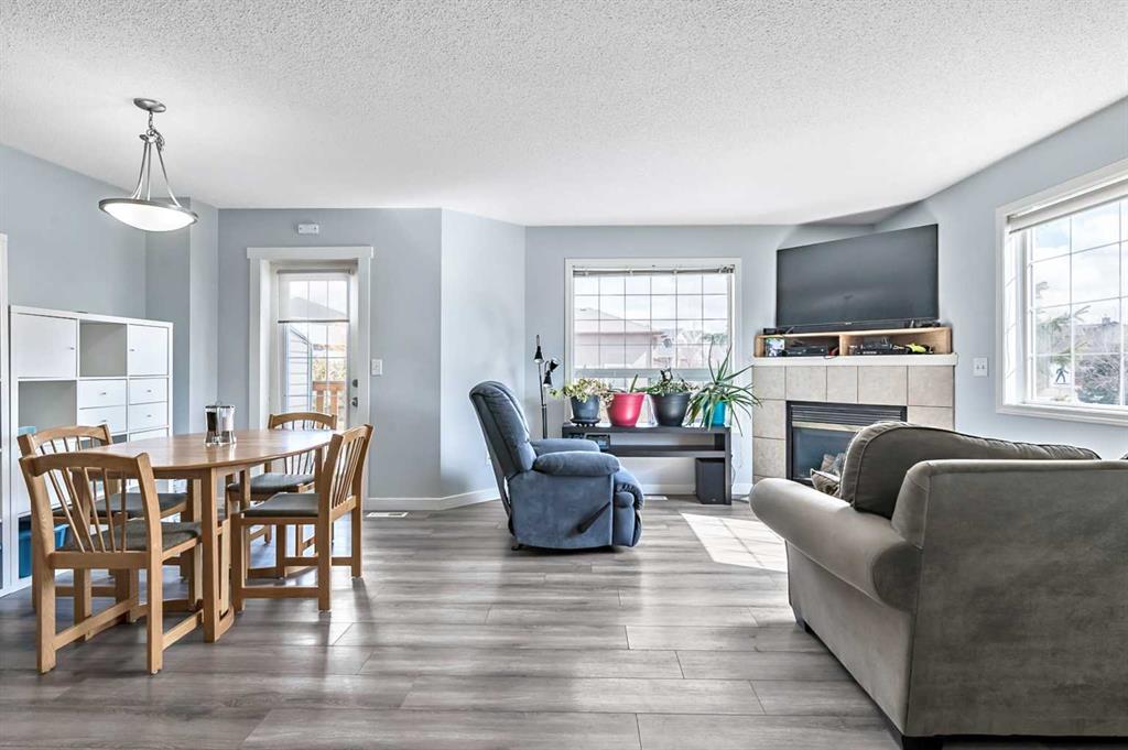 Welcome Home! This beautifully updated 1,342 sq. ft. two-storey townhome is located in the highly sought-after community of Canals in Airdrie. As an end unit backing onto a peaceful greenbelt and pathway system, this home offers both privacy and an abundance of natural light. Step inside to a spacious foyer that opens to a bright and inviting main floor, featuring brand new laminate flooring throughout. The kitchen has been tastefully refreshed with a new fridge, range, stylish backsplash, and plenty of cupboard and counter space—perfect for both everyday living and entertaining. The cozy family room is highlighted by a charming fireplace and large windows that flood the space with light. From here, step out onto your private deck—an ideal spot for BBQs and relaxing with friends. A renovated powder room completes the main level. Upstairs, you’ll find brand new carpet throughout, leading to two generously sized primary bedrooms and a versatile bonus area—perfect for a home office or reading nook. A well-appointed 4-piece bathroom is conveniently located between the bedrooms. The fully developed basement offers even more living space, including a large flex room that can easily serve as a bedroom, a laundry area with new washer and dryer, and an additional 4-piece bathroom.