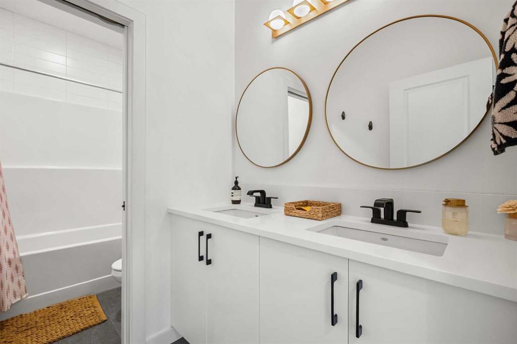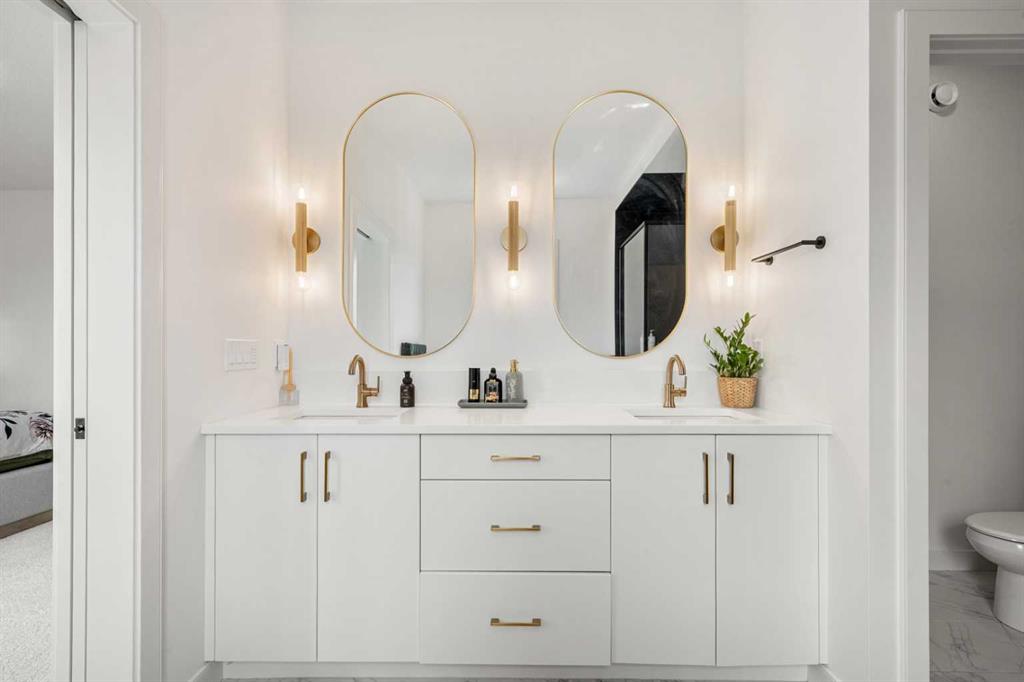 Upstairs, a generous family room offers a versatile space for relaxing, watching movies, or spending quiet evenings together. The upper level features three well-sized bedrooms, including a serene primary suite with a custom walk-in closet and a luxurious five-piece ensuite. The ensuite includes a standalone tub, a glass and tile shower, and dual vanities, creating a peaceful private retreat. Two additional bedrooms share a beautifully appointed five-piece bathroom, while waterproof carpeting throughout the level provides both durability and comfort.