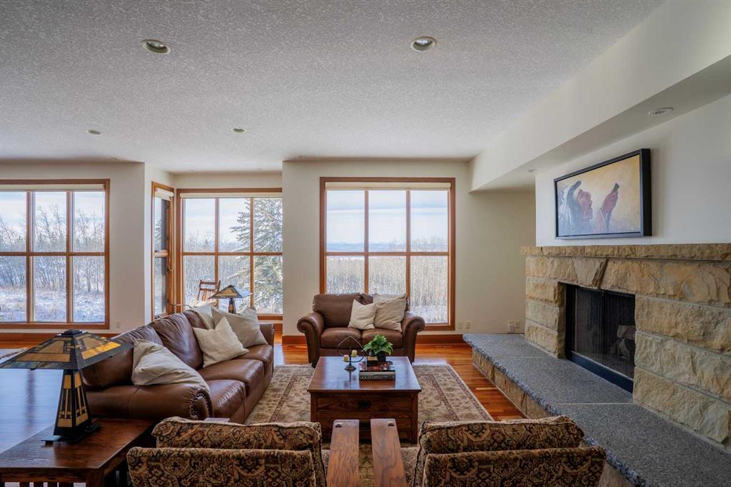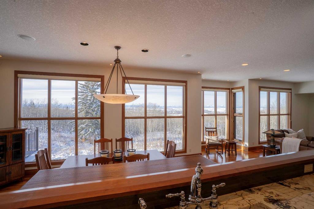 This exceptional, one-of-a-kind property offers the best of Springbank living — privacy, tranquillity, and breathtaking Rocky Mountain views. Set on a picturesque 2.17-acre lot in the heart of Pinnacle Ridge, this walkout bungalow sits high on the ridge, surrounded by beautifully landscaped grounds that provide seclusion from the street and neighbours. Tucked away from main roads, the property features its own private ravine, approximately one acre of mature trees and natural landscape, offering beauty and privacy while minimizing yard maintenance. A circular driveway flanked by mature trees sets the tone from the moment you arrive — this is truly something special. Inside, you’re greeted by stunning mountain vistas and an open layout. The beautifully renovated kitchen features a large island, granite countertops, and high-end appliances, including a Sub-Zero refrigerator, wine fridge, microwave, and 48” Wolf gas range. It opens to a bright dining space and sitting area with access to the large main deck (23′ x 22′). The spacious living room, complete with a fireplace, perfectly frames the magnificent mountain backdrop. The main-floor primary suite offers a luxurious six-piece ensuite and a generous walk-in closet. The main level also includes a home office, two powder rooms, a walk-in pantry, and a mudroom that connects to an oversized four-car garage. The 54′ x 26′ garage (1,279 sq. ft.) is insulated, drywalled, painted, and finished with epoxy flooring, with half the space offering a 12’3” ceiling that is ideal for large trucks or lifts. The walkout lower level features a large recreation room, a wet bar that seats up to ten, a dedicated theatre room, three additional bedrooms, and two full baths. Cherry hardwood and tile flooring flow throughout the home, with wool carpet in the lower-level bedrooms for added comfort. The exterior showcases stucco and stone, complemented by a newer asphalt shingle roof (2020, 50-year warranty). An enclosed under-deck storage room is ideal for garden tools or a ride-on mower. This immaculate property has been meticulously maintained by its current owners, with recent mechanical upgrades including two new furnaces with humidifiers (2019) and two new air-conditioning units (2024). A truly remarkable estate combining privacy, panoramic views, and refined living in one of Springbank’s most sought-after locations.