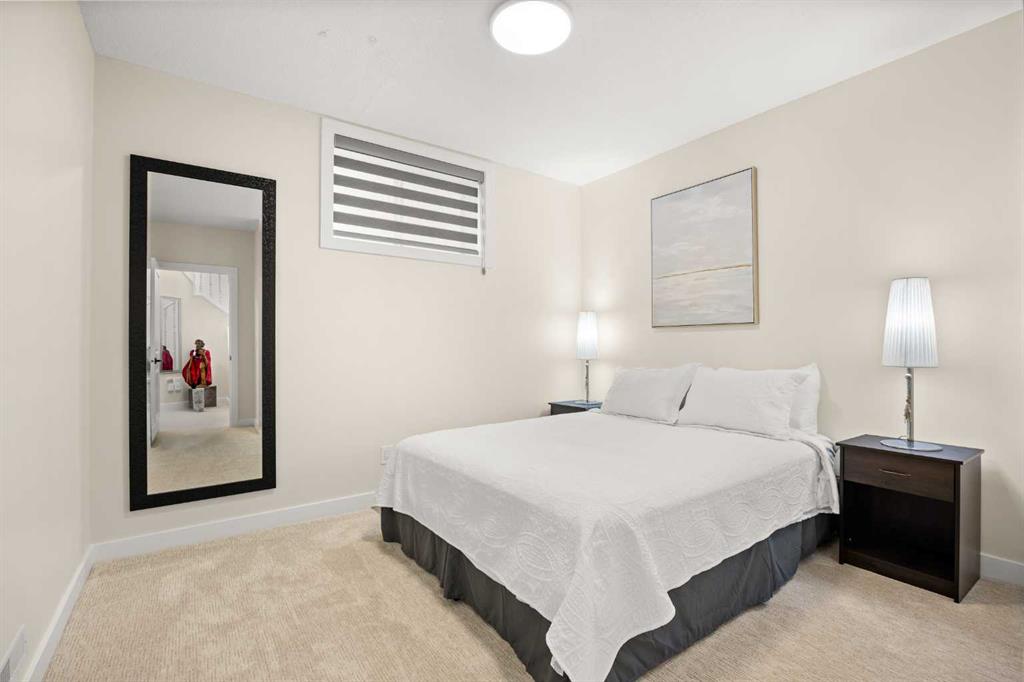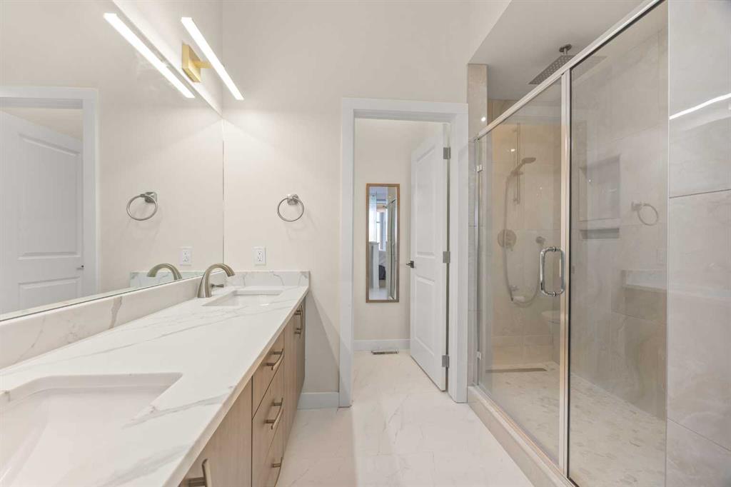 The main-floor Primary retreat offers a walk-in closet and a spa-inspired ensuite featuring a skylight, granite double vanity, free-standing soaker tub, and tiled shower. A second bedroom and full bathroom with tiled shower complete the main floor. The 9’ ceiling walk-out basement is beautifully finished with three additional bedrooms, two full bathrooms, and a large Recreation room with a wet bar. One bedroom functions as a second primary-style suite, complete with a walk-in closet and ensuite with double vanity and tiled shower, ideal for extended family or guests. Additional highlights include central air conditioning, two furnaces (new in 2024), two hot water tanks, PEX plumbing, clay tile roof, built-in ceiling speakers, custom blinds, NEST thermostats, and a main-floor laundry room. Walking distance to the golf course, schools, and transit, and minutes to shopping, LRT, and major routes—this exceptional home delivers the complete Hamptons lifestyle.