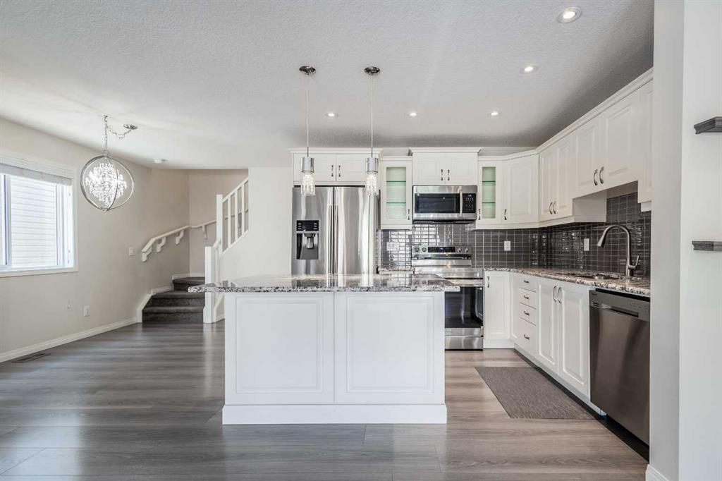 Step inside to a welcoming foyer, leading into a spacious and functional main floor layout. The kitchen is both stylish and practical, featuring a large island, granite countertops, stainless steel appliances, a glass tile backsplash, and generous cabinetry with a pantry. The dining and living areas connect seamlessly, creating an ideal space for everyday living and entertaining. A tiled mudroom, discreet half bath, and access to the heated, fully finished double garage complete the main level.