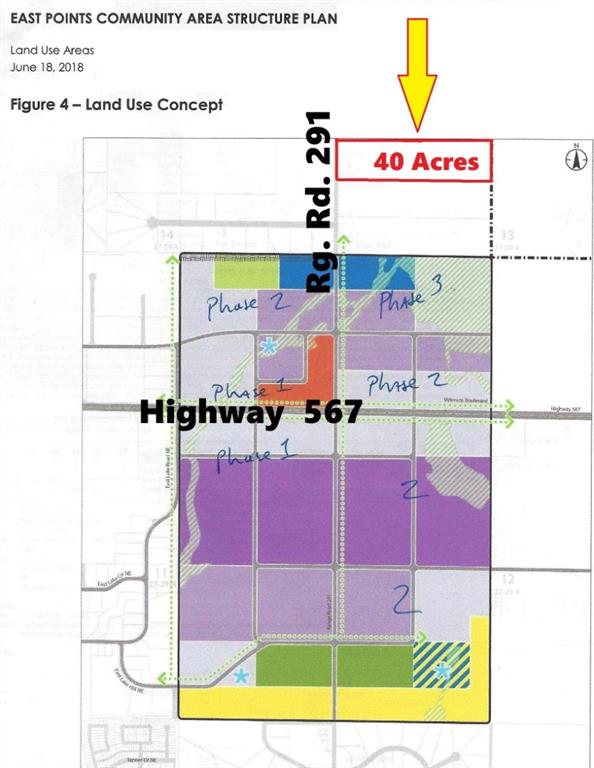 40 Acres on pavement INSIDE northeast Airdrie City Limits, north of the East Points Area Structure Plan and across from 185 acre Airdrie Regional Park and Croxford Estates. Permitted uses, Dwelling Garden Suite and other Permitted + Discretionary uses. Opportunity knocks! Panoramic West Views! 660 foot frontage onto paved Range Road 291 (future Airdrie main route). Ideal for home business (by permit), mini ranch or variety of permitted Garden Suite and discretionary uses. Features a 1,505 sq.ft. fully developed bungalow with heated oversize attached garage. Bright open plan with a spacious great room with vaulted ceiling and fireplace, formal dining area, and roomy kitchen with nook and covered deck access. Lower level is fully developed with bedroom, full bath, large den, and spacious living area. Includes major appliances and window coverings. Ideal for animals or home business with detached heated 28′ x 30′ shop with box stalls and 10′ x 25′ storage shop. Highway 2 north, east on Highway 567, north on paved Range Road 291. Cabin in back trees also for sale. GST may be applicable.