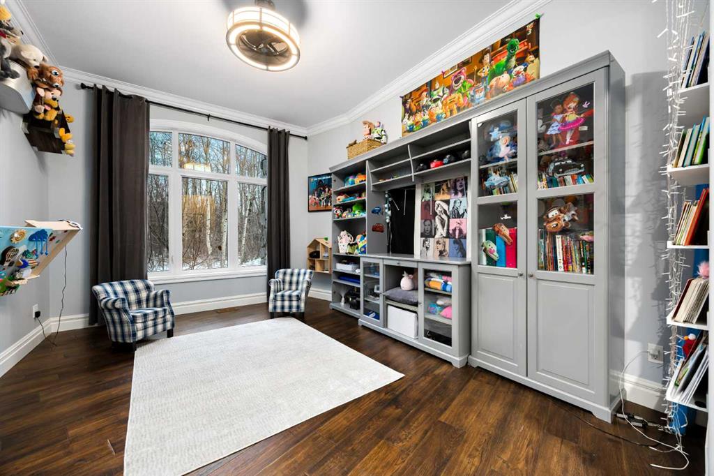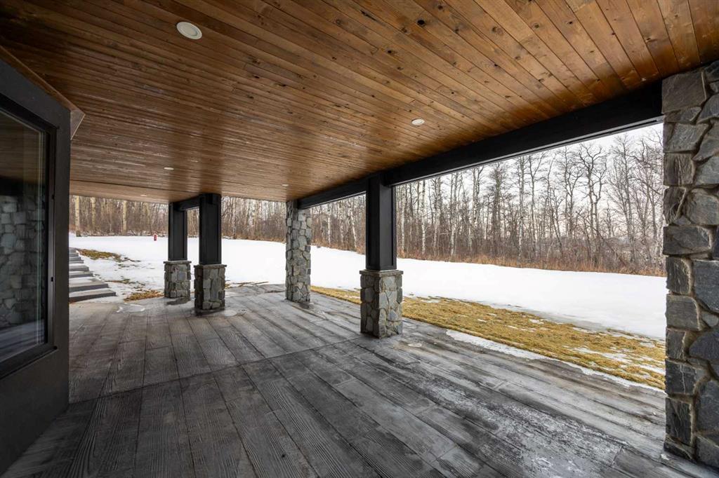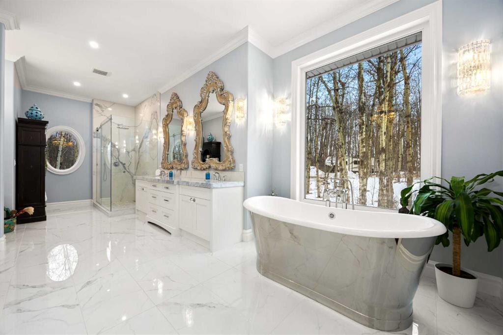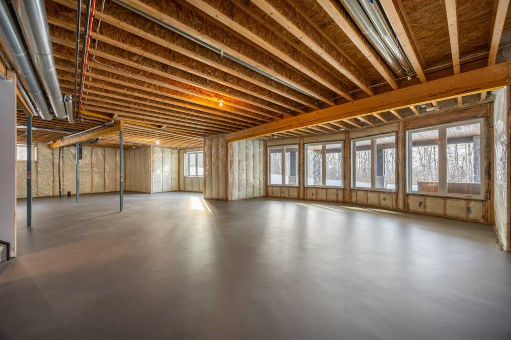 The primary suite offers a retreat within the home. Enter through double doors to a serene space warmed by a gas fireplace framed in sandblasted Italian marble, with windows overlooking the aspen canopy beyond. The ensuite feels reminiscent of a private spa, finished in marble tile with a deep soaker tub beside an oversized picture window, a walk-in glass-enclosed shower, dual vanities, and an expansive walk-in closet with illuminated built-in cabinetry. Direct access to the stunning covered rear deck invites relaxed moments outdoors beneath open prairie skies—an inviting place to unwind and take in the surrounding landscape. The walkout lower level presents an opportunity to expand the estate further, offering ten-foot ceilings, rough-ins for three additional bathrooms, a separate furnace, and access to a stamped concrete patio with pine ceiling and recessed lighting. A dedicated podcast studio is already in place, ideal for entrepreneurs, executives, or creators seeking a private professional space at home.