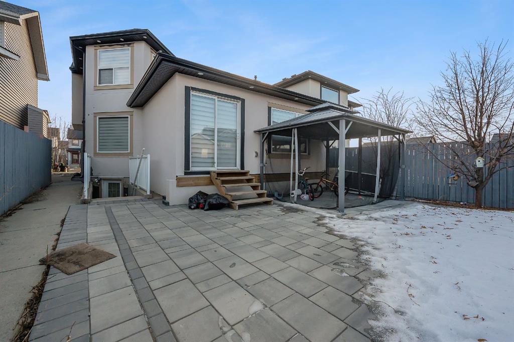 Fully renovated two-storey home located in the desirable community of Saddle Ridge. Situated in a quite cal-du-sac close to Freshco, Shoppers, 80th ave plaza and other amenties. The main level showcases engineered hardwood flooring, a dining area with a gas fireplace, and a well-appointed kitchen featuring gloss cabinetry and quartz countertop. A spacious living room with electric fireplace for family gatherings. Concrete patio perfect for summer entertaining overlooking a fully fenced backyard with area ideal for children and pets. Upstairs offers a comfortable bonus room, a full bathroom, and 3 bedrooms, including a generous primary bedroom complete with a walk-in closet and a private ensuite with steam shower. The fully developed basement includes an illegal suite with a large family room, a well-sized bedroom, and a full tiled bathroom. Additional highlights include a poured concrete pad extending from the front to the back of the home, a backyard patio, over 40 exterior pot lights, security cameras and a large concrete driveway at the front accommodating up to three vehicles.
