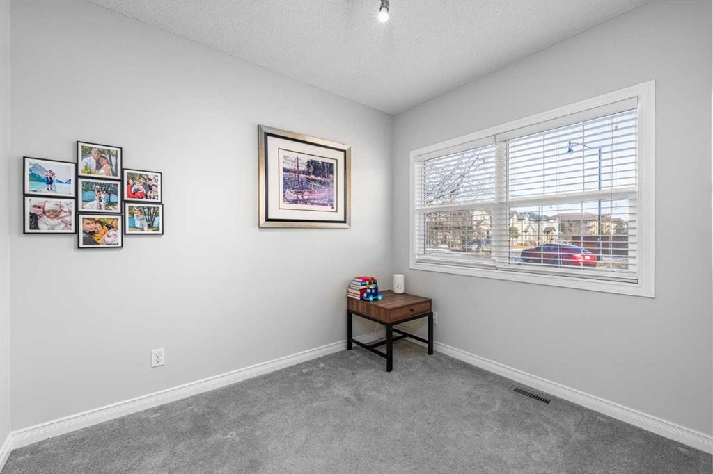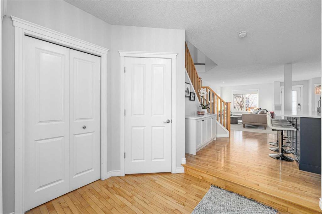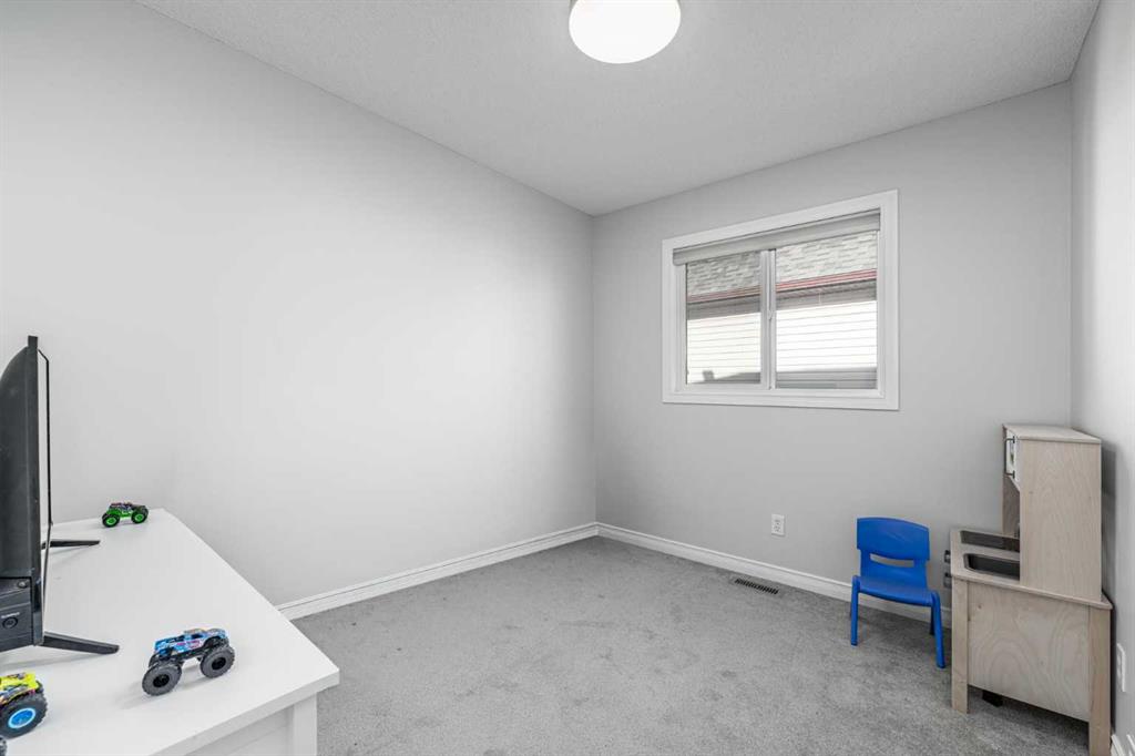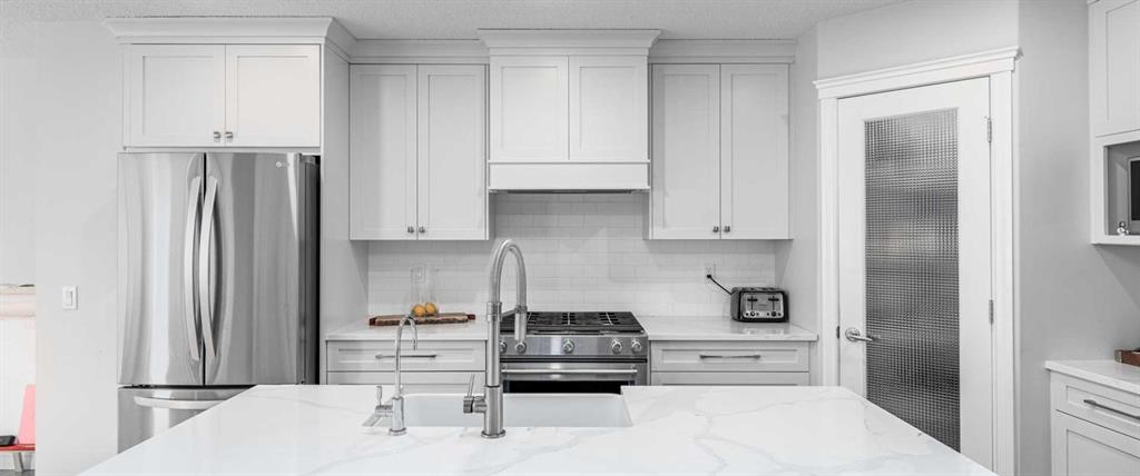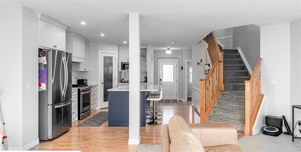 Inside, the home features a bright, functional main floor with a cozy living room and gas fireplace, a front den ideal for a home office, and a fully renovated kitchen complete with quartz countertops, stainless steel appliances, a 5-burner gas stove, oversized island with extra storage, and a corner pantry. Upstairs offers a spacious bonus room, two additional bedrooms, a full bathroom, and a comfortable primary retreat with mountain views, walk-in closet, and ensuite. The basement is drywalled and ready for future development or added storage.