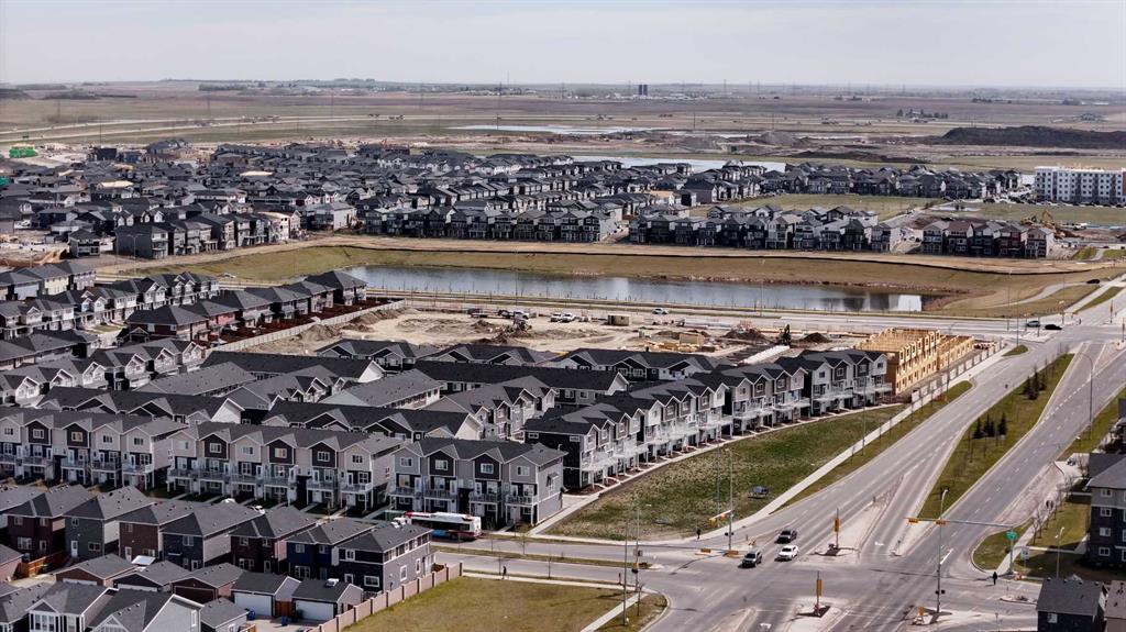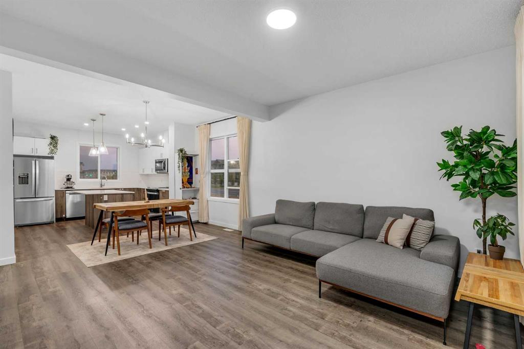 Welcome to this rare 2024-built corner-unit townhome in the family-friendly community of Redstone, offering 1,577.66 sq ft above grade. This home is part of a 4-plex block, a valuable feature in this development where many other buildings are 5-plex layouts—resulting in fewer shared walls and a more private, quieter living experience. Positioned toward the rear of the project, the home enjoys reduced traffic and a peaceful residential setting. The main level includes a spacious foyer, a versatile office/den, a utility room, and direct access to the double attached garage. The second floor features a bright, open layout with a generous living room, dedicated dining area, and a functional kitchen with pantry and great counter space, along with a convenient 2-piece bathroom.