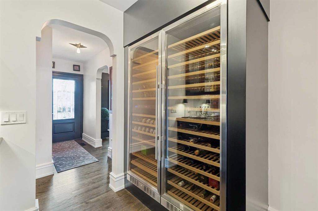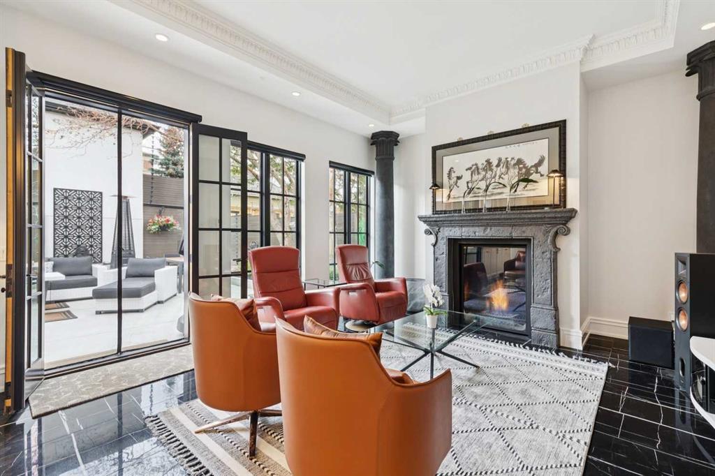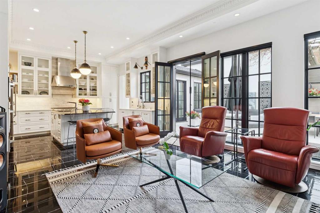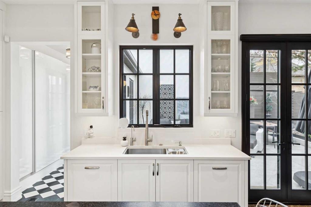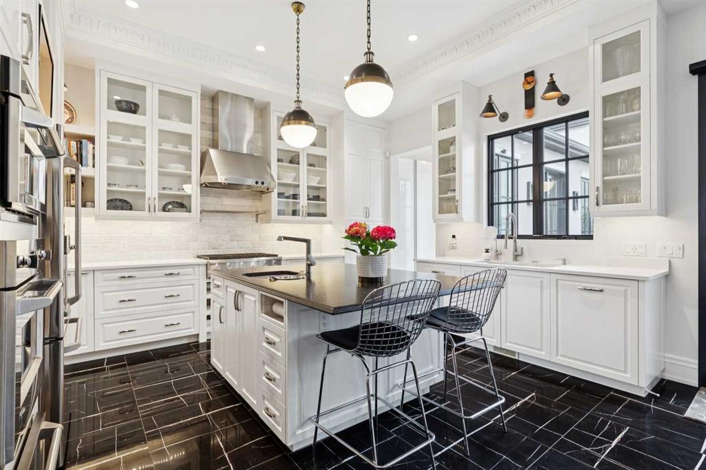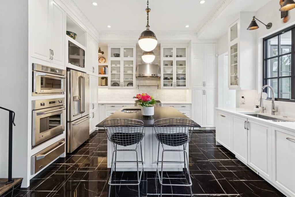 The moment you step into this home it captures your FULL attention, and you remain spellbound even after you leave. The main floor offers an intimate, formal living room featuring a gas fireplace, surrounded by beautiful custom-built cabinetry that is immediately adjacent to the equally intimate formal dining room. An inviting guest bedroom and cozy study are separated by a 3 pc. bathroom featuring a large shower and elegant mosaic marble tile work. The butler’s pantry, conveniently located beside the dining room, features custom millwork housing two stemware dishwashers and side-by-side wine refrigerators for 380 bottles. Just three steps down and you’ll enter the addition including a stunning, sun-soaked kitchen and great room. The amazing, fully enclosed courtyard extends the living space seamlessly into the exterior while maintaining perfect privacy AND it is the ultimate in low maintenance! The great room boasts gleaming tile floors and pillars bracketing a very large gas fireplace. The kitchen is a dream offering: extensive quartz and leathered granite working surfaces, 10 ft. high custom cabinetry with slide out pantry drawers, premium GE monogram appliances including a speed oven, an infrared heating tray over the 6-burner range, warming drawer, professional Franke sinks with built in colanders. A black-and-white tiled floor runs down the breezeway connecting the house and the detached garage with 21 feet of exceptional built-in storage hidden behind glossy white cabinetry.