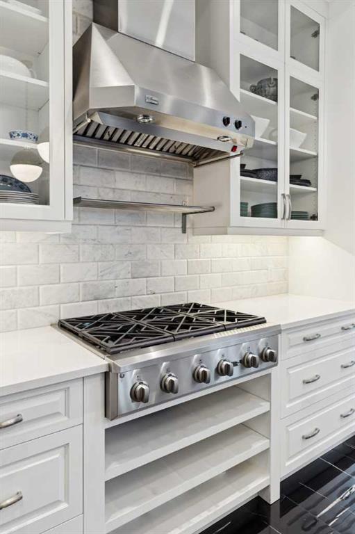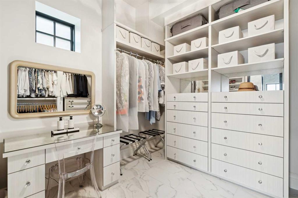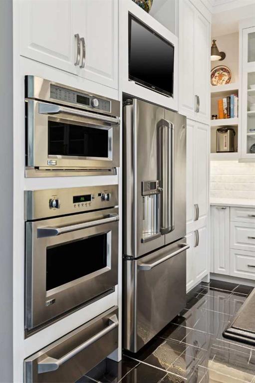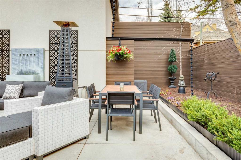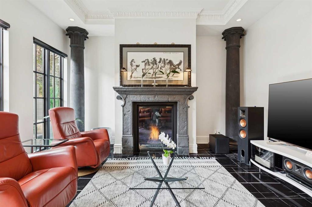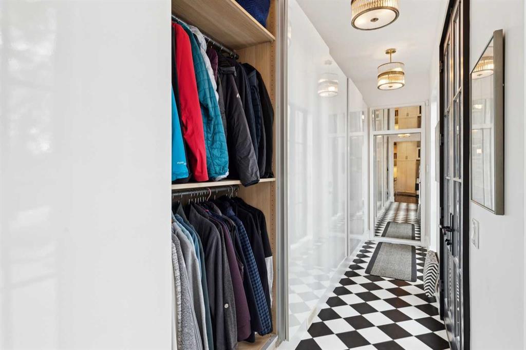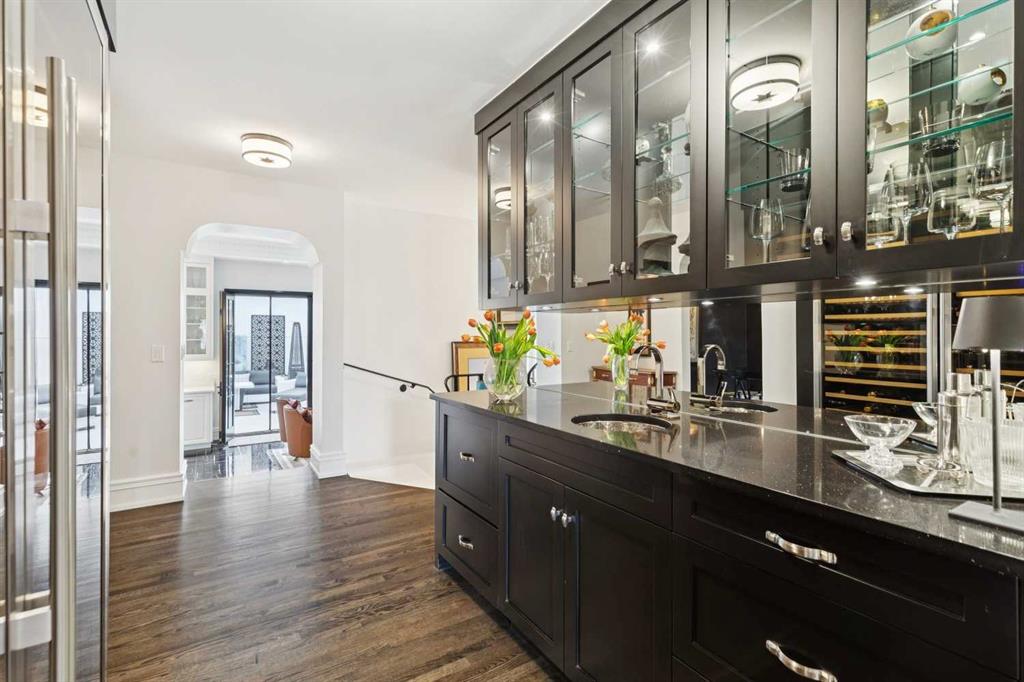 The moment you step into this home it captures your FULL attention, and you remain spellbound even after you leave. The main floor offers an intimate, formal living room featuring a gas fireplace, surrounded by beautiful custom-built cabinetry that is immediately adjacent to the equally intimate formal dining room. An inviting guest bedroom and cozy study are separated by a 3 pc. bathroom featuring a large shower and elegant mosaic marble tile work. The butler’s pantry, conveniently located beside the dining room, features custom millwork housing two stemware dishwashers and side-by-side wine refrigerators for 380 bottles. Just three steps down and you’ll enter the addition including a stunning, sun-soaked kitchen and great room. The amazing, fully enclosed courtyard extends the living space seamlessly into the exterior while maintaining perfect privacy AND it is the ultimate in low maintenance! The great room boasts gleaming tile floors and pillars bracketing a very large gas fireplace. The kitchen is a dream offering: extensive quartz and leathered granite working surfaces, 10 ft. high custom cabinetry with slide out pantry drawers, premium GE monogram appliances including a speed oven, an infrared heating tray over the 6-burner range, warming drawer, professional Franke sinks with built in colanders. A black-and-white tiled floor runs down the breezeway connecting the house and the detached garage with 21 feet of exceptional built-in storage hidden behind glossy white cabinetry.