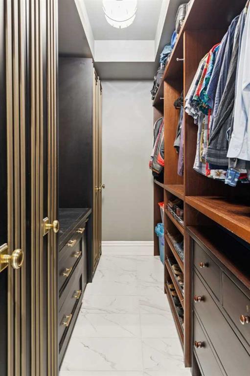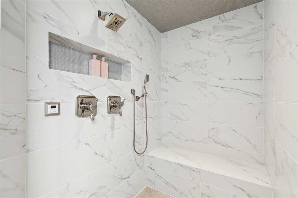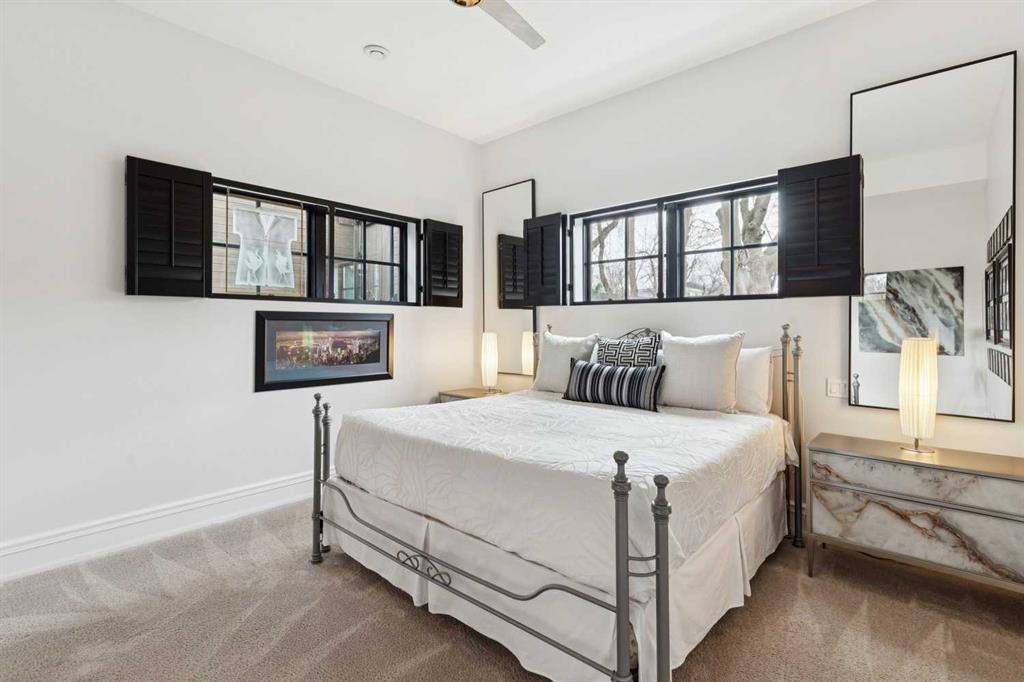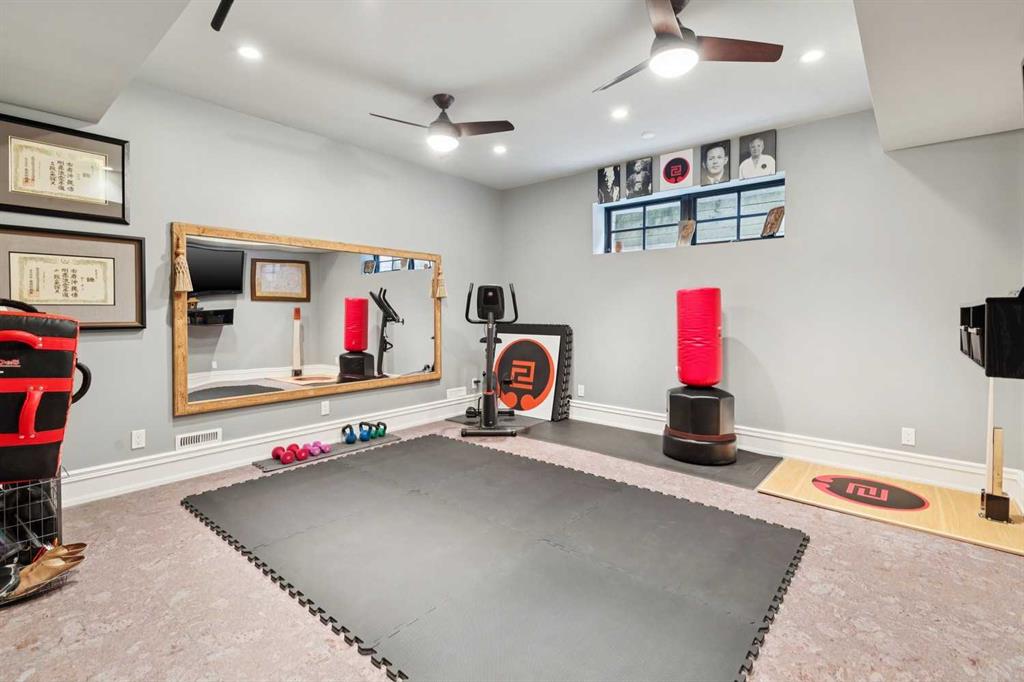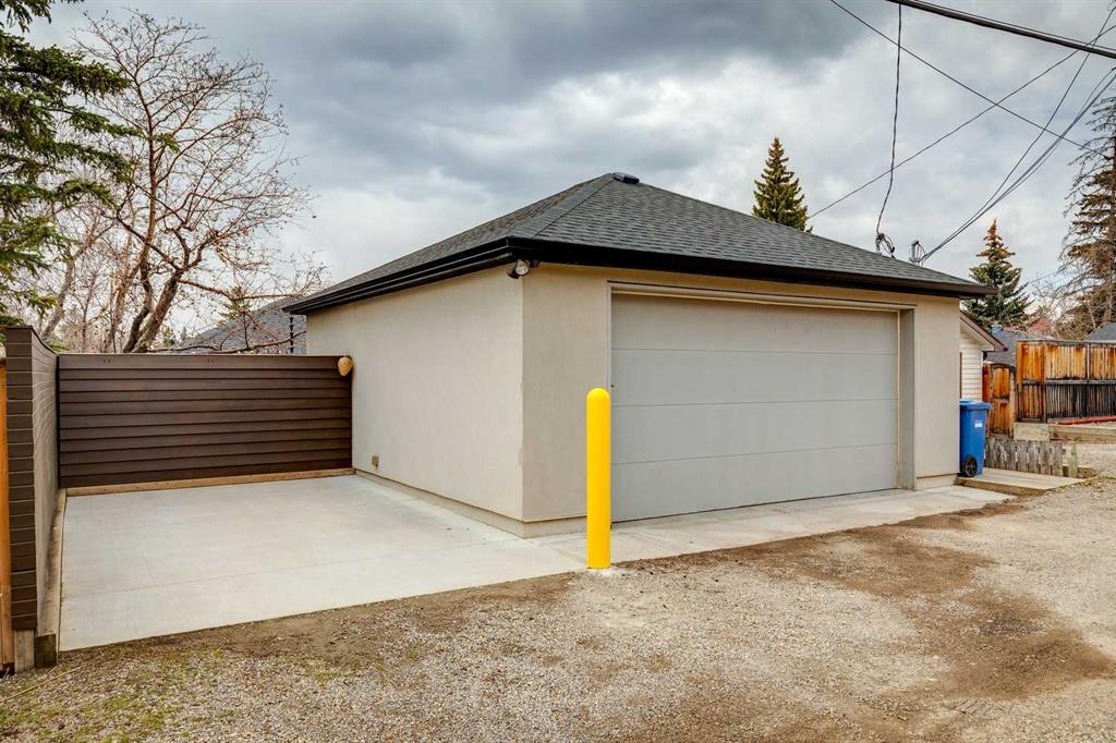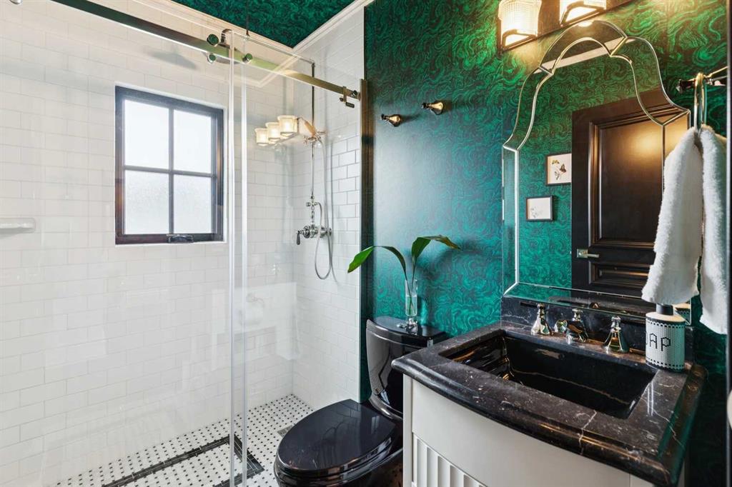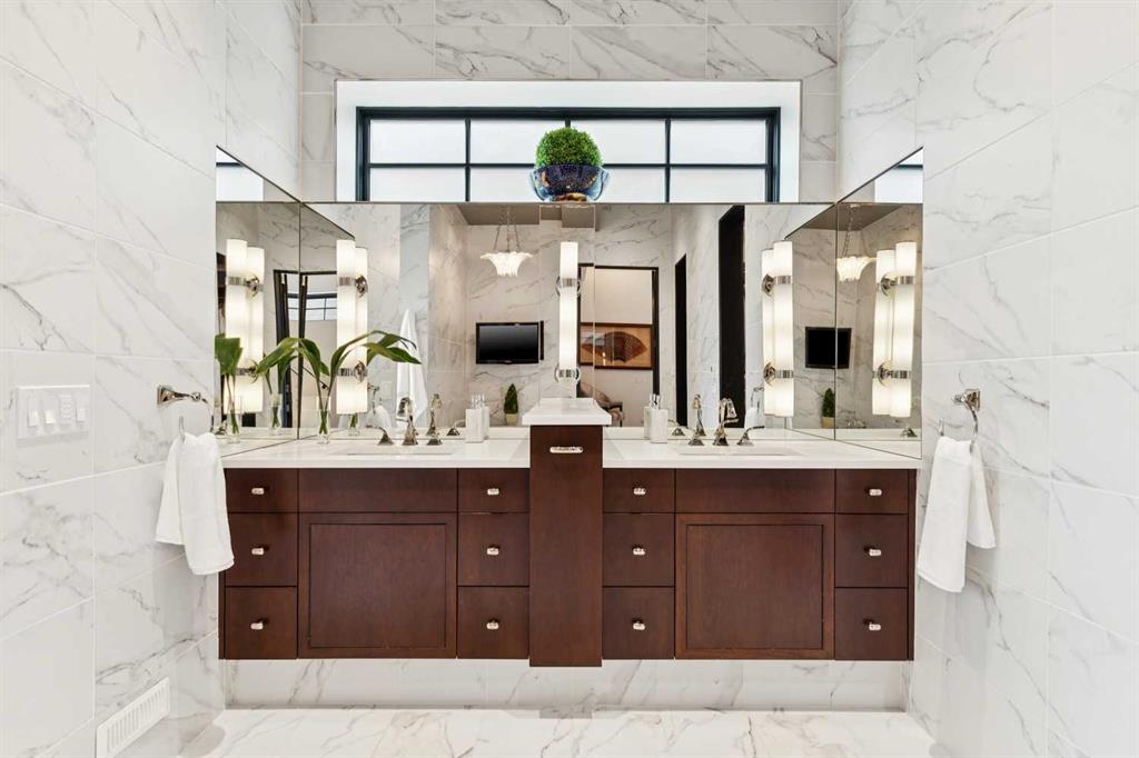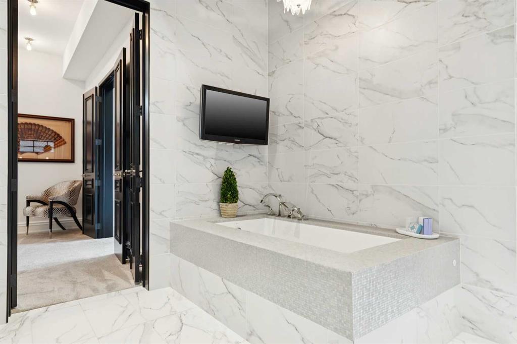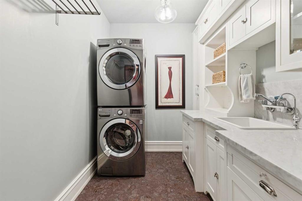 The lower level of this home, accessed by the beautifully curved rod iron staircase, has 11 ft. ceilings throughout. The principal bedroom and spa-inspired ensuite enjoy the utmost privacy! The spacious ensuite bathroom contains his and her vanities, a large steam shower with double showerheads, a heated bathtub with TV and his and her dressing rooms equipped with custom 10ft cabinetry. An open gallery leads to the full gym with cork flooring and pure Kinetico filtered drinking water. The laundry room, with marble countertops and custom cabinets, together with the utility room complete the lower level. The rear laneway leads to a double heated attached garage with oodles of custom storage and epoxy flooring, plus a concrete parking pad, providing parking for 3 vehicles.