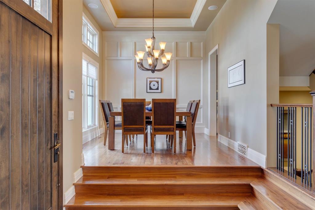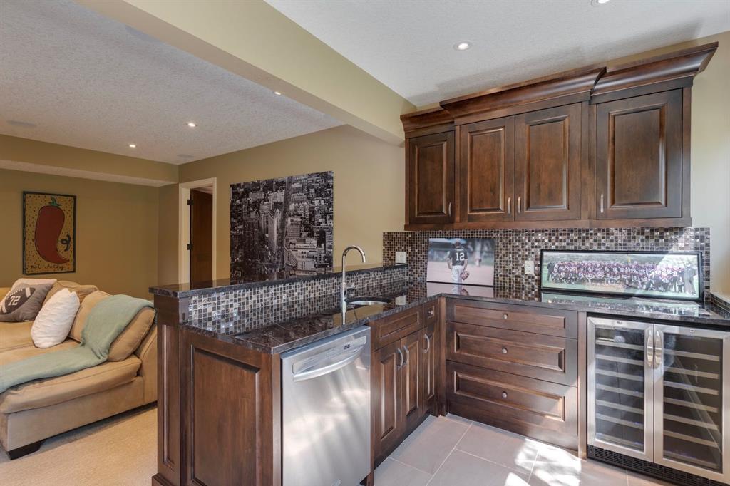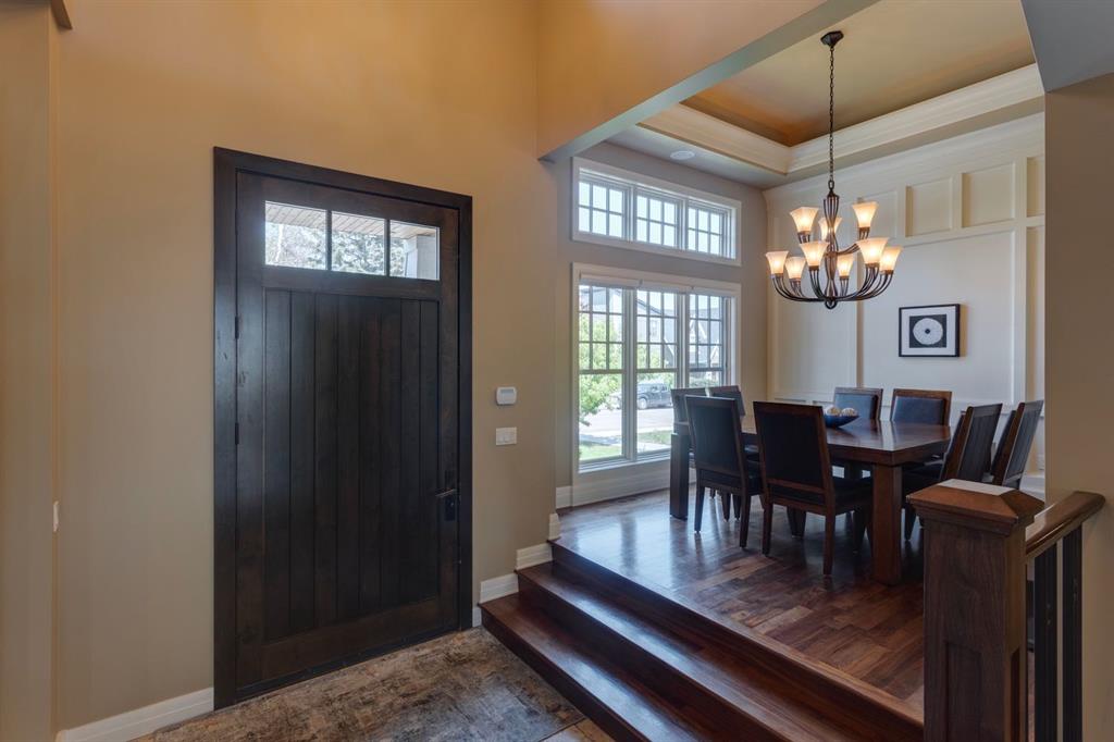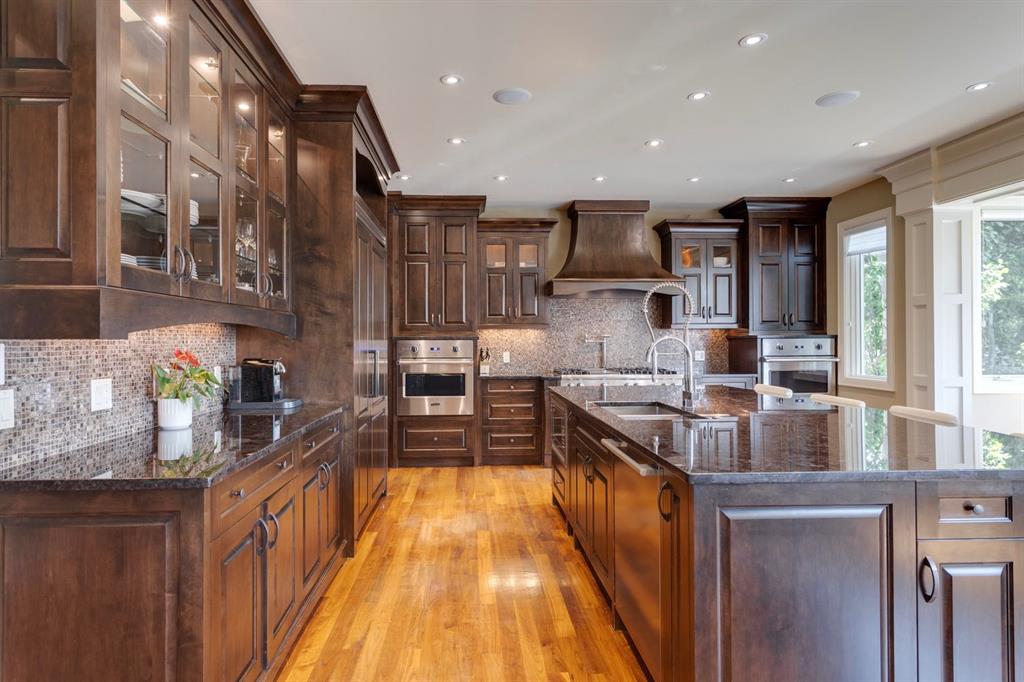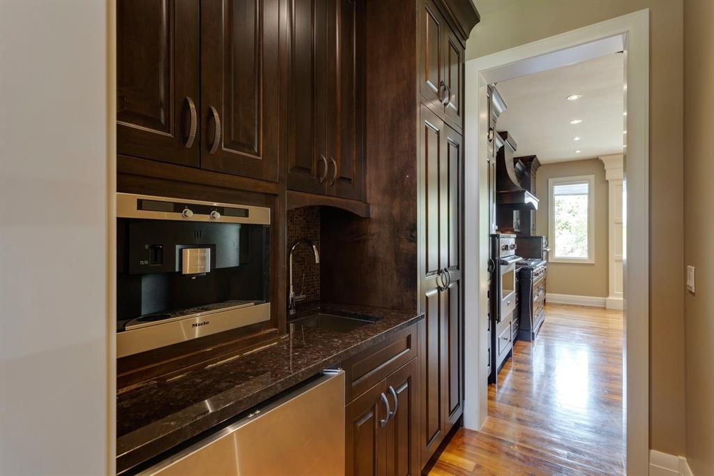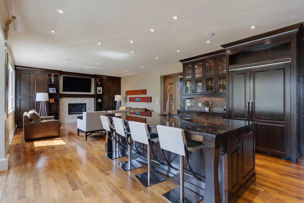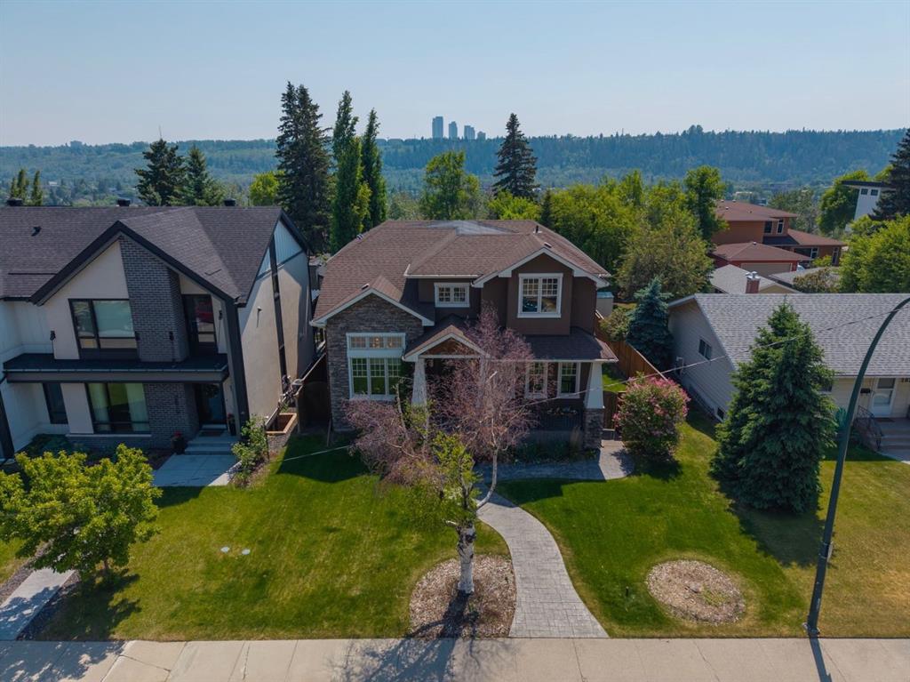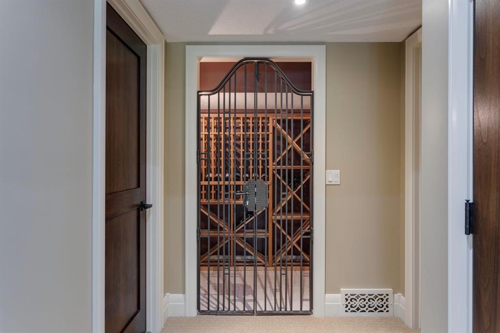 Welcome to this exquisite custom-built residence by Tribeca Homes, ideally positioned on a 55′ south-facing walk-up lot in the prestigious St. Andrews Heights. From the moment you arrive, the captivating curb appeal and charming front porch invite you to envision tranquil evenings at home. Step inside to soaring ceilings and impeccable craftsmanship, highlighted by over 4,090 sq ft of meticulously developed living space. Featuring site-finished walnut hardwood floors, solid core doors, detailed millwork, and elegant coffered ceilings, this home blends luxury with warmth. The grand travertine-tiled foyer impresses with a dramatic 19′ ceiling. French doors reveal a private home office adorned with custom built-ins and maple crown molding. The formal dining room offers paneled walls, a picture window, and a recessed ceiling detail — perfect for entertaining. The gourmet kitchen is a chef’s dream, outfitted with rich maple cabinetry, a massive 9’ granite island, and premium appliances including a Viking 6-burner gas cooktop with griddle, dual Viking wall ovens, Miele dishwasher, and a panelled fridge. A butler’s pantry connects the kitchen to the dining room, featuring a built-in Miele espresso machine and wine cooler. Adjacent, a bright breakfast nook opens to a raised south-facing deck — ideal for alfresco dining. The spacious living room is bathed in natural light and anchored by a stone-surround gas fireplace with custom built-ins, creating a warm, inviting atmosphere. Upstairs, a generous landing overlooks the foyer and leads to three large bedrooms, each with ensuite access. The luxurious primary suite is a private retreat, complete with a cozy sitting area, gas fireplace, Juliet balcony with treetop views, custom walk-in closet, and an opulent 6-piece ensuite featuring heated floors, dual vanities, a jetted tub, and steam shower. The fully developed walk-up lower level is designed for entertaining and relaxation, boasting a large family/media room with a gas fireplace, an elegant wet bar with raised granite counters, bar fridge, and dishwasher, plus a show-stopping wine cellar with cedar shelving for 400 bottles, enclosed by wrought iron gates. This level also includes a spacious bedroom, full bath, and a versatile flex room with cork flooring — ideal as a gym or studio. Outside, enjoy a spacious backyard with lush green space and a triple detached garage. A covered patio offers a welcoming space for additional seating or a hot tub. Don’t miss this rare opportunity to own a stunning, custom home in one of Calgary’s most sought-after communities!