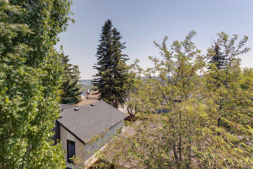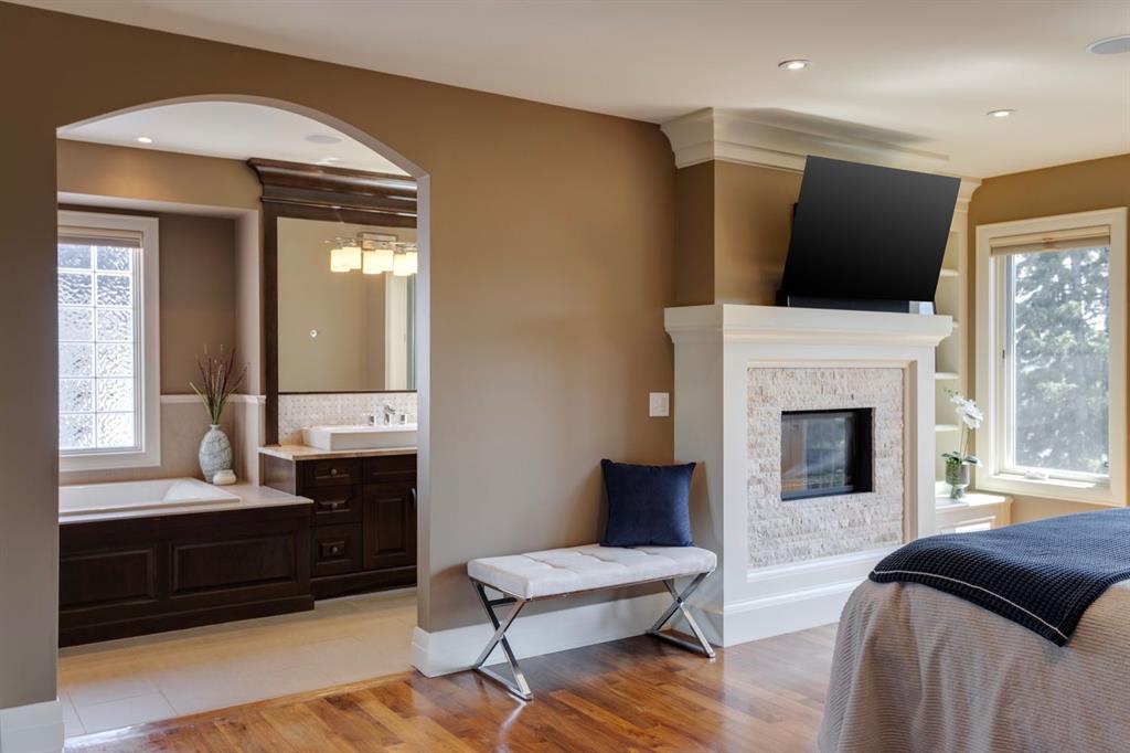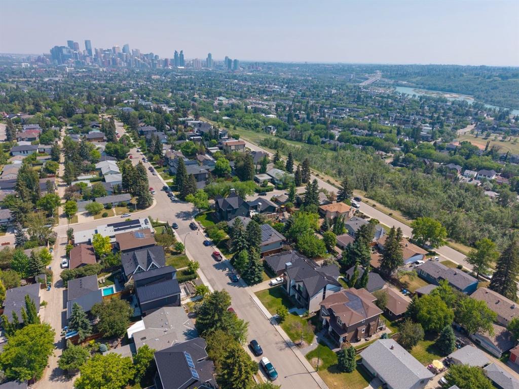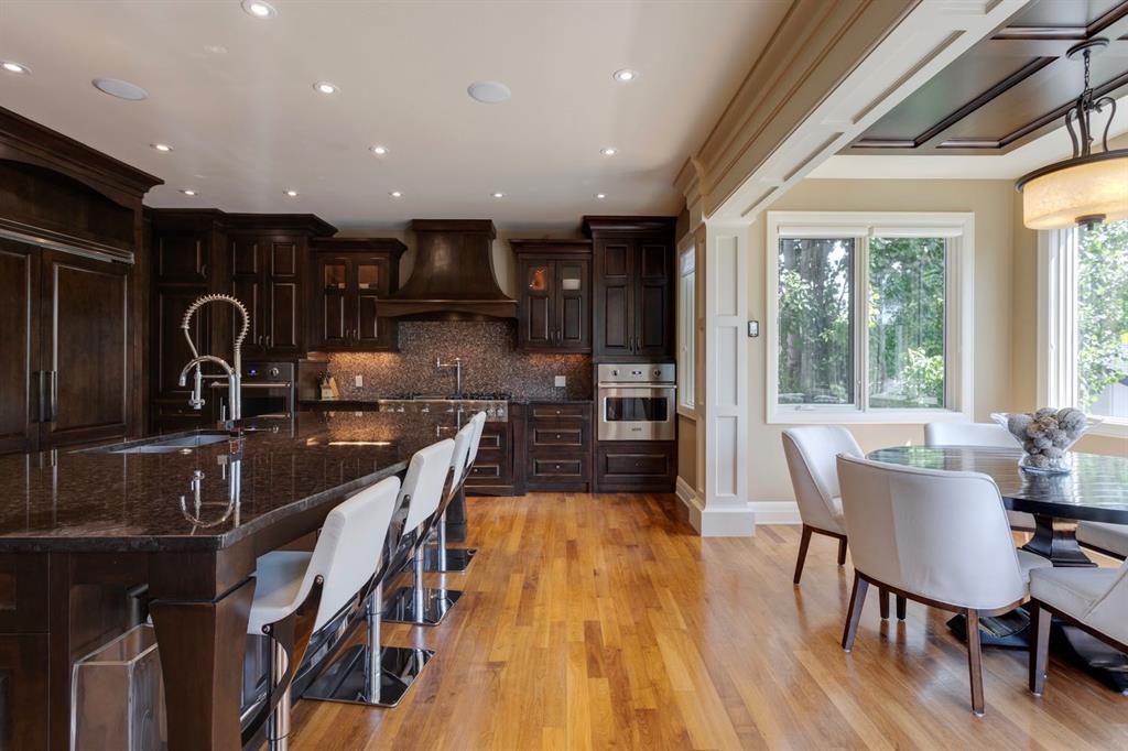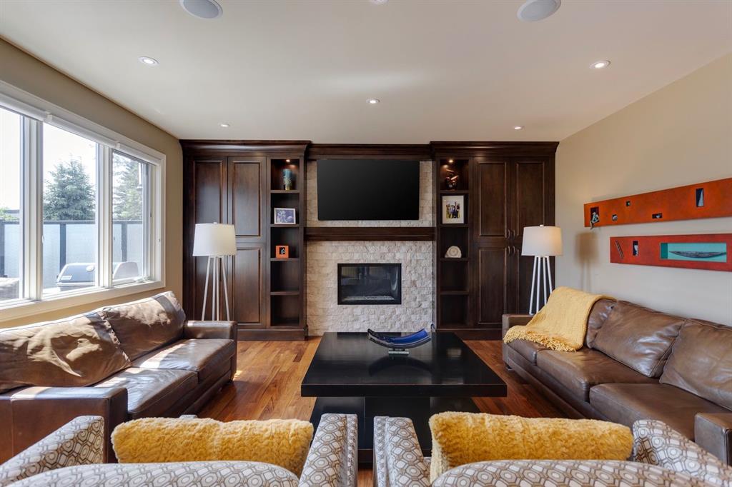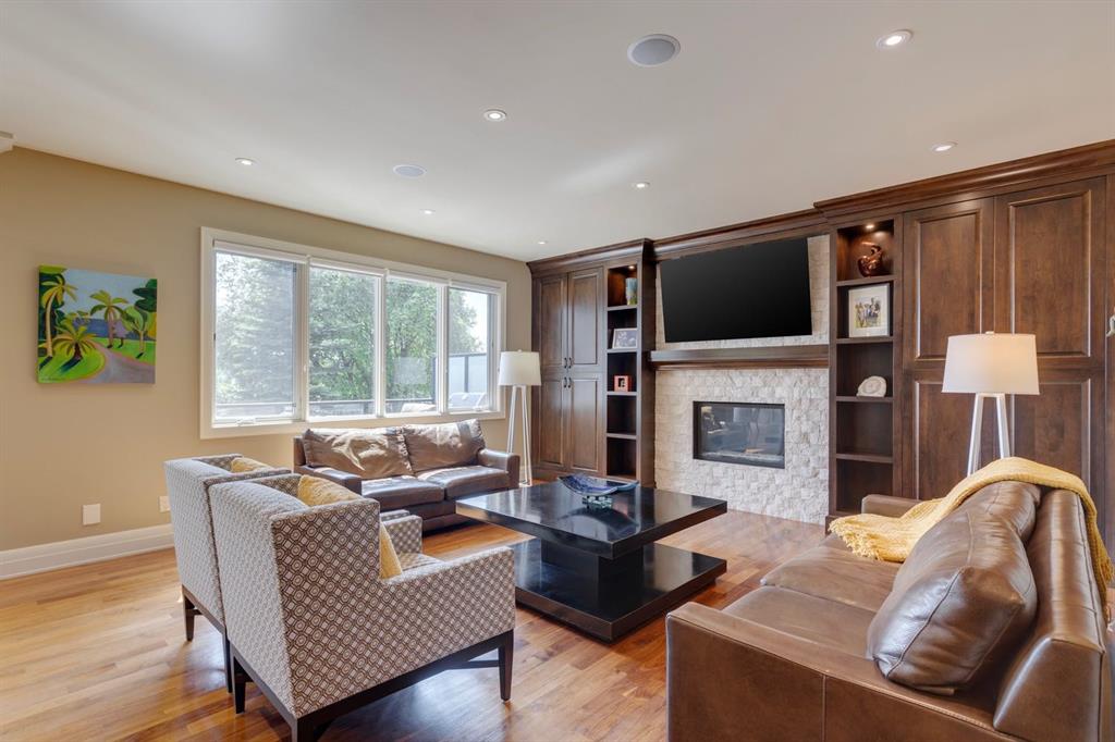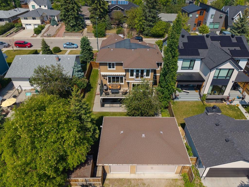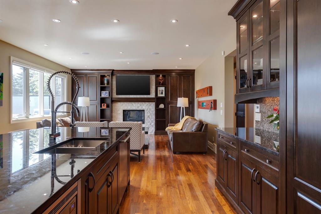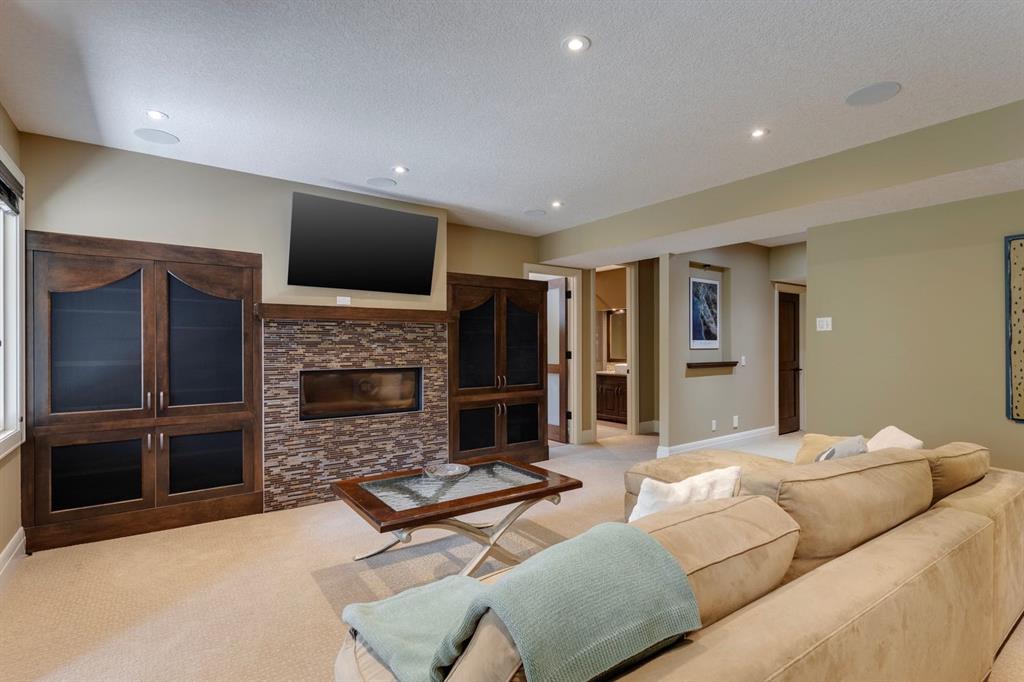 Welcome to this exquisite custom-built residence by Tribeca Homes, ideally positioned on a 55′ south-facing walk-up lot in the prestigious St. Andrews Heights. From the moment you arrive, the captivating curb appeal and charming front porch invite you to envision tranquil evenings at home. Step inside to soaring ceilings and impeccable craftsmanship, highlighted by over 4,090 sq ft of meticulously developed living space. Featuring site-finished walnut hardwood floors, solid core doors, detailed millwork, and elegant coffered ceilings, this home blends luxury with warmth. The grand travertine-tiled foyer impresses with a dramatic 19′ ceiling. French doors reveal a private home office adorned with custom built-ins and maple crown molding. The formal dining room offers paneled walls, a picture window, and a recessed ceiling detail — perfect for entertaining. The gourmet kitchen is a chef’s dream, outfitted with rich maple cabinetry, a massive 9’ granite island, and premium appliances including a Viking 6-burner gas cooktop with griddle, dual Viking wall ovens, Miele dishwasher, and a panelled fridge. A butler’s pantry connects the kitchen to the dining room, featuring a built-in Miele espresso machine and wine cooler. Adjacent, a bright breakfast nook opens to a raised south-facing deck — ideal for alfresco dining. The spacious living room is bathed in natural light and anchored by a stone-surround gas fireplace with custom built-ins, creating a warm, inviting atmosphere. Upstairs, a generous landing overlooks the foyer and leads to three large bedrooms, each with ensuite access. The luxurious primary suite is a private retreat, complete with a cozy sitting area, gas fireplace, Juliet balcony with treetop views, custom walk-in closet, and an opulent 6-piece ensuite featuring heated floors, dual vanities, a jetted tub, and steam shower. The fully developed walk-up lower level is designed for entertaining and relaxation, boasting a large family/media room with a gas fireplace, an elegant wet bar with raised granite counters, bar fridge, and dishwasher, plus a show-stopping wine cellar with cedar shelving for 400 bottles, enclosed by wrought iron gates. This level also includes a spacious bedroom, full bath, and a versatile flex room with cork flooring — ideal as a gym or studio. Outside, enjoy a spacious backyard with lush green space and a triple detached garage. A covered patio offers a welcoming space for additional seating or a hot tub. Don’t miss this rare opportunity to own a stunning, custom home in one of Calgary’s most sought-after communities!