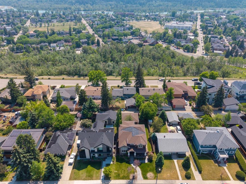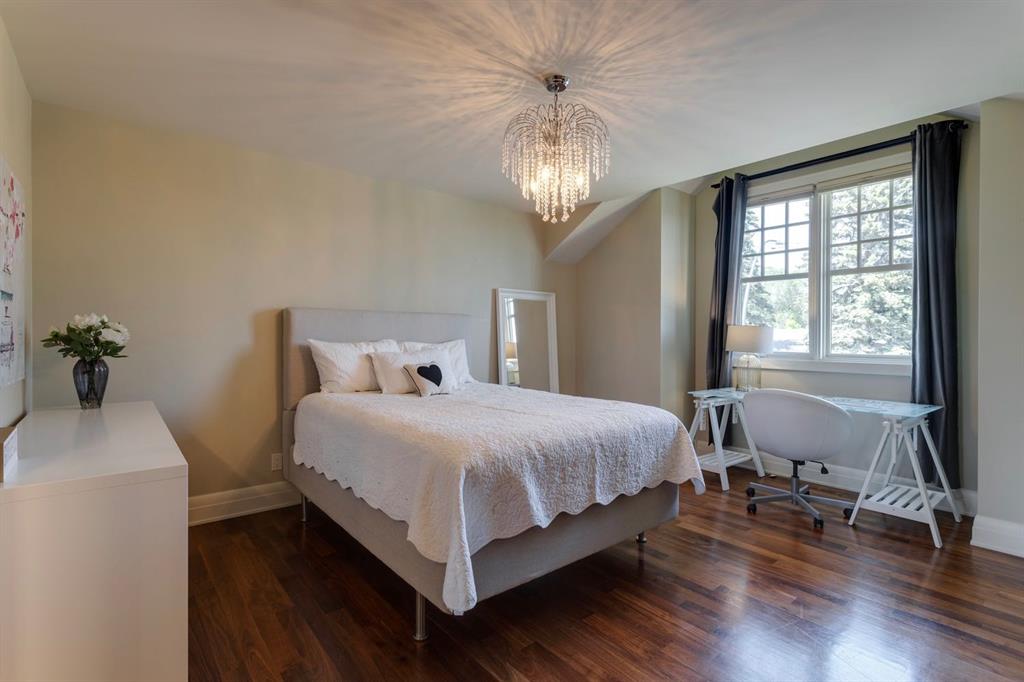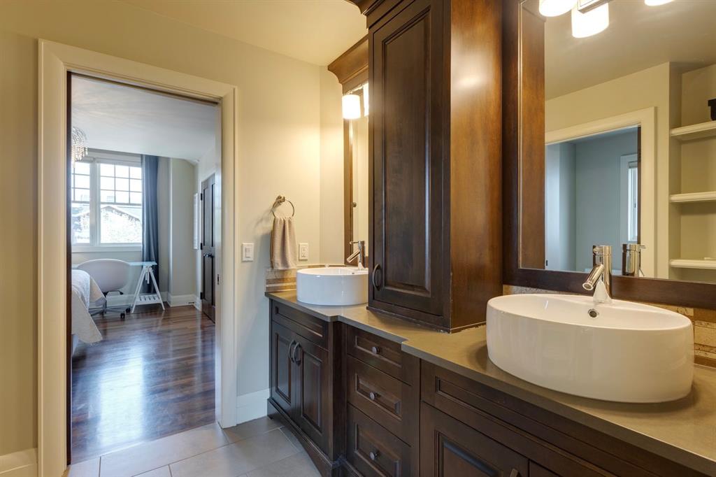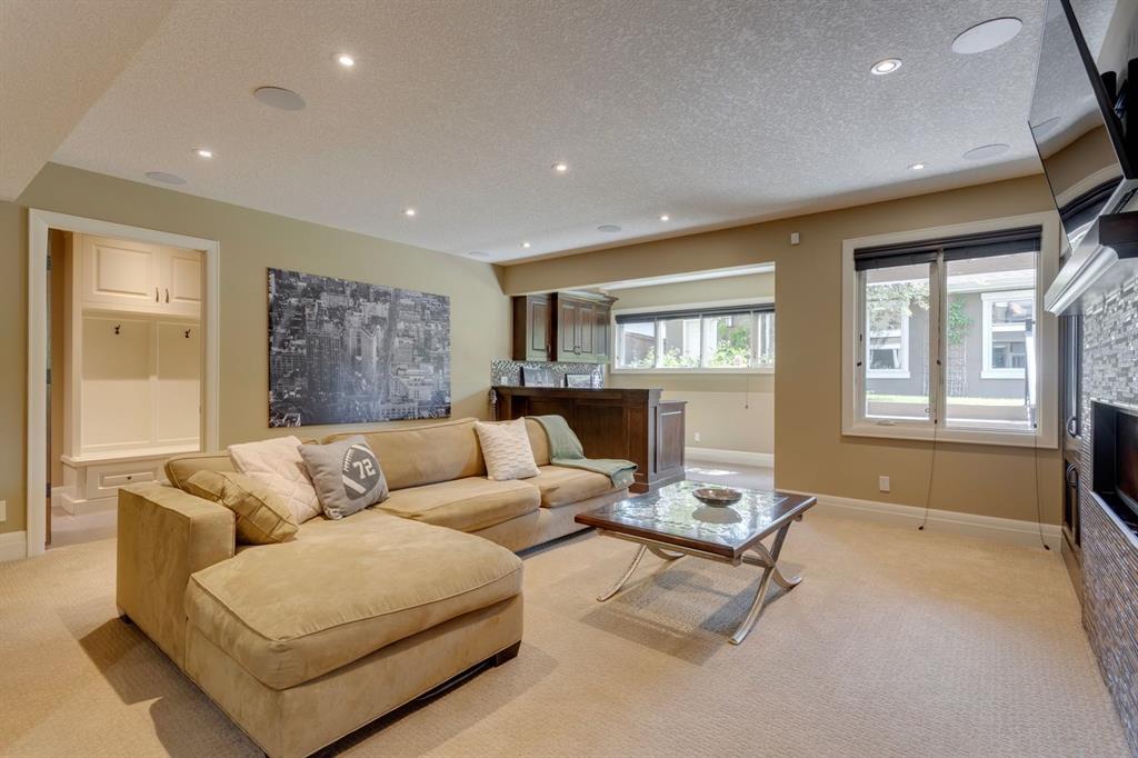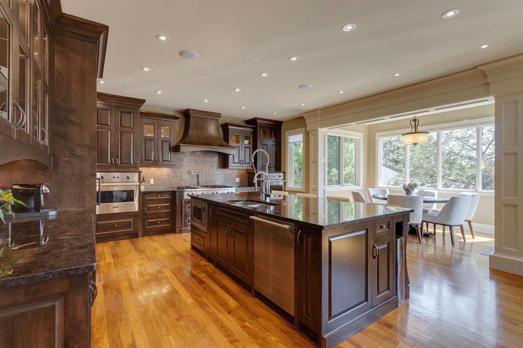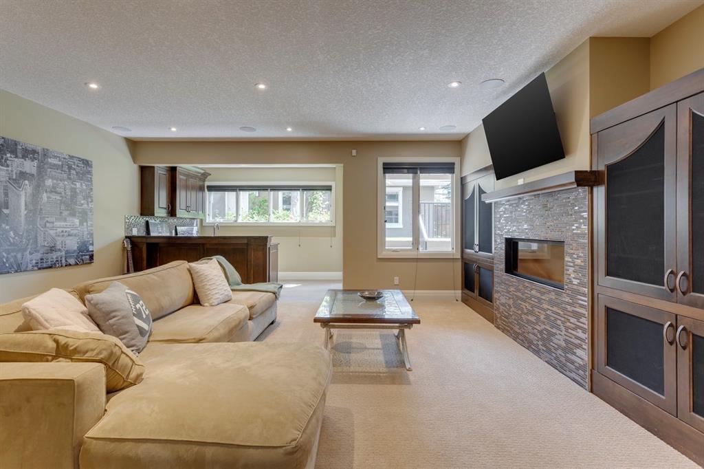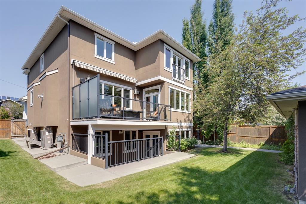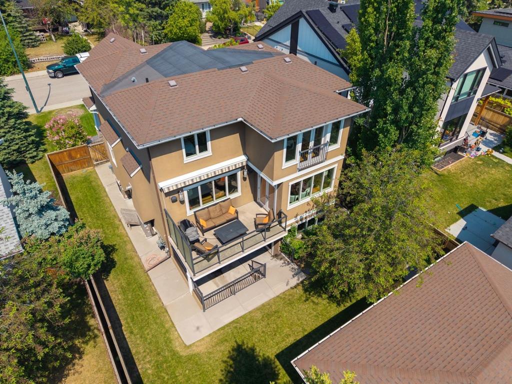 Welcome to this exquisite custom-built residence by Tribeca Homes, ideally positioned on a 55′ south-facing walk-up lot in the prestigious St. Andrews Heights. From the moment you arrive, the captivating curb appeal and charming front porch invite you to envision tranquil evenings at home. Step inside to soaring ceilings and impeccable craftsmanship, highlighted by over 4,090 sq ft of meticulously developed living space. Featuring site-finished walnut hardwood floors, solid core doors, detailed millwork, and elegant coffered ceilings, this home blends luxury with warmth. The grand travertine-tiled foyer impresses with a dramatic 19′ ceiling. French doors reveal a private home office adorned with custom built-ins and maple crown molding. The formal dining room offers paneled walls, a picture window, and a recessed ceiling detail — perfect for entertaining. The gourmet kitchen is a chef’s dream, outfitted with rich maple cabinetry, a massive 9’ granite island, and premium appliances including a Viking 6-burner gas cooktop with griddle, dual Viking wall ovens, Miele dishwasher, and a panelled fridge. A butler’s pantry connects the kitchen to the dining room, featuring a built-in Miele espresso machine and wine cooler. Adjacent, a bright breakfast nook opens to a raised south-facing deck — ideal for alfresco dining. The spacious living room is bathed in natural light and anchored by a stone-surround gas fireplace with custom built-ins, creating a warm, inviting atmosphere. Upstairs, a generous landing overlooks the foyer and leads to three large bedrooms, each with ensuite access. The luxurious primary suite is a private retreat, complete with a cozy sitting area, gas fireplace, Juliet balcony with treetop views, custom walk-in closet, and an opulent 6-piece ensuite featuring heated floors, dual vanities, a jetted tub, and steam shower. The fully developed walk-up lower level is designed for entertaining and relaxation, boasting a large family/media room with a gas fireplace, an elegant wet bar with raised granite counters, bar fridge, and dishwasher, plus a show-stopping wine cellar with cedar shelving for 400 bottles, enclosed by wrought iron gates. This level also includes a spacious bedroom, full bath, and a versatile flex room with cork flooring — ideal as a gym or studio. Outside, enjoy a spacious backyard with lush green space and a triple detached garage. A covered patio offers a welcoming space for additional seating or a hot tub. Don’t miss this rare opportunity to own a stunning, custom home in one of Calgary’s most sought-after communities!