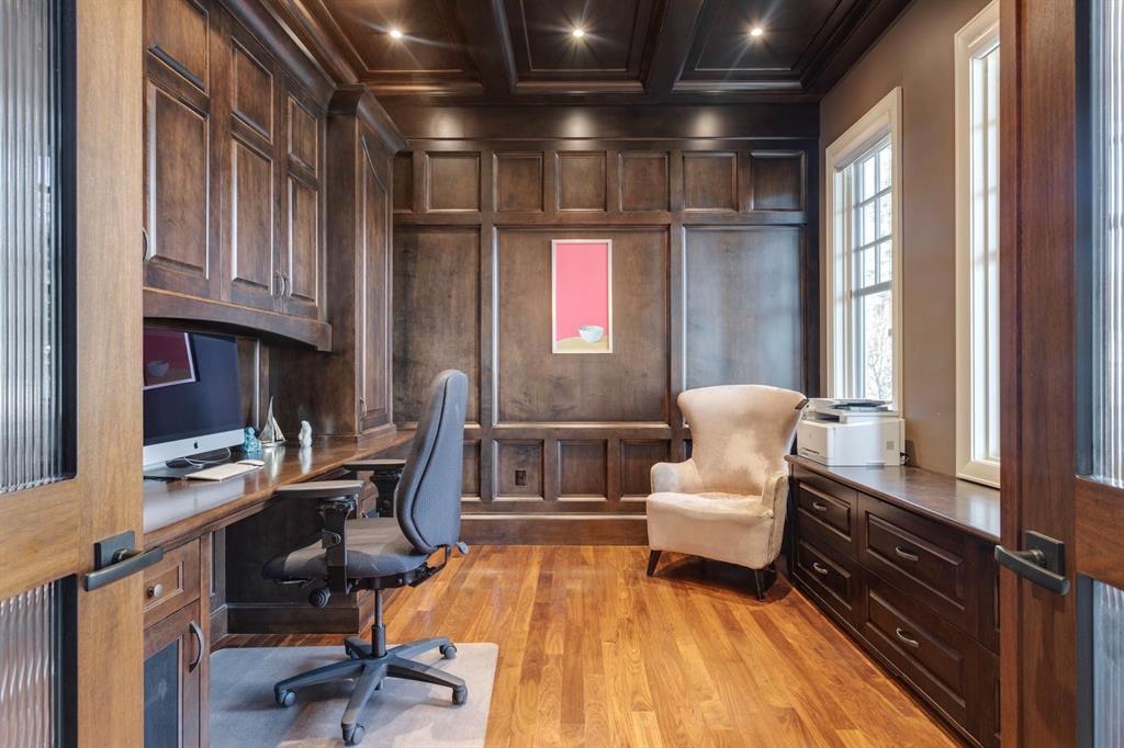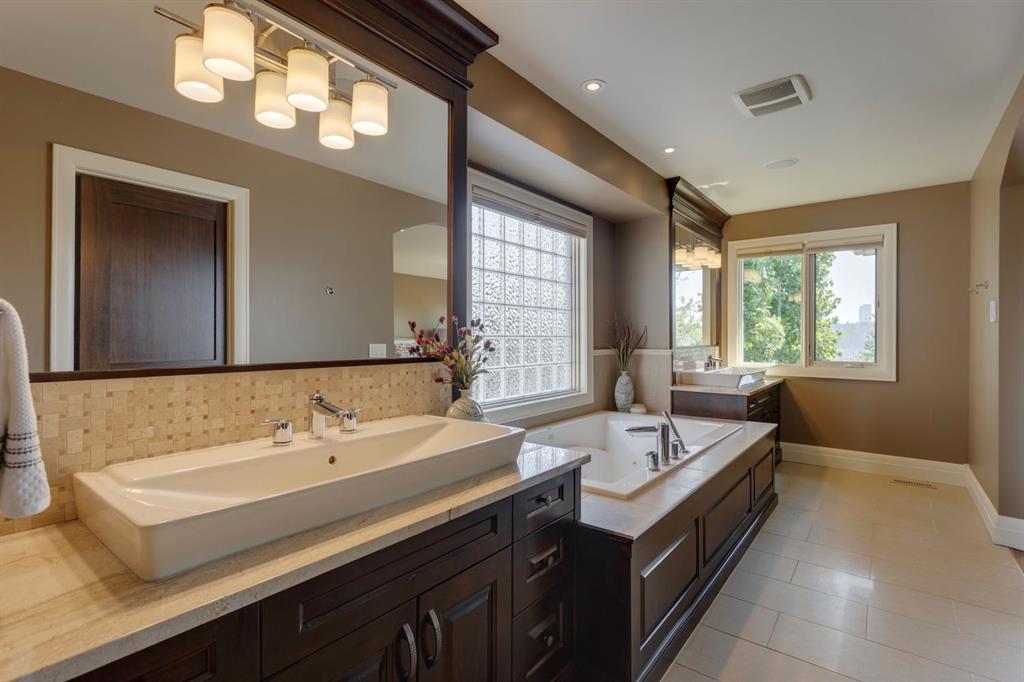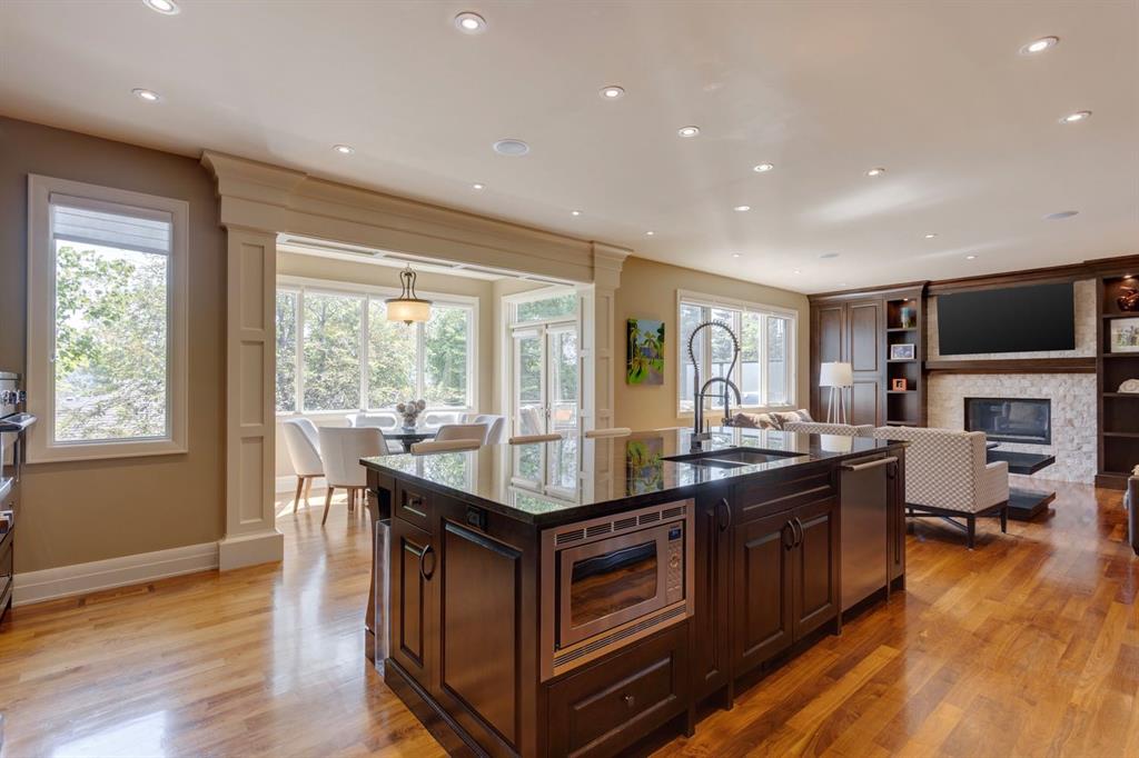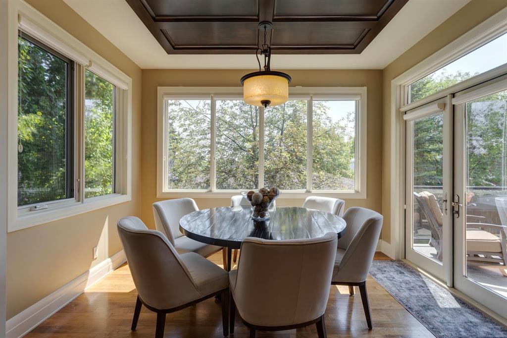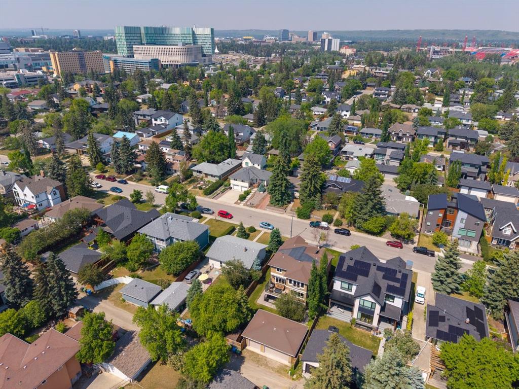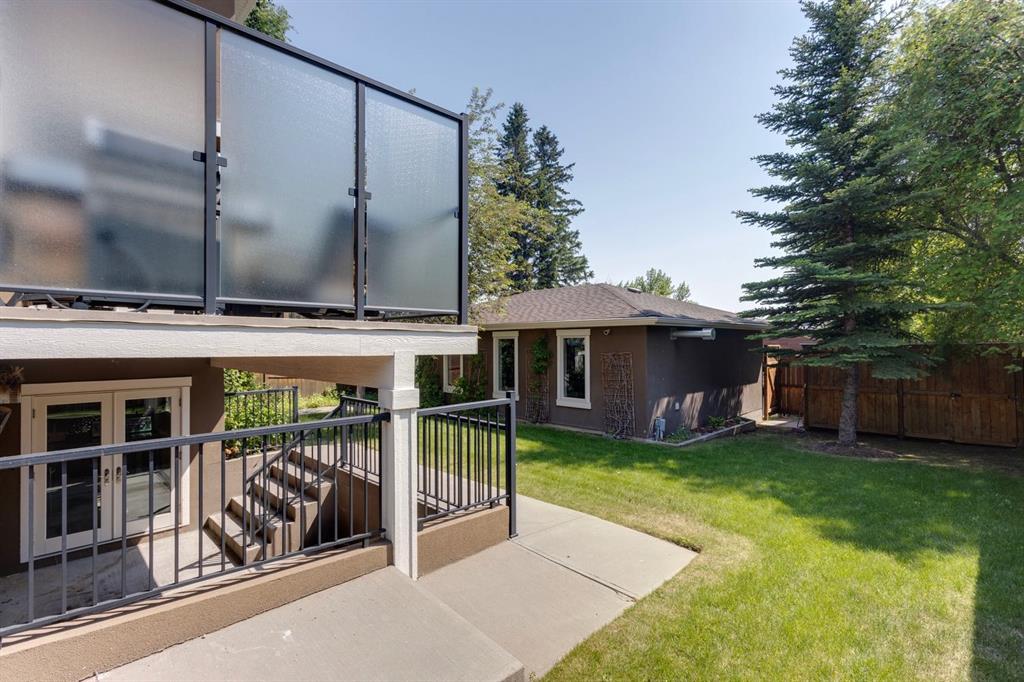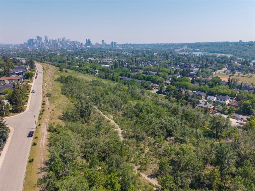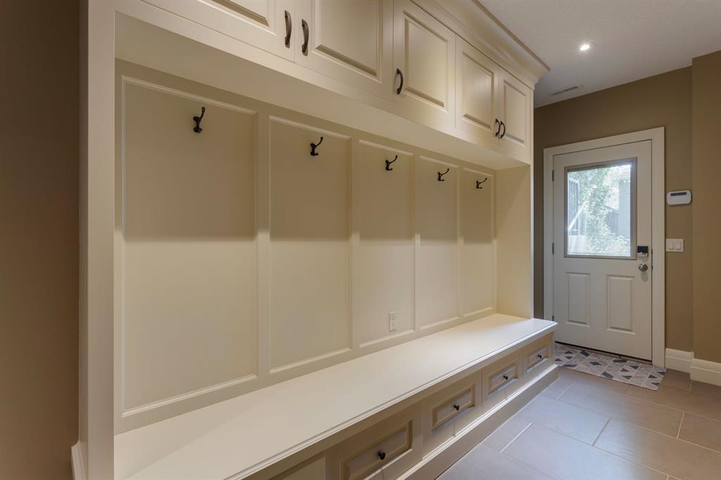 Welcome to this exquisite custom-built residence by Tribeca Homes, ideally positioned on a 55′ south-facing walk-up lot in the prestigious St. Andrews Heights. From the moment you arrive, the captivating curb appeal and charming front porch invite you to envision tranquil evenings at home. Step inside to soaring ceilings and impeccable craftsmanship, highlighted by over 4,090 sq ft of meticulously developed living space. Featuring site-finished walnut hardwood floors, solid core doors, detailed millwork, and elegant coffered ceilings, this home blends luxury with warmth. The grand travertine-tiled foyer impresses with a dramatic 19′ ceiling. French doors reveal a private home office adorned with custom built-ins and maple crown molding. The formal dining room offers paneled walls, a picture window, and a recessed ceiling detail — perfect for entertaining. The gourmet kitchen is a chef’s dream, outfitted with rich maple cabinetry, a massive 9’ granite island, and premium appliances including a Viking 6-burner gas cooktop with griddle, dual Viking wall ovens, Miele dishwasher, and a panelled fridge. A butler’s pantry connects the kitchen to the dining room, featuring a built-in Miele espresso machine and wine cooler. Adjacent, a bright breakfast nook opens to a raised south-facing deck — ideal for alfresco dining. The spacious living room is bathed in natural light and anchored by a stone-surround gas fireplace with custom built-ins, creating a warm, inviting atmosphere. Upstairs, a generous landing overlooks the foyer and leads to three large bedrooms, each with ensuite access. The luxurious primary suite is a private retreat, complete with a cozy sitting area, gas fireplace, Juliet balcony with treetop views, custom walk-in closet, and an opulent 6-piece ensuite featuring heated floors, dual vanities, a jetted tub, and steam shower. The fully developed walk-up lower level is designed for entertaining and relaxation, boasting a large family/media room with a gas fireplace, an elegant wet bar with raised granite counters, bar fridge, and dishwasher, plus a show-stopping wine cellar with cedar shelving for 400 bottles, enclosed by wrought iron gates. This level also includes a spacious bedroom, full bath, and a versatile flex room with cork flooring — ideal as a gym or studio. Outside, enjoy a spacious backyard with lush green space and a triple detached garage. A covered patio offers a welcoming space for additional seating or a hot tub. Don’t miss this rare opportunity to own a stunning, custom home in one of Calgary’s most sought-after communities!