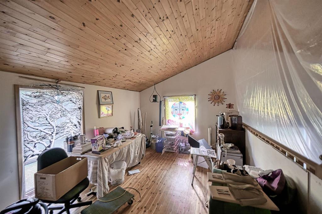 Nestled on 20 secluded treed acres near Dartique Hall, this unique circular log home offers privacy, character, and thoughtful design. The walkout bungalow features a true Heart of the Home central kitchen with an old-fashioned style gas stove, electric oven, dishwasher, fridge, and pantry overlooking bright open living and dining areas with large windows to flood the home with light. French doors in the dining area lead out to the new semi-wraparound premium composite deck perfect for entertaining or to charge your batteries and soak up the serenity. The main floor with soaring ceiling includes a tranquil primary bedroom suite with skylights, & 3pc ensuite, & walk-in closet, a second spacious bedroom, 3pc bath, laundry room w/ in-floor heat and mud room. Downstairs offers two additional bedrooms, a huge family and games area, and two storage rooms. A separate 1,056 SF Heated Workshop adds exceptional versatility for a home based business, a guest house, rental unit or space for your hobbies. Currently used as a workshop, it is comprised of a large main floor area, laundry room, 4-piece bath, mudroom, with a loft and walk-in closet upstairs plus a single unheated garage space. Additional outbuildings include shed, greenhouse and an additional single car garage. This One of a Kind home full of potential for your own personal design ideas is all surrounded by peaceful forest for a truly private retreat yet close to the Town of Cochrane and Calgary.