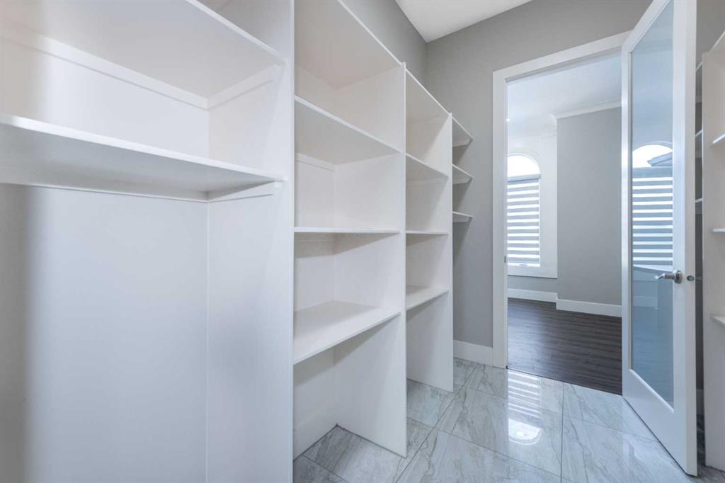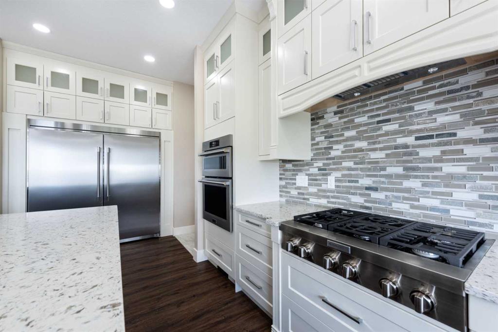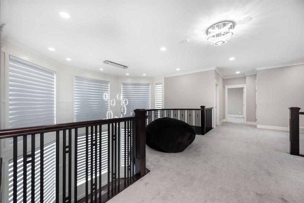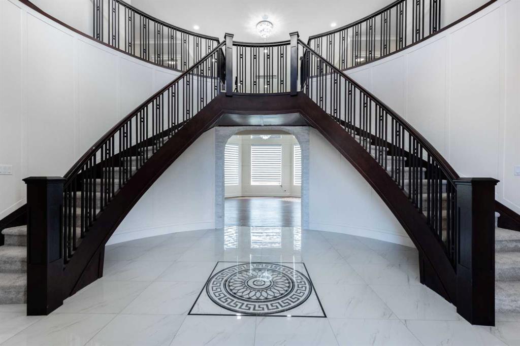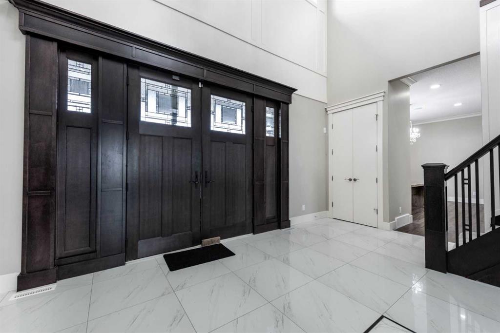 As you step inside, you’re greeted by grand circular staircases and a massive open-to-below foyer, setting a striking first impression. The main floor boasts soaring 10-foot ceilings with tall doors throughout, a spacious living room with a fireplace, and oversized windows that fill the space with natural light and provide direct access to a full-width deck. A main floor bedroom and full bathroom offer flexible living options, while the formal dining room, walkthrough pantry, and chef-inspired kitchen equipped with high-end built-in KitchenAid appliances and custom glass-insert cabinetry make this level as practical as it is elegant. A convenient main floor laundry room completes the level.
