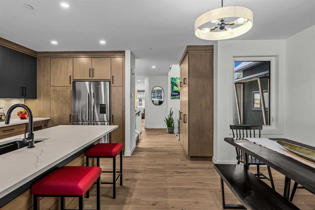 Step into luxury living with this stunning 4 bedroom, 5 bathroom modern built home by Lakusta Custom Homes, who are known for their quality craftsmanship, attention to detail, and refined mountain design. The layout features 2671sqft of livable space spread over three levels with the open concept living and dining area anchoring the home with sleek kitchen appliances and an expansive island leading to a wall of windows that flood the great room with natural light. The beautiful gas fireplace commands the space, making it perfect for gathering with family and friends after a day outdoors. Outdoor living extends seamlessly with a spacious upper-level deck spanning the entire back of the home, overlooking a forested backdrop and generous space that provides excellent privacy. The primary suite is a true retreat, complete with a walk-in closet, soaking tub with a separate luxurious walk-in tiled shower, and serene mountain views from the king bed. Upstairs two spacious bedrooms each with their own spa inspired bathroom and elevated design elements throughout bring comfort and luxury together in perfect balance. Downstairs, there is a media lounge with custom bar, including additional guest space with a large bedroom and 3pc bathroom and access from this level to the 2-car garage and gear storage. Located in a premier Canmore neighbourhood, celebrated for its scenic setting, access to the world class skiing and biking at the Nordic Centre, proximity to the downtown Canmore, trails, and year round recreation. Whether you envision a primary residence or a luxury mountain retreat, this opportunity offers exceptional value in an unbeatable community.