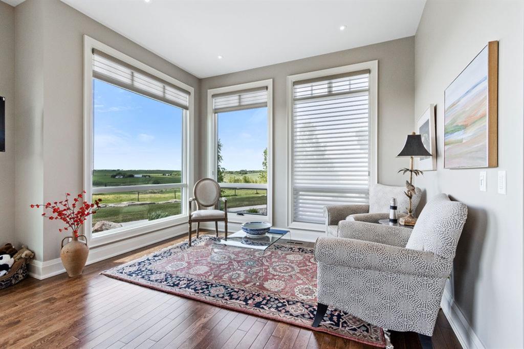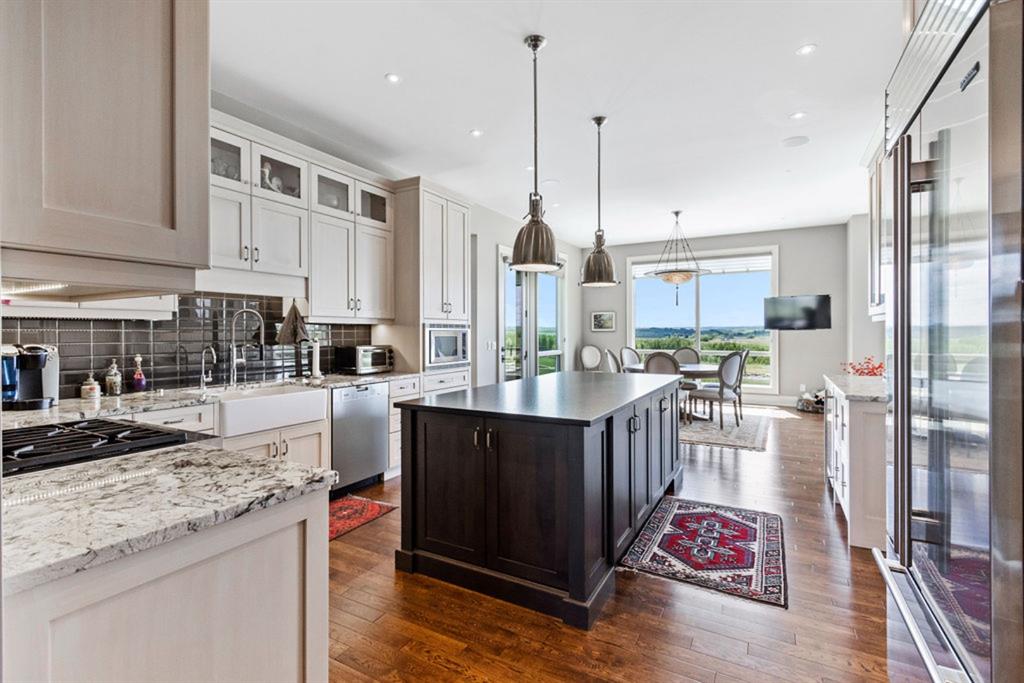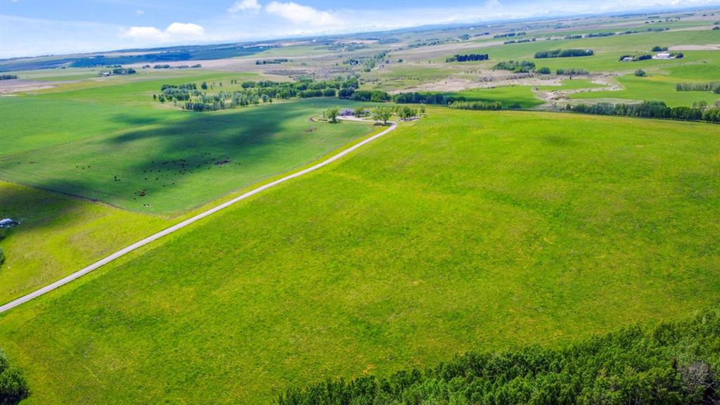 Stunning Custom Built Bungalow sitting atop the biggest hill on 122 acres with breathtaking views in all directions. Unobstructed mountain views to the west, golf course to the north, the friendly hamlet of madden east and south for miles! Enter from your gated private paved lane-way and find this architectural thing of beauty at the peak. This home is just shy of 4000 sq/ft on the main level and boasts another 2700sq/ft of developed space in the basement. The main floor has gleaming hardwood flooring throughout along with slate entry and heated tile flooring in all the bathrooms. Oversized low UV transmission windows with Hunter Douglas blinds throughout helps capture the most amazing landscapes. The executive chefs kitchen has stainless steel appliances including a Wolff gas stove, Sub Zero fridge, Dacor wall oven and microwave. All cabinetry milled by Legacy with soft close and upgraded shelving and storage. Huge center island with Cambrian Black satin granite is a classic focal point in this exquisite home. There are two dining areas for all sizes of gatherings and a huge living room with descending TV from the ceiling and natural gas fireplace. The large master bedroom comes with a 4 piece en-suite with modern tiled shower, his/her sinks in Bianco Rhino marble and a walk in California closet. Main floor is completed with two other bedrooms with California closets and Jack n Jill 4 piece bathrooms, an office, and den adjacent dining room. The second fireplace is found in the library or study for those that like to kick back with a glass of wine and enjoy a good book. Basement is finished with a huge family/ games room and tons of storage. The attached triple garage measures 38×22 it has a separate entry and big bright windows and upgraded wood doors. The west facing concrete patio is covered with skylights so you can enjoy it in all weather! The property is professionally landscaped with mature trees and raised garden boxes for the green thumb. Extra features include 2 independent furnaces and AC systems, in-floor heating, water softening system, instant hot water, in-wall Vacu flo, Sonos sound, Security system and more! Combination of pasture and grade A crop land with good perimeter fencing. Rare opportunity to own a beautiful parcel of land this size commutable to Calgary with an equally magnificent home to match!
