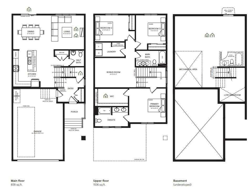 Welcome to the Marigold 3! This beautifully designed 4-bedroom, 2.5-bathroom home offers the perfect blend of comfort and style, ideal for growing families or those who love to entertain. The primary ensuite comes with a tiled standing shower, while the additional bonus room provides the flexibility for a home office, playroom, or media space. The open-concept main floor features upscale finishes, including a chimney-style hood fan, kitchen cabinets to the ceiling, a built-in microwave, gas rough in’s for the stove and railings leading to the second floor, adding a touch of elegance throughout. Thoughtfully laid out with both function and flow in mind, the Marigold 3 offers a modern living experience in every corner. Photos are representative.