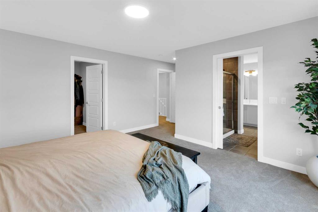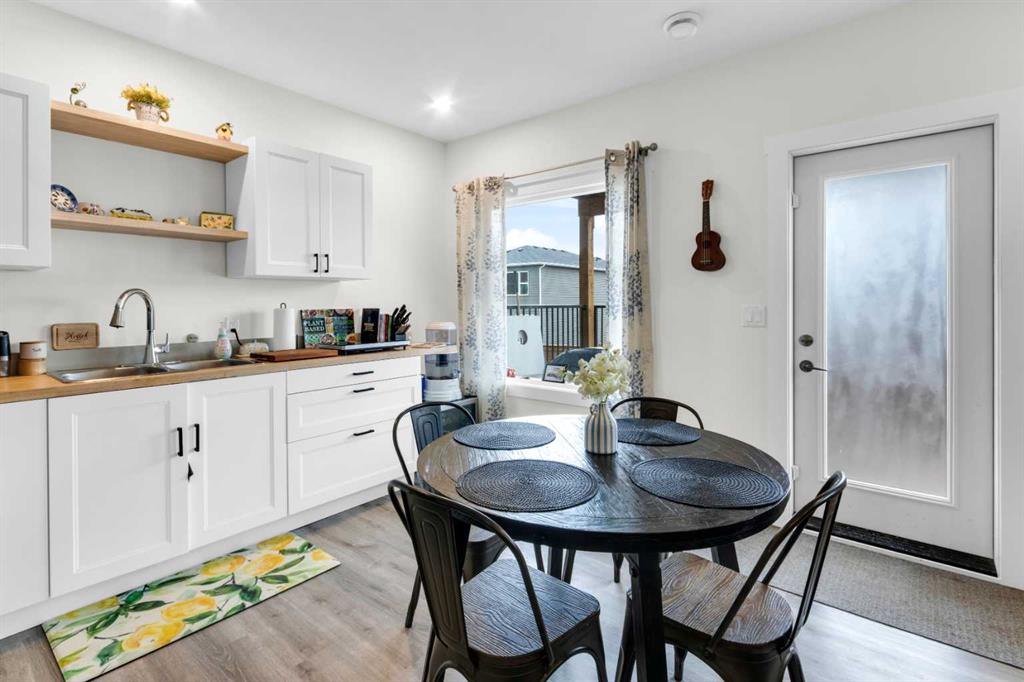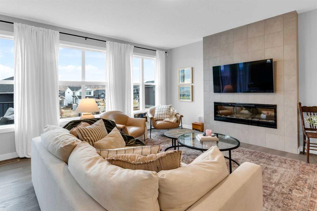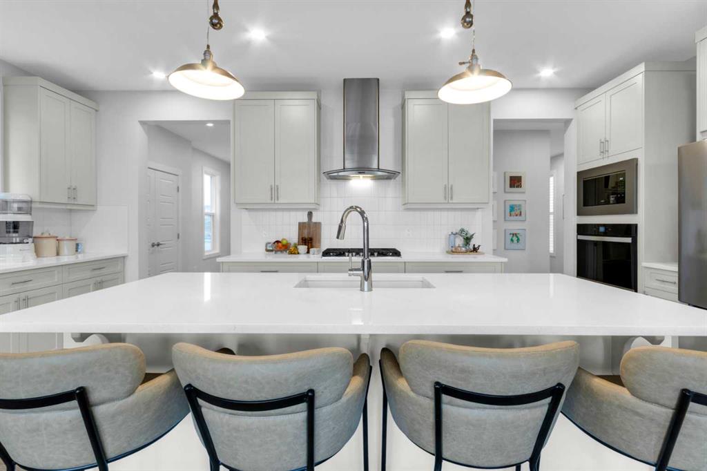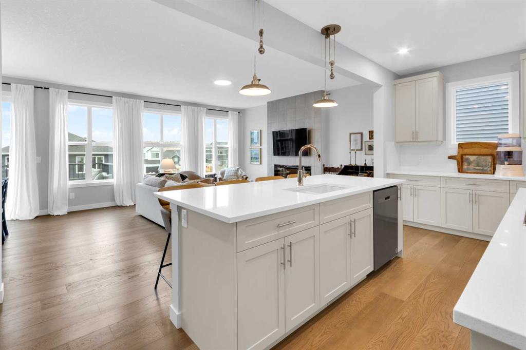 Located in the prestigious community of Rivercrest, this beautifully designed home offers nearly 3,500 sqft. of finished living space, thoughtfully crafted for both comfort and elevated everyday living. Flooded with natural light and positioned to capture stunning views of downtown Cochrane and mountain views to the west. This home features 3 spacious bedrooms on the upper floor plus a main-floor flex room, ideal as a private home office or 4th bedroom with the added versatility of a Murphy bed, along with a 1-bedroom suite on the lower level. The main level welcomes you with 9 ft ceilings, a spacious foyer and a seamless open-concept layout anchored by expansive windows and a large sliding patio door. The kitchen is both stylish and functional, featuring an expansive 8’ island, ample counter space, and built-in appliances, perfect for entertaining and everyday living. The living and dining areas are warmed by a cozy fireplace, creating an inviting atmosphere for gatherings and quiet evenings alike.