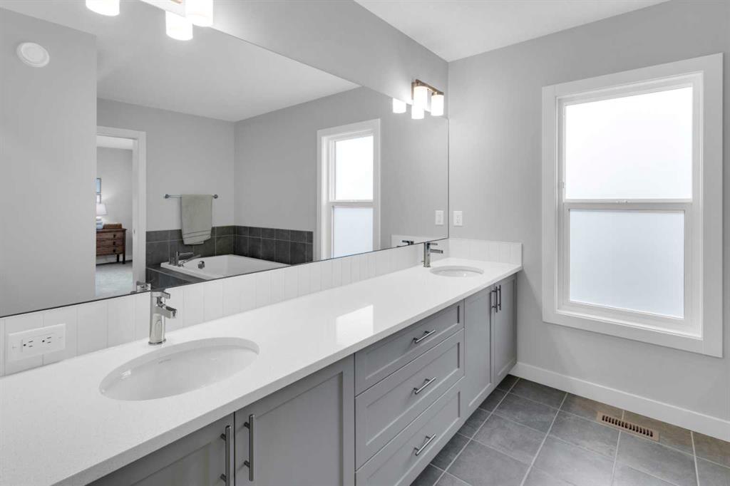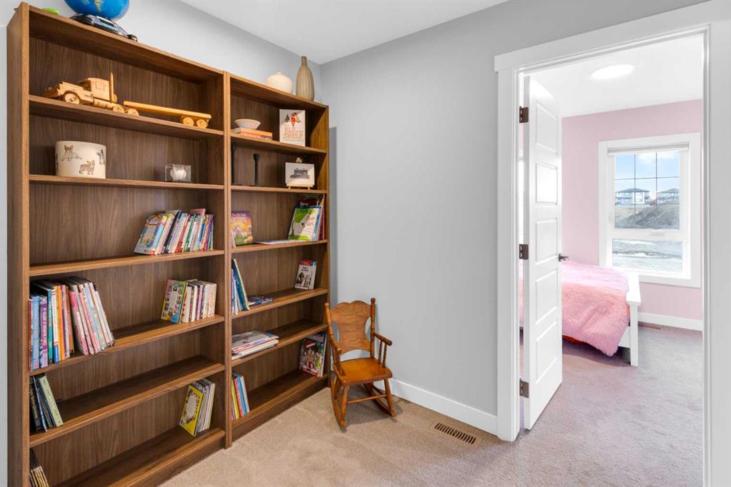 Upstairs, a centrally located bonus room provides the ideal space for family movie nights or a children’s play area. The primary retreat offers a serene escape, complete with a spa-inspired ensuite featuring double sinks, a tiled shower, and a soaker tub. For added convenience, the laundry room connects directly to the primary walk-in closet. Two additional bedrooms are thoughtfully positioned alongside a 5-piece bathroom with a separate sink area and a charming reading nook.