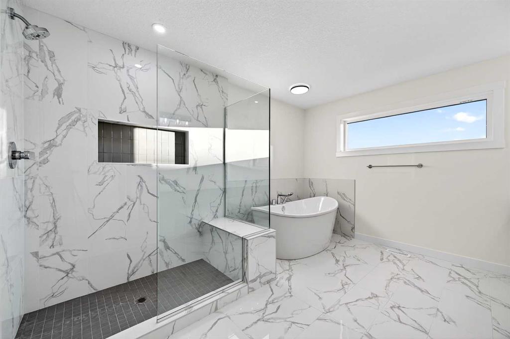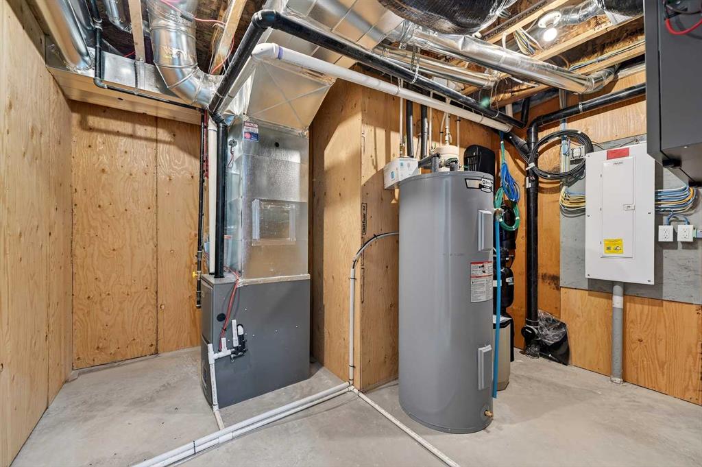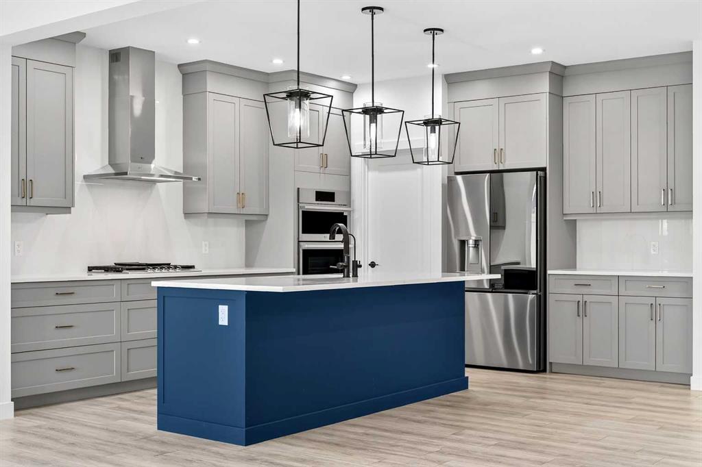 Welcome to 29 Rowmont Common NW, a stunning, sun-drenched residence that perfectly balances modern luxury with thoughtful family functionality. This south-facing home boasts a striking contemporary exterior with stone accents and a double attached garage. The bright, open-concept main floor features soaring ceilings, wide-plank flooring, and premium finishes throughout. The chef-inspired kitchen is a true showstopper, centered around a massive quartz island with a black undermount sink and designer pendant lighting. It comes fully equipped with a 5-burner LG gas cooktop, sleek chimney-style hood fan, integrated smart microwave and oven, and a full walk-through pantry. A dedicated breakfast nook with additional cabinetry and counter space is conveniently located directly beside the smart refrigerator. For the remote professional, a private main-floor office is situated near the entrance, flanked by a front-door closet and a functional half-bath. The living area is anchored by a sleek Gas Metal Fireplace, and the main level provides ample storage with direct mudroom-style access to the garage. Ascend the carpeted stairs with open railing to a versatile central bonus room, perfect for family movie nights. The Primary Suite serves as a sanctuary, featuring a private 4-piece ensuite with dual sinks and a spacious walk-in closet. Uniquely, the second bedroom also features its own 4-piece ensuite and walk-in closet, making it an ideal “junior suite,” while a third generous bedroom sits nearby. The dedicated laundry room is a dream, complete with a washer/dryer, folding table, and built-in storage. The professionally finished basement extends your living space even further with two additional bedrooms, a large entertainment area, and a modern 3-piece bath. The utility room is meticulously maintained, featuring a Reverse Osmosis water system, high-efficiency furnace, and electrical panel. Outside, the south-facing backyard is a blank canvas, offering maximum sunlight throughout the day, perfect for a future custom deck. With titled-to-the-ceiling finishes and large windows throughout, this home is flooded with natural light and ready for you to move in