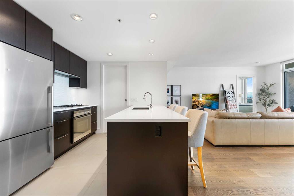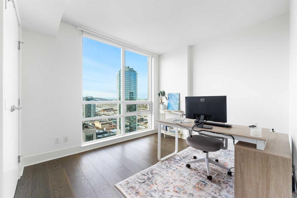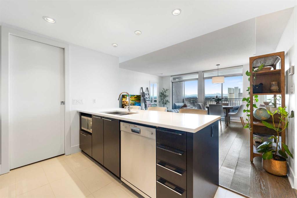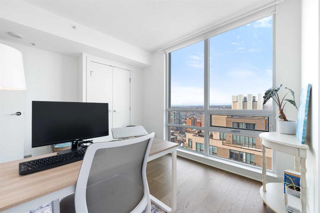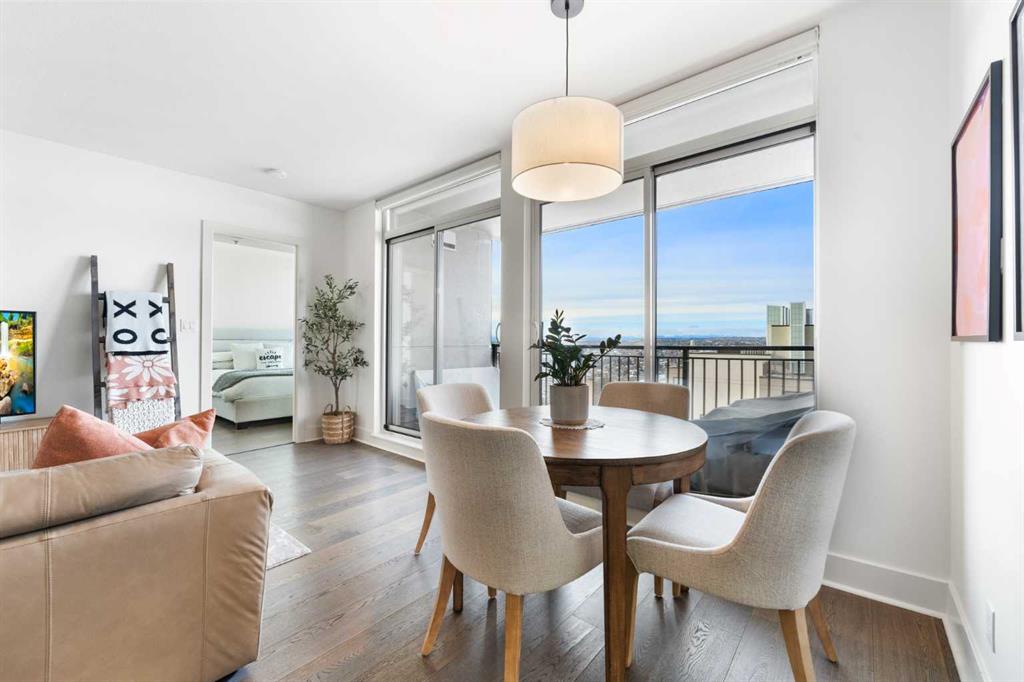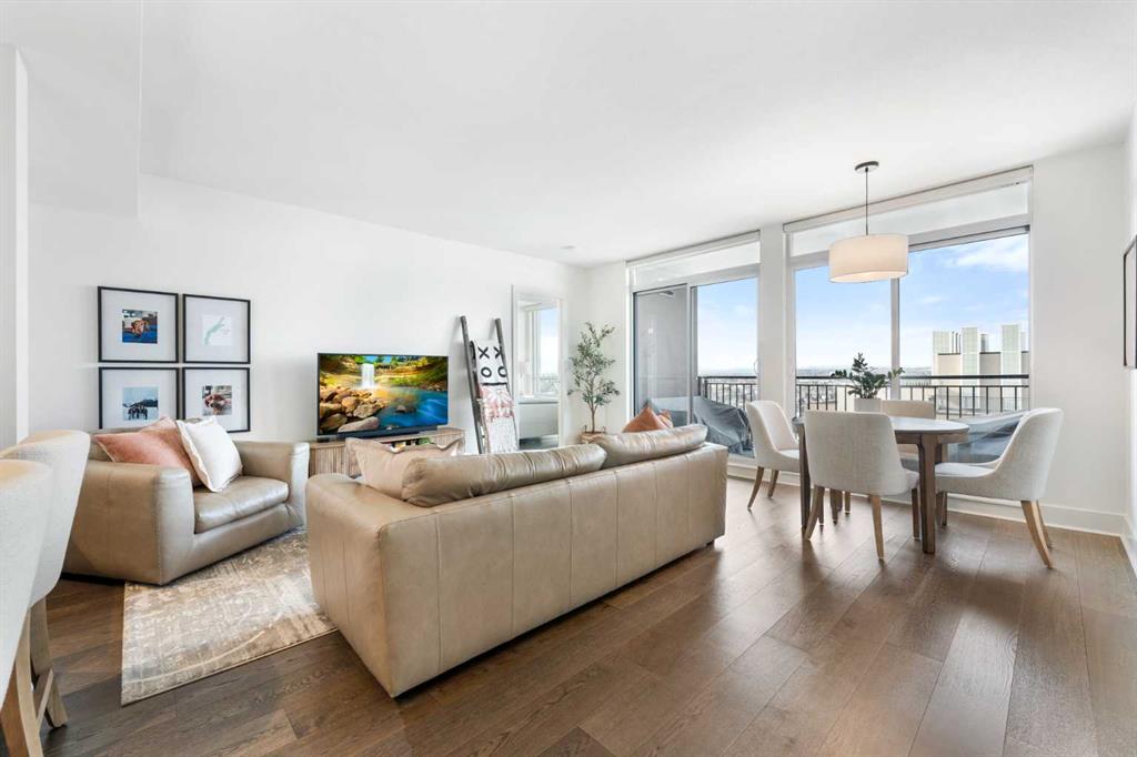 29 storeys above the city, this west-facing sub-penthouse offers a commanding perspective over the Bow River and Rocky Mountains — a front-row seat to Calgary’s most breathtaking sunsets. This bright and beautifully laid-out two-bedroom, two-bathroom residence features a functional split-bedroom design, ideal for professionals, guests, or those working from home. A generous entryway welcomes you into an open-concept living space where the kitchen, dining, and living areas flow seamlessly together — all positioned to fully capture the view. The gourmet kitchen overlooks the main living area and offers excellent storage, a large pantry, and a dining space comfortably seating six. The living room is thoughtfully designed with room for a built-in desk or coffee bar — perfect for modern city living. The primary suite is a private retreat with a walk-in closet and a spa-inspired ensuite featuring dual vanities and a deep soaker tub. The second bedroom is well-proportioned with generous closet space and easy access to the second full bathroom. Floor-to-ceiling windows and hardwood flooring throughout enhance the natural light and elevate the space, while in-suite laundry and air conditioning add everyday comfort. Step outside through double sliding doors to your private patio — the ideal place to unwind and enjoy Calgary’s most dramatic sunsets. Included are a titled parking stall on P1 and a separate storage locker. Residents of Luna enjoy concierge and security services, a state-of-the-art fitness centre, yoga studio, steam rooms, owner’s lounge with fireplace and kitchen, pool table, and an expansive outdoor terrace.