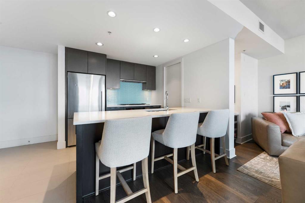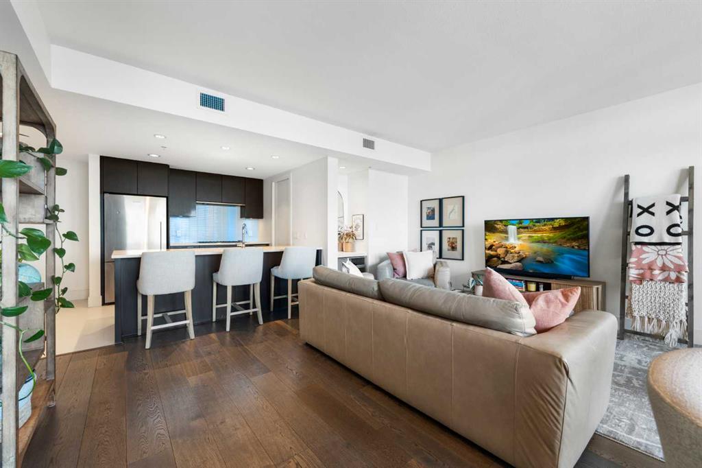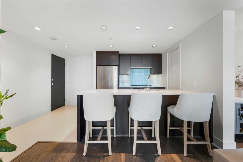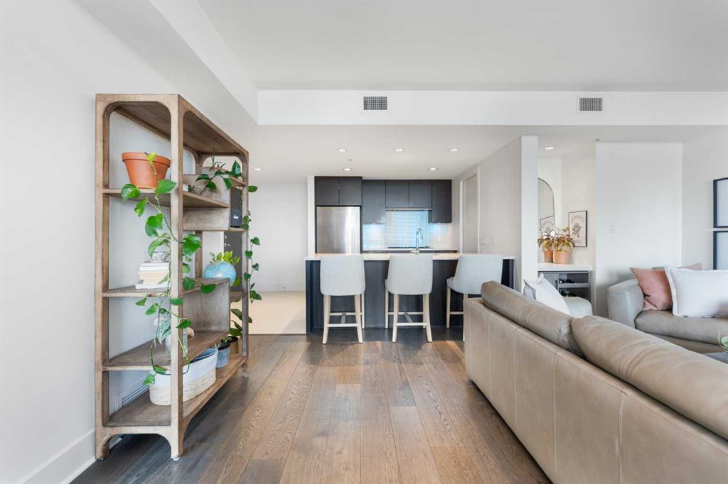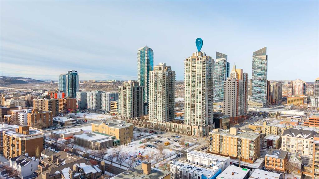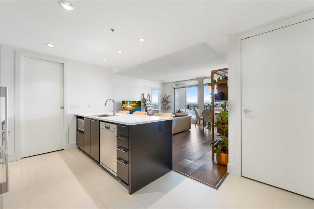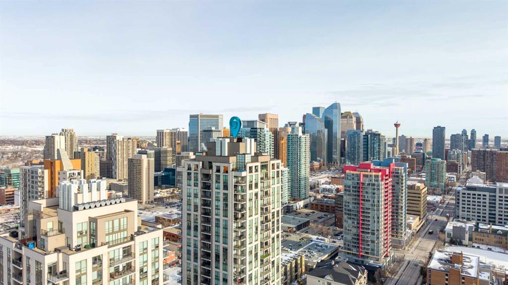 29 storeys above the city, this west-facing sub-penthouse offers a commanding perspective over the Bow River and Rocky Mountains — a front-row seat to Calgary’s most breathtaking sunsets. This bright and beautifully laid-out two-bedroom, two-bathroom residence features a functional split-bedroom design, ideal for professionals, guests, or those working from home. A generous entryway welcomes you into an open-concept living space where the kitchen, dining, and living areas flow seamlessly together — all positioned to fully capture the view. The gourmet kitchen overlooks the main living area and offers excellent storage, a large pantry, and a dining space comfortably seating six. The living room is thoughtfully designed with room for a built-in desk or coffee bar — perfect for modern city living. The primary suite is a private retreat with a walk-in closet and a spa-inspired ensuite featuring dual vanities and a deep soaker tub. The second bedroom is well-proportioned with generous closet space and easy access to the second full bathroom. Floor-to-ceiling windows and hardwood flooring throughout enhance the natural light and elevate the space, while in-suite laundry and air conditioning add everyday comfort. Step outside through double sliding doors to your private patio — the ideal place to unwind and enjoy Calgary’s most dramatic sunsets. Included are a titled parking stall on P1 and a separate storage locker. Residents of Luna enjoy concierge and security services, a state-of-the-art fitness centre, yoga studio, steam rooms, owner’s lounge with fireplace and kitchen, pool table, and an expansive outdoor terrace.