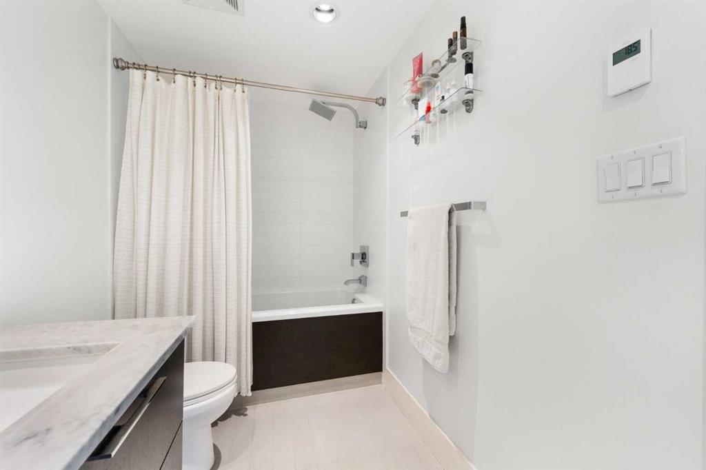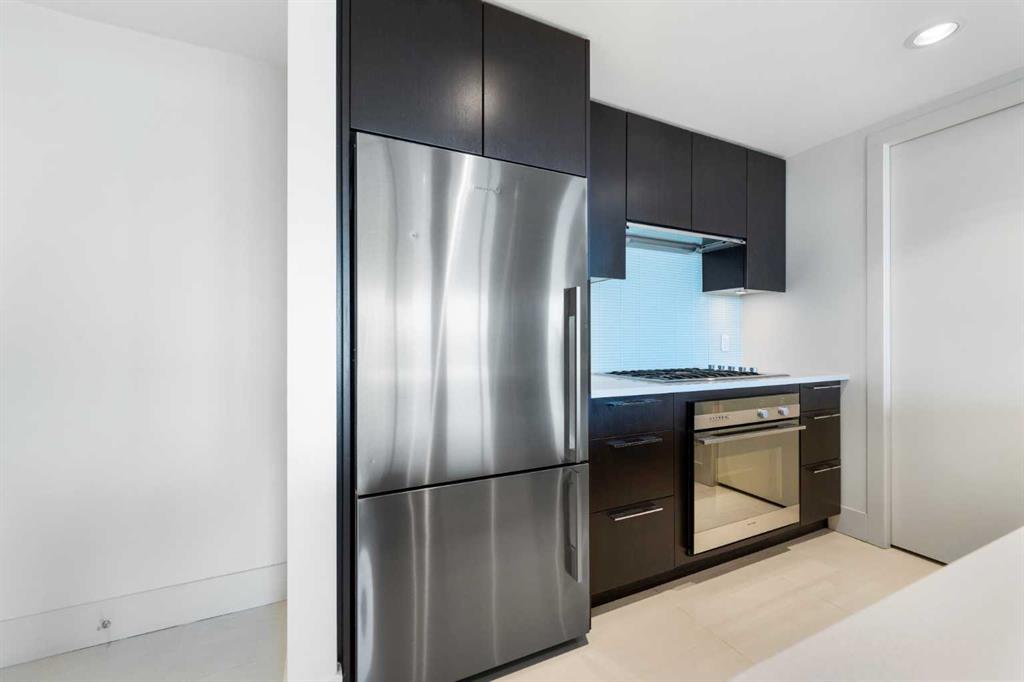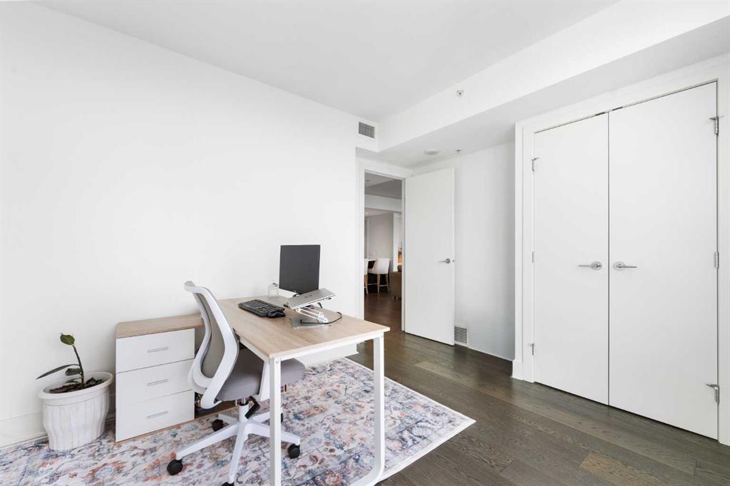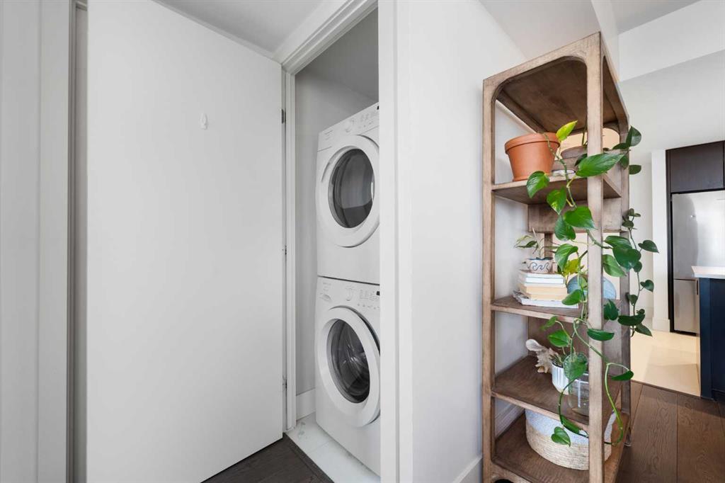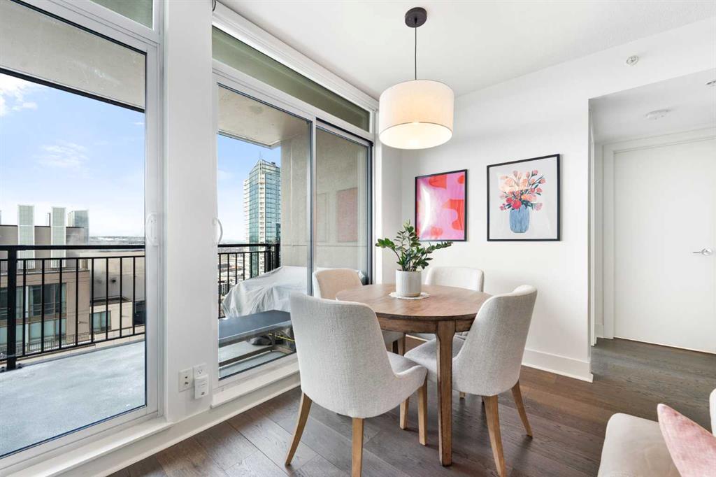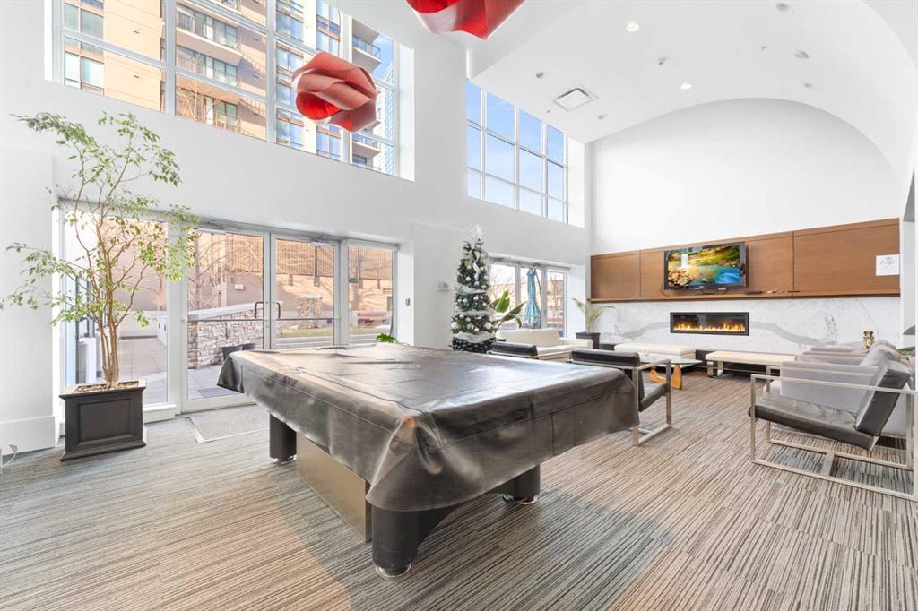 29 storeys above the city, this west-facing sub-penthouse offers a commanding perspective over the Bow River and Rocky Mountains — a front-row seat to Calgary’s most breathtaking sunsets. This bright and beautifully laid-out two-bedroom, two-bathroom residence features a functional split-bedroom design, ideal for professionals, guests, or those working from home. A generous entryway welcomes you into an open-concept living space where the kitchen, dining, and living areas flow seamlessly together — all positioned to fully capture the view. The gourmet kitchen overlooks the main living area and offers excellent storage, a large pantry, and a dining space comfortably seating six. The living room is thoughtfully designed with room for a built-in desk or coffee bar — perfect for modern city living. The primary suite is a private retreat with a walk-in closet and a spa-inspired ensuite featuring dual vanities and a deep soaker tub. The second bedroom is well-proportioned with generous closet space and easy access to the second full bathroom. Floor-to-ceiling windows and hardwood flooring throughout enhance the natural light and elevate the space, while in-suite laundry and air conditioning add everyday comfort. Step outside through double sliding doors to your private patio — the ideal place to unwind and enjoy Calgary’s most dramatic sunsets. Included are a titled parking stall on P1 and a separate storage locker. Residents of Luna enjoy concierge and security services, a state-of-the-art fitness centre, yoga studio, steam rooms, owner’s lounge with fireplace and kitchen, pool table, and an expansive outdoor terrace.