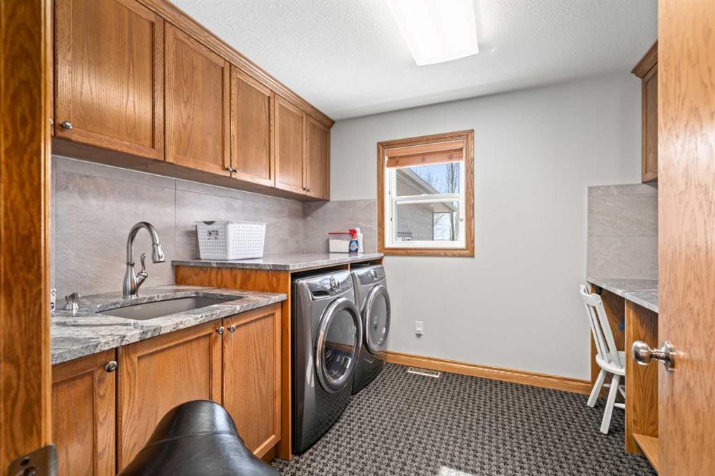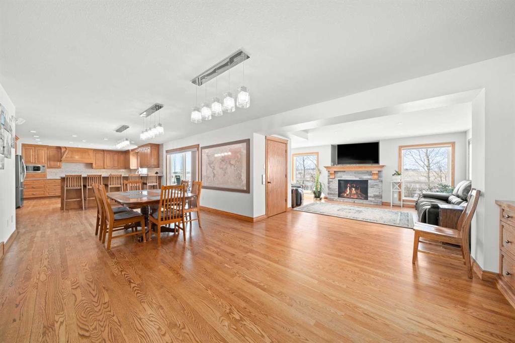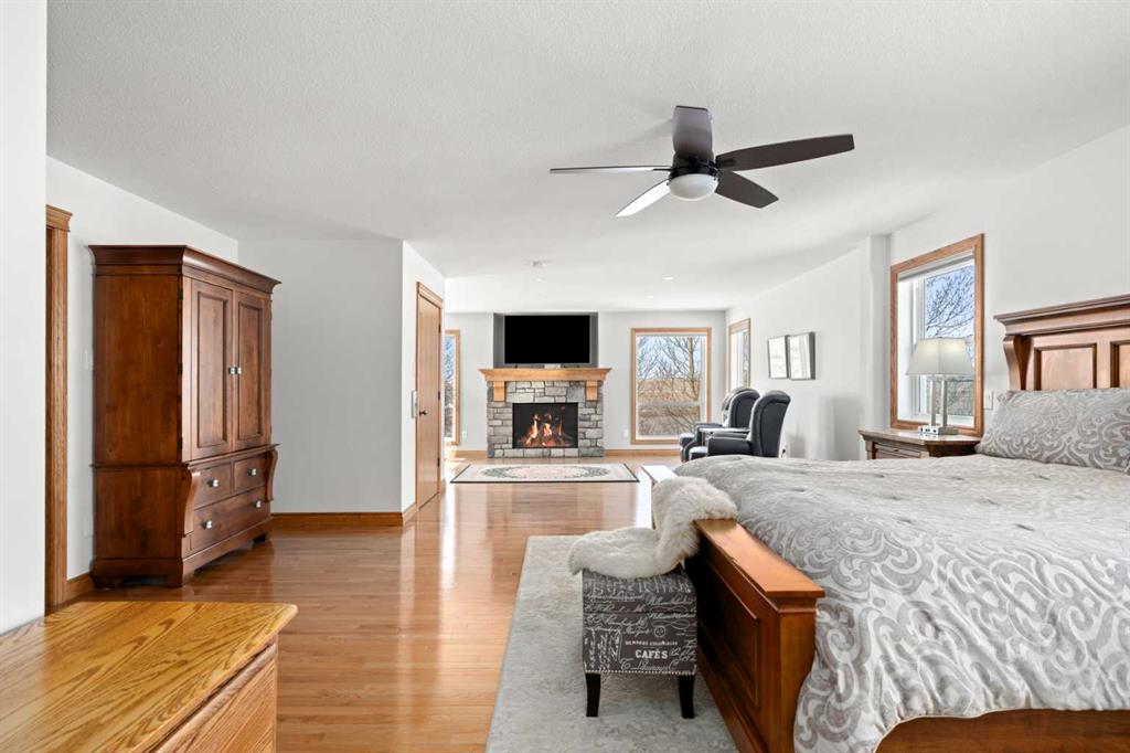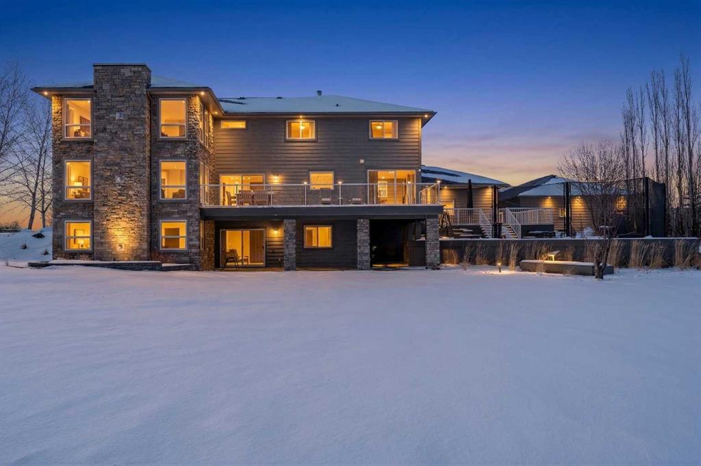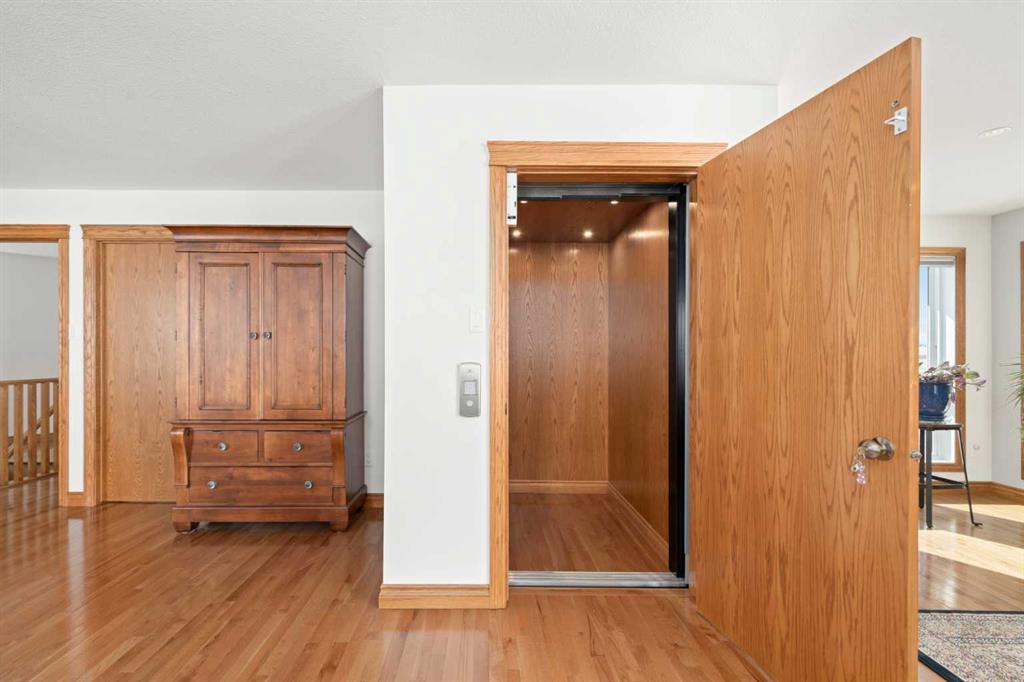A controlled gate provides access to the lane that leads to the residence. You will be impressed by the size of the home along with its two sets of triple car garages (one attached and one detached). This home offers space and comfort for everyone and beautiful views from almost every window. The functional main level offers a mudroom, ½ bath and laundry room off the upgraded kitchen that features premium appliances with a Wolf 36” gas stove with electric oven, a full wall pantry, granite countertops. Access to the sunroom, an open dining area, living room with fireplace, flex room, office and elevator to upper and lower levels complete the main floor. Upstairs, you will find the primary retreat that you will never want to leave. The ensuite has a steam shower and the bedroom includes a sitting area with fireplace and windows looking out over the countryside. There is another 4 bedrooms, a full bathroom and loft area on the upper level as well. The lower level is a fully developed walkout with a living room area with fireplace, multi-purpose room, 1-bedroom, full bathroom, a gym area, a cold room, storage, in-floor heating, 2 high-efficiency furnaces, and an RO water system. The entire home can be controlled by your phone.