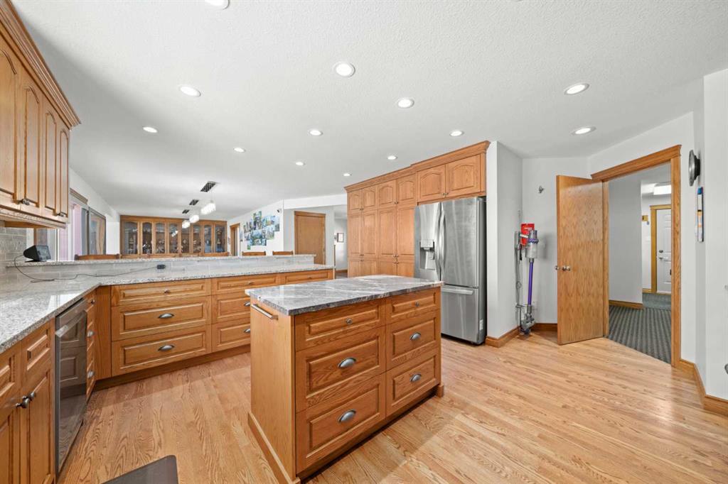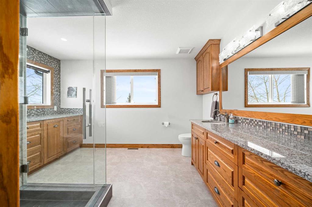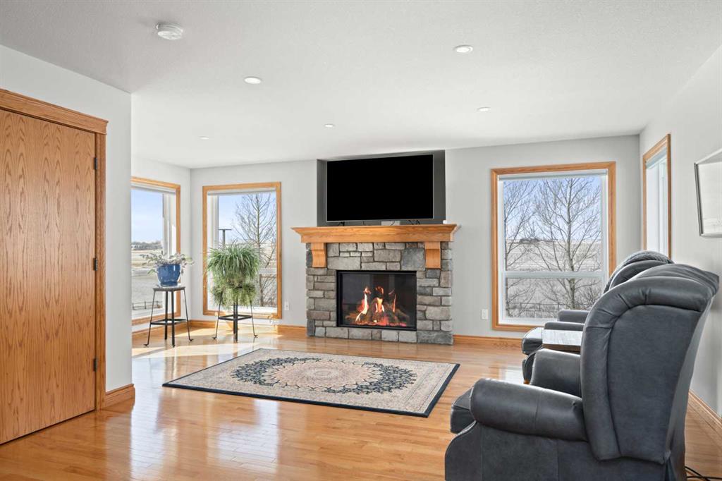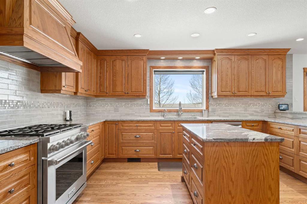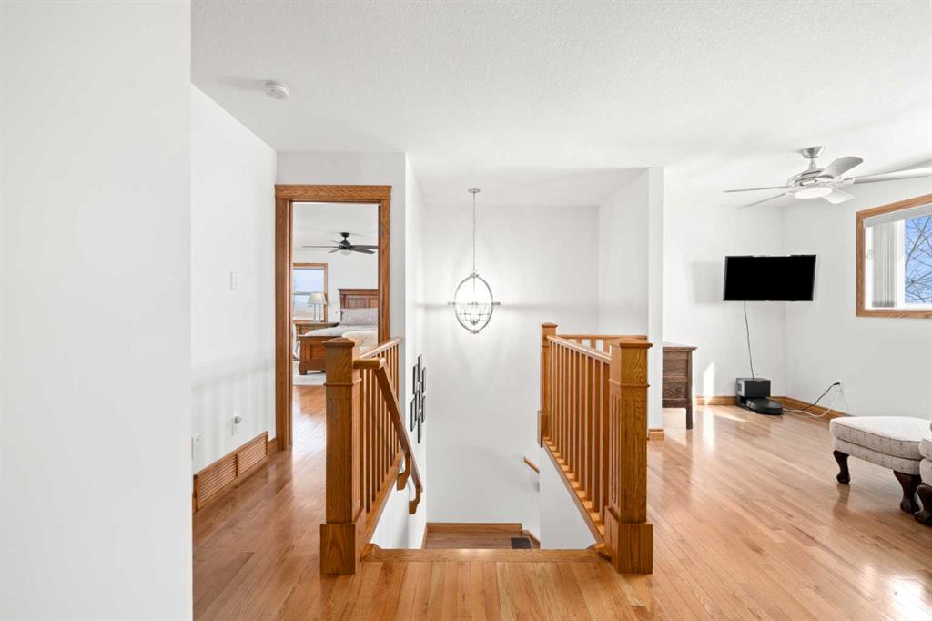 A controlled gate provides access to the lane that leads to the residence. You will be impressed by the size of the home along with its two sets of triple car garages (one attached and one detached). This home offers space and comfort for everyone and beautiful views from almost every window. The functional main level offers a mudroom, ½ bath and laundry room off the upgraded kitchen that features premium appliances with a Wolf 36” gas stove with electric oven, a full wall pantry, granite countertops. Access to the sunroom, an open dining area, living room with fireplace, flex room, office and elevator to upper and lower levels complete the main floor. Upstairs, you will find the primary retreat that you will never want to leave. The ensuite has a steam shower and the bedroom includes a sitting area with fireplace and windows looking out over the countryside. There is another 4 bedrooms, a full bathroom and loft area on the upper level as well. The lower level is a fully developed walkout with a living room area with fireplace, multi-purpose room, 1-bedroom, full bathroom, a gym area, a cold room, storage, in-floor heating, 2 high-efficiency furnaces, and an RO water system. The entire home can be controlled by your phone.