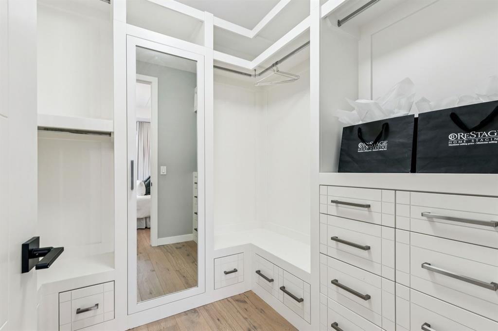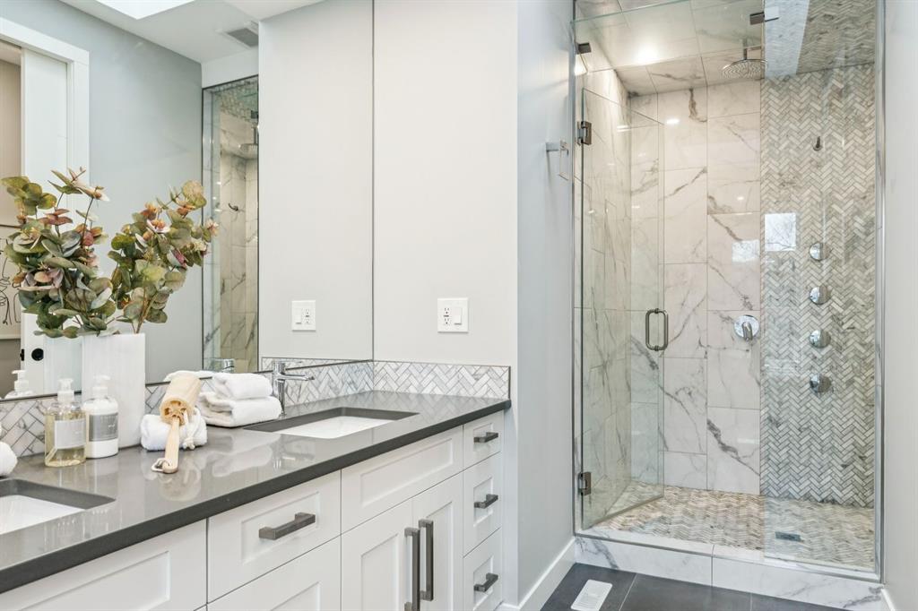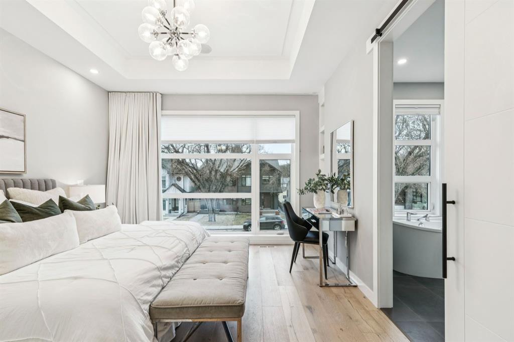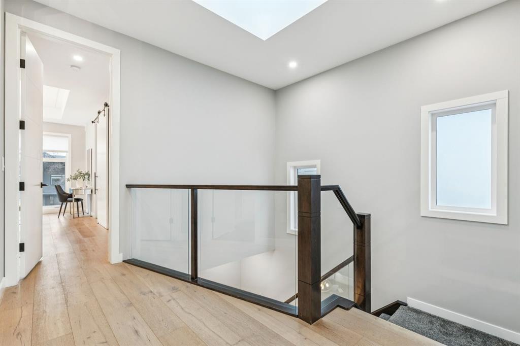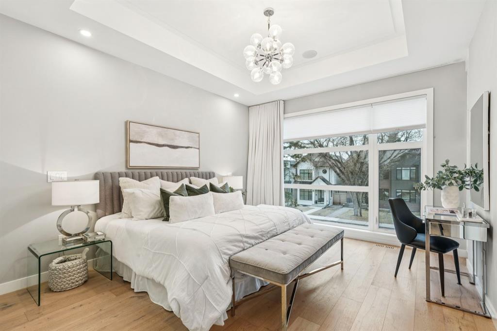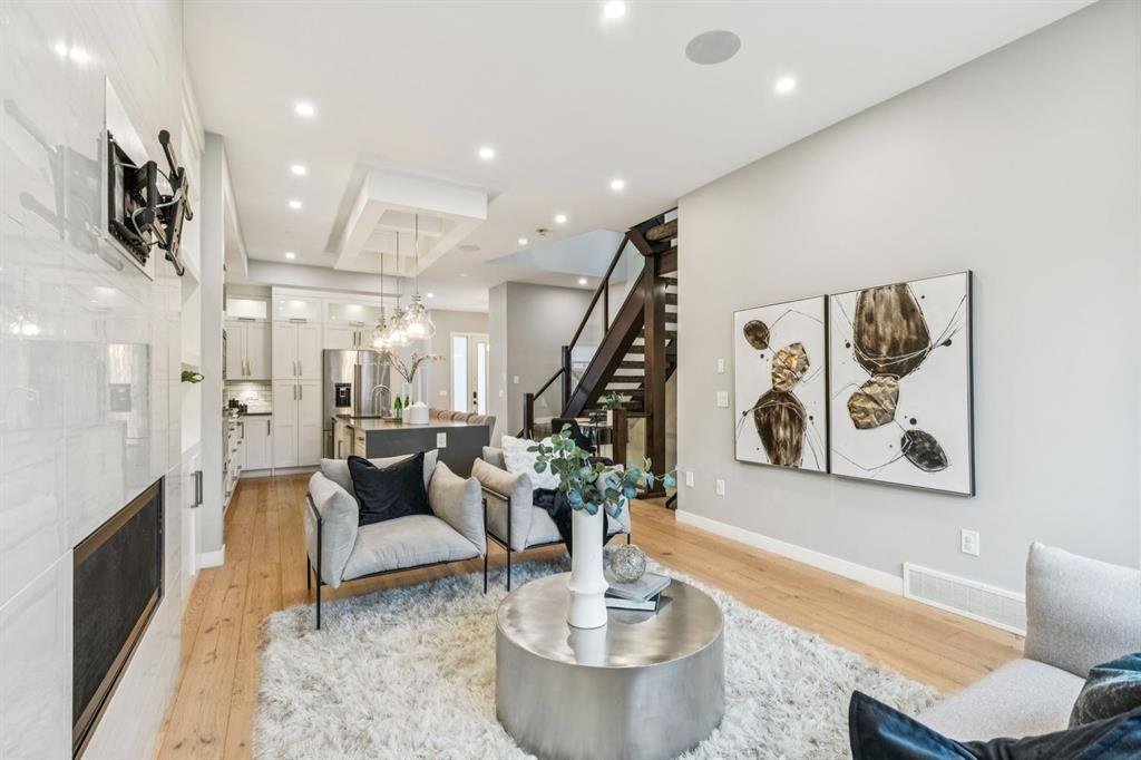 Proudly presenting this incredible family home ideally located in a welcoming, family friendly community just steps from Westmount Charter school, parks, and the Bow River pathway system. Offering over 2,700 sq ft of thoughtfully designed living space, this home blends modern luxury with everyday functionality. Stunning wide plank hardwood floors flow throughout the main and upper levels, while custom built-ins are seamlessly integrated throughout the home, adding both beauty and practical storage. The main floor is designed for connection with a beautifully panelled dining room, and centrally located chef’s kitchen ideal for gathering and entertaining. Highlights include white shaker cabinetry with glass accents, expansive waterfall quartz countertops, elegant pendant lighting, a high end Jenn-Air 6 burner gas cooktop and wall oven, and a premium kinetic water system. The inviting living area is showcases a sleek linear gas fireplace anchored by built-ins and a sliding glass door opens to a spacious composite deck, extending your area of entertainment. A tiled mudroom with built-in bench and abundant storage keeps daily life organized and stress free. Upstairs, natural light pours in through a large skylight, illuminating open riser stairs with glass railings and a bright second level that includes three generous bedrooms, a full bathroom with heated floors, and a convenient laundry room with sink. The primary retreat offers a peaceful escape with soaring ceilings, a large floor to ceiling picture window, custom walk-in closet, and a lavish ensuite featuring heated tile floors, a soaker tub, skylight, and tiled shower with bench and dual shower heads. The fully developed lower level is perfect for family movie nights and entertaining, featuring a large recreation room with built-in media wall, full bar with island seating and beverage fridge, a fourth bedroom, and a full bathroom. Additional lower level upgrades include rough-ins for Vacuflo, in-floor heating, and speakers. The backyard is thoughtfully designed for relaxation, with a large deck that flows into green space and leads to a double detached garage. Located close to Helicopter Park, Foothills Hospital, an off-leash dog park, and the Bow River Pathway system, this home offers an unbeatable lifestyle for families who value community, nature, and convenience. A prime opportunity to own a truly exceptional home in a welcoming neighbourhood, don’t miss it.