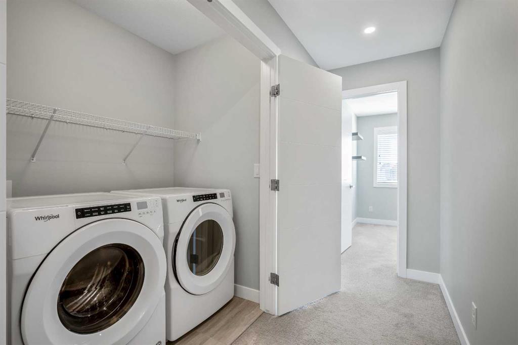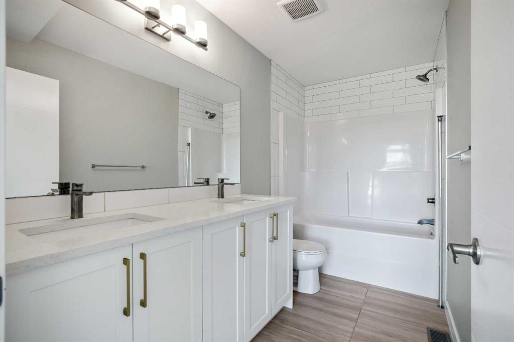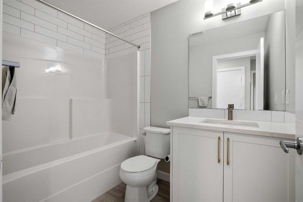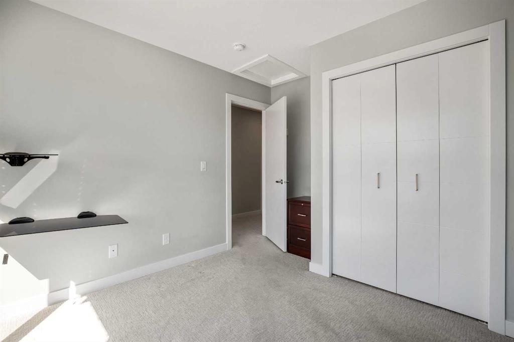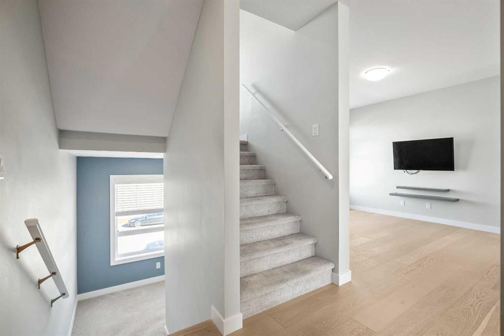 ***Open House Saturday, April 25, 2026 from 1-3 pm*** With almost 1,700 sq ft of finished living space, you’re going to want to see this original-owner townhouse in person. It features 3 bedrooms, 2.5 bathrooms, a main floor office / flex room, a heated double-car attached garage, air conditioning, hot water on demand, and numerous builder upgrades. Additionally, it’s one of the few units in this development that faces a large green space, and it’s just a short drive from extensive shopping at Creekside and convenient access to Calgary’s Ring Road. Come into the spacious front entry, and you’ll notice the large flex room to your left. A short flight of stairs takes you up to your attached garage and then further to your main living area. The large, well-appointed kitchen features stainless steel appliances (including fridge with water line), white cabinetry, stone counters. and a pantry. The open concept living space on this level means your living room and separate dining area are both close at hand, as is access to your private balcony with BBQ gas line, and tucked away from the kitchen is a convenient 2-piece powder room. Heading upstairs, you’ll be struck by the wide staircases and large windows throughout. On the upper level, you’ll find your primary suite with architectural windows, walk-in closet, and a large ensuite. Two additional bedrooms, both of which have south-facing windows, are large enough for a bedroom set or perhaps another home office setup, there’s also another full bathroom, and convenient laundry. Throughout this property, you’ll notice the thoughtful upgrades the owners chose. They upgraded to wood in the main living spaces and tile in the full bathrooms, and they had upgraded carpet with upgraded underlay installed elsewhere. The ensuite and main bathroom vanities are 36″-inches high rather than 32″, the shower / tub combos have tile from the top of the fibreglass all the way to the ceiling, there’s an Ecobee thermostat, an upgraded fridge with water line, upgraded counters, an upgraded kitchen backsplash, and air conditioning for those hot summer nights. There’s nothing to do but move-in, unpack, and enjoy.