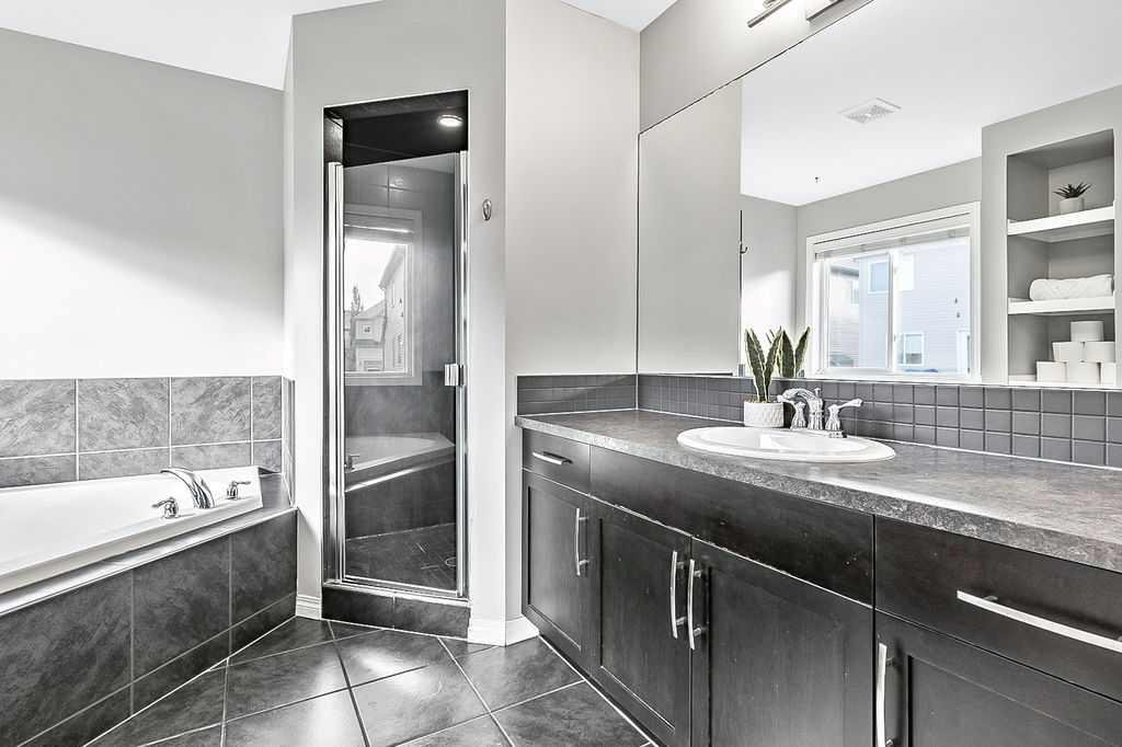 The upper level boasts three spacious bedrooms, two of which include unique sitting areas that overlook the expansive park, providing a serene and private retreat. The primary bedroom has ample room and includes an elegant ensuite with a corner soaker tub, a full tile shower, and a large vanity designed for comfort and luxury.