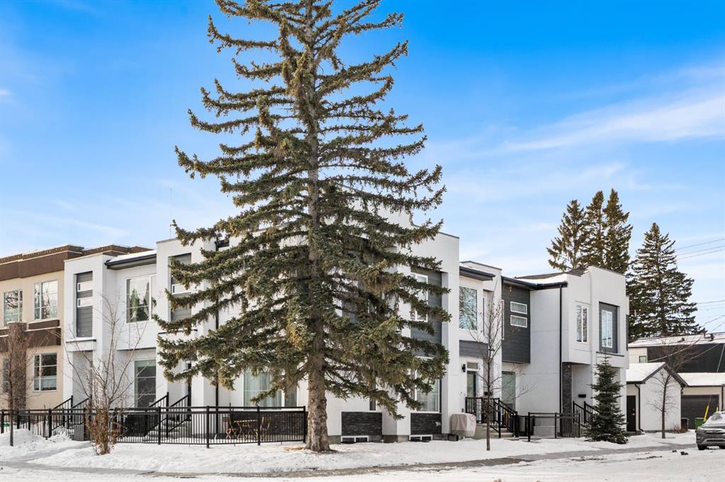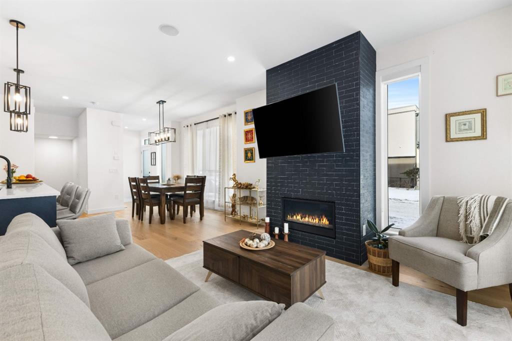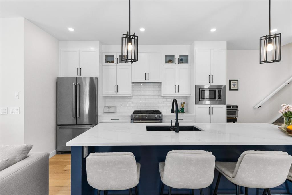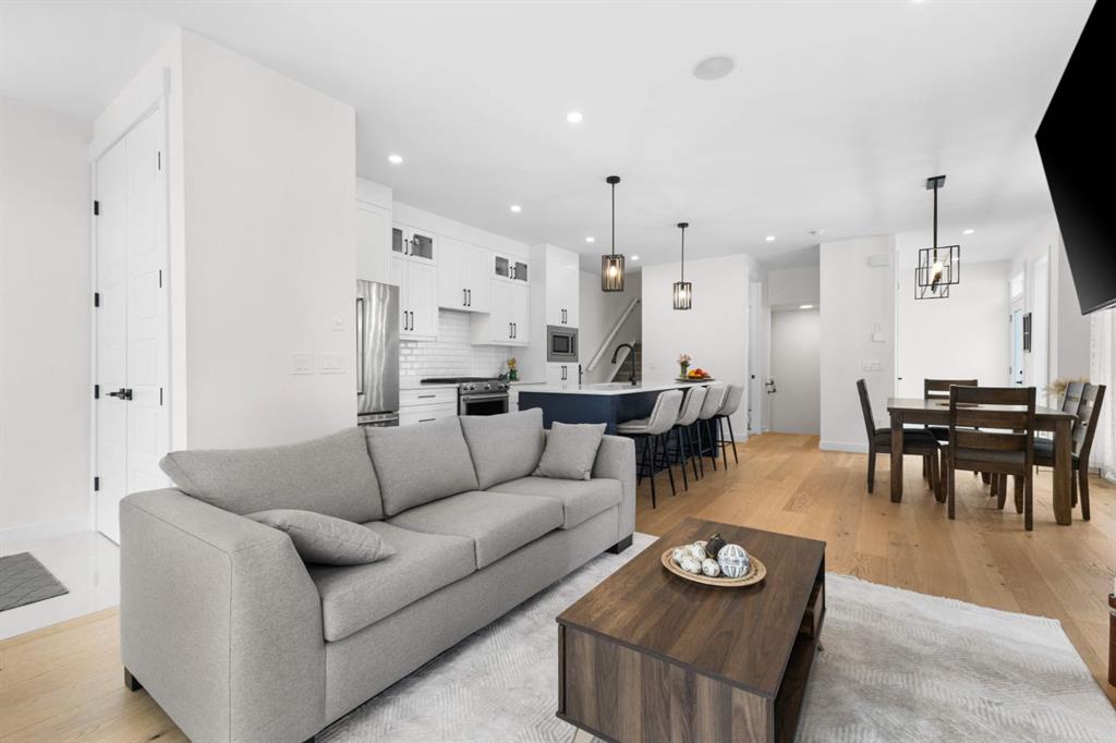 OPEN HOUSE SATURDAY, JANUARY 10TH FROM 1-4 PM. An absolutely pristine 3+1 bedroom corner unit townhome in the established community of Killarney offering over 1500 sq ft of developed living space. The bright & airy main level presents wide-plank hardwood floors & plenty of natural light, showcasing the living room anchored by a floor to ceiling fireplace, spacious dining area & kitchen that’s tastefully finished with quartz counter tops, Subway tile backsplash, crisp white cabinetry, island/eating bar & stainless steel appliances. A 2 piece powder room & mudroom with separate entrance complete the main level. The second level hosts 3 good-sized bedrooms, a 4 piece bath & convenient laundry facilities. The spacious primary retreat boasts a walk-in closet & private 4 piece ensuite with dual sinks & oversized shower. Basement development includes a family/media room with wet bar – perfect for game or movie night. A fourth bedroom & 4 piece bath are the finishing touches to the basement. Other notable features include central air conditioning, built-in speakers throughout, front gated patio & a single detached garage. This upscale townhome is conveniently located across from Killarney/Glengarry Community Centre & close to schools, shopping, public transit, Shaganappi Point Golf Course. There’s also effortless access to Richmond Road & Crowchild Trail.