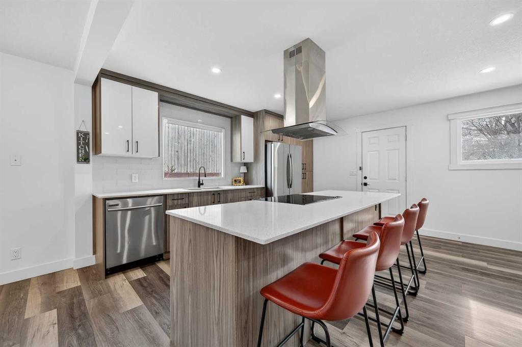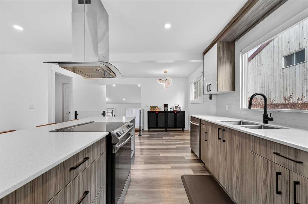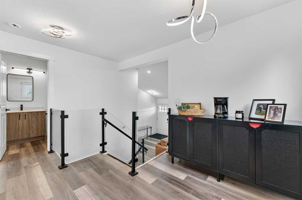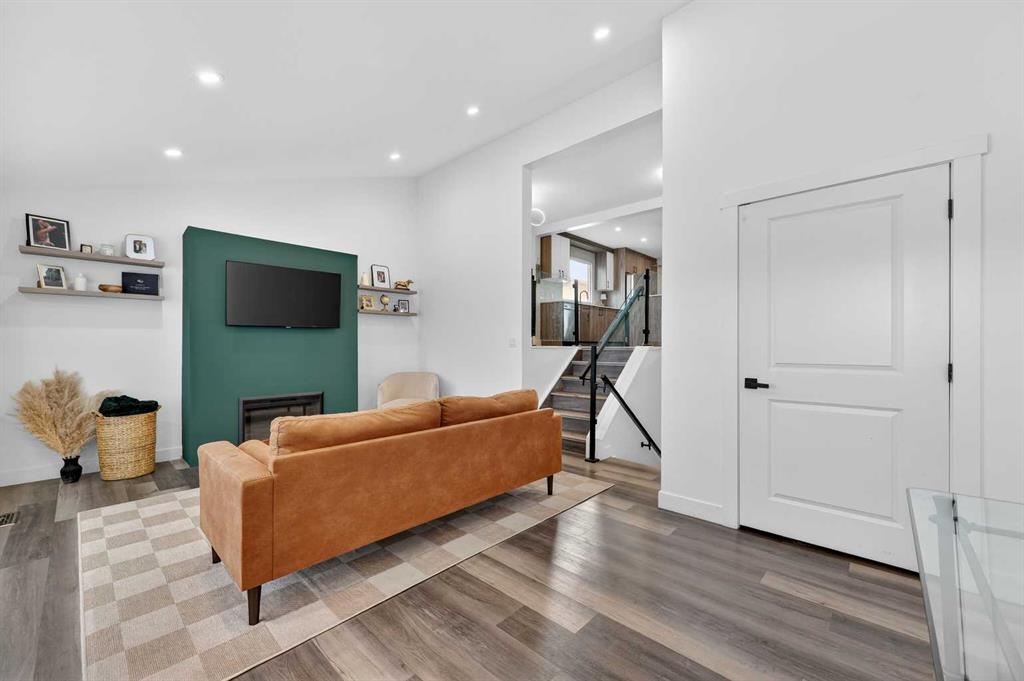 The main level features soaring vaulted ceilings and large windows that fill the space with natural light. The open-concept living and dining area is ideal for entertaining or relaxing at home. Just a few steps up, the elevated kitchen overlooks the living space through sleek glass railings, adding architectural interest and a sense of openness. Complete with stainless steel appliances, quartz countertops, and a large central island, this kitchen is both practical and impressive.