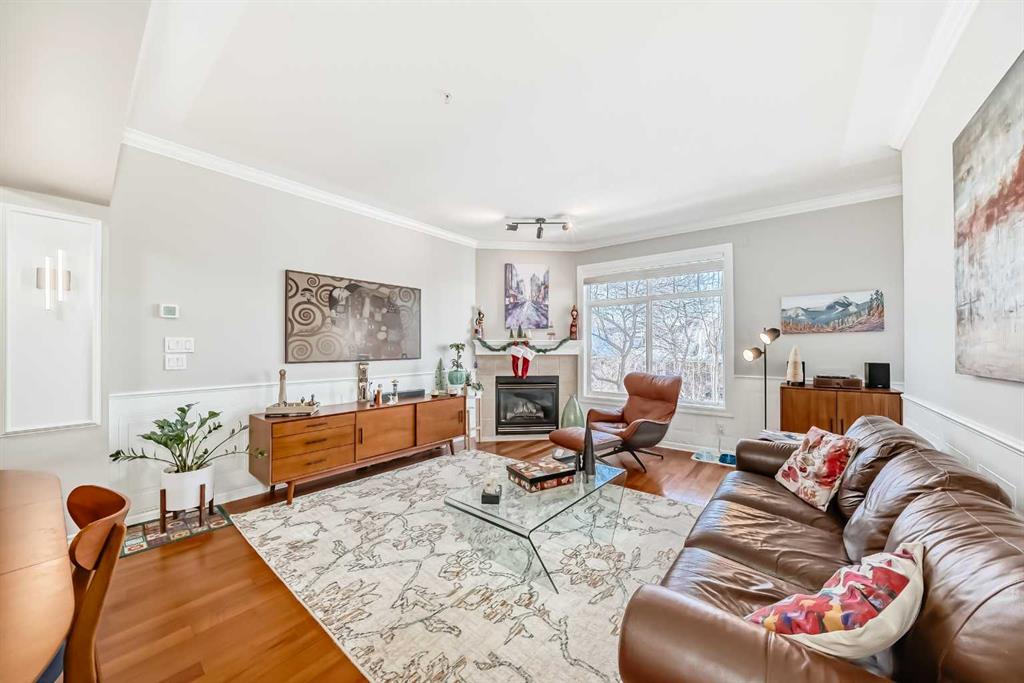 Located on the 3rd floor, the suite offers an open-concept layout that flows easily from the kitchen into the main living area. The kitchen features a breakfast bar, generous cabinetry, and granite countertops. The adjoining living and dining space is bright and inviting, with high ceilings, a cozy gas fireplace, and access to one of the balconies. In-floor heating beneath engineered hardwood keeps the main living area warm and comfortable.