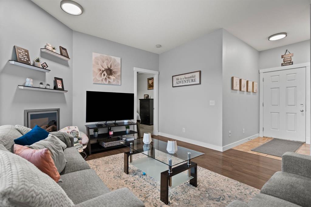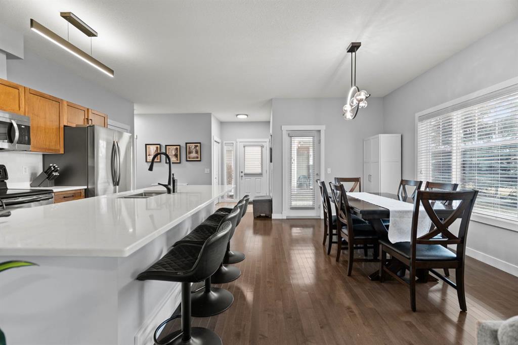 OPEND HOUSE SUNDAY 2PM-4PM! A RARE OPPORTUNITY to live in an UPDATED main-level BUNGALOW BACKING ONTO GREENSPACE! This sprawling 3 BEDROOM, 3 BATH home provides over 2,000 developed square feet! Offering an abundance of natural light and overlooking a serene park. You will immediately notice the soaring 9’ ceiling, gorgeous hardwood floors, stylish lights, fresh paint and open floor plan. The modern kitchen is a focal point with solid maple cabinets, a timeless subway tile backsplash, sleek stone counters and upgraded stainless steel appliances. This has a flush eating bar that seamlessly connects to the spacious dining room. Which provides direct access to your patio with a convenient BBQ gas line and surrounded by mature trees to add additional privacy. Adjacent to the dining room is a spacious living room featuring a charming gas fireplace. On one side of the home is the well sized primary with a walk in closet and its own updated ensuite including new stone counters, tile backsplash, and upgraded plumbing fixtures. Well on the other side is the additional bedroom or office, with a 4pc updated main bathroom. Completing this level is a mudroom space with access to your attached garage. The basement has several large windows and an expansive rec room, making it ideal for entertaining. Completing the space is a third bedroom, 3 pc bath and laundry room. This home is in the highly sought-after Cougar Ridge community close to transit, great schools, Canada Olympic Park, Westside Rec Centre, plenty of restaurants and shops in West 85th shopping district and pathways. Enjoy quick access to downtown, or the mountains via Stoney Trail. Offering the lock and leave lifestyle you want in a pet friendly property with affordable condo fees. Schedule your private showing or view the virtual tour.
