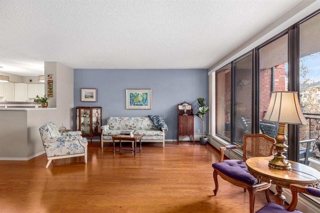 Welcome to Sunward Estates in the heart of Lower Mount Royal. This 3rd floor unit features a functional floor plan across 1400sq.ft with an open living and dining area, an updated kitchen and spacious balcony overlooking the avenue. French doors lead to a generous home office. The primary bedroom has a 4 piece ensuite, double closets and private balcony. A large second bedroom and main bathroom, in suite laundry and storage room complete the unit. Features include beautiful hardwood floors, a wall of windows, new window coverings throughout and updated lighting. This condo is in immaculate condition and move in ready.