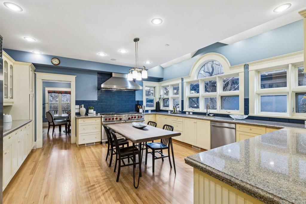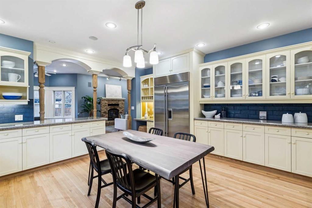 Perfectly positioned in the heart of Elbow Park just steps from the Glencoe Club, this distinguished Queen Anne–style residence offers a rare opportunity to plant roots in one of Calgary’s most cherished family neighbourhoods. Set on an exceptional oversized lot with coveted 75’ frontage and a sun-drenched west-facing backyard, this is a home where children can walk to social activities, swimming, skating, or tennis lessons at the Club. This is a home for generations to gather for the holidays, celebrations, and everyday living. Rich in warmth and architectural authenticity, the home was masterfully built in 1993 to reflect and respect the historic charm of Elbow Park, showcasing timeless design through its classic center hall plan, gabled rooflines, wrap-around veranda, and signature hexagonal tower feature. Inside you’ll find extensive wainscotting, crown moulding, decorative tile-work, and elegant 9’ ceilings. The main floor unfolds beautifully for both entertaining and daily life, with a living room anchored by a wood-burning fireplace and charming bay window, and a gracious dining room across the entry. The kitchen presents remarkable opportunity with its stunning wall of south-facing arched windows, premium Wolf double oven range, Sub-Zero refrigerator, and generous cabinetry, all offering exceptional space and flow for future personalization. A sun-filled breakfast nook wrapped in windows within the tower opens to a cozy family room with built-in bookcases and brick fireplace, creating a natural gathering space. A generous, quiet office with clerestory window, a powder room, and practical mudroom complete the level. Upstairs, a flexible lounge or homework area supports busy family life, while the expansive primary retreat offers a private sanctuary with a fireplace, dual walk-in closets, and a breathtaking turret sitting area with south and west views beneath a vaulted hexagonal ceiling. Three additional spacious bedrooms, full bath, and upper laundry room enhance functionality for growing families. The fully developed lower level adds approximately 1,535 square feet of versatile living space including a recreation area, media room and built in cabinets and bookcases. A fifth bedroom is an ideal room for guests, teens, or live-in support, and the bathroom has a secondary laundry. With refinished hardwood floors, new carpeting, and Poly-B plumbing already removed, this home offers the rare advantage of being move-in ready while allowing thoughtful updates over time, a far easier and faster process than building new in this premier location. Surrounded by mature trees and exceptional outdoor living spaces including a large south patio with fire-pit, lawn, side driveway, and a heated triple detached garage, this is a legacy property where lifestyle, community, and opportunity come together beautifully.