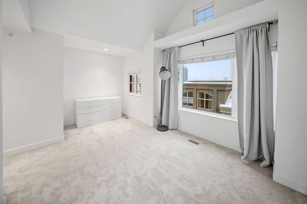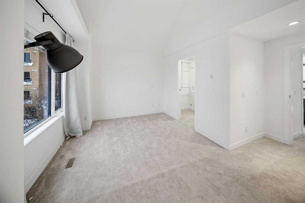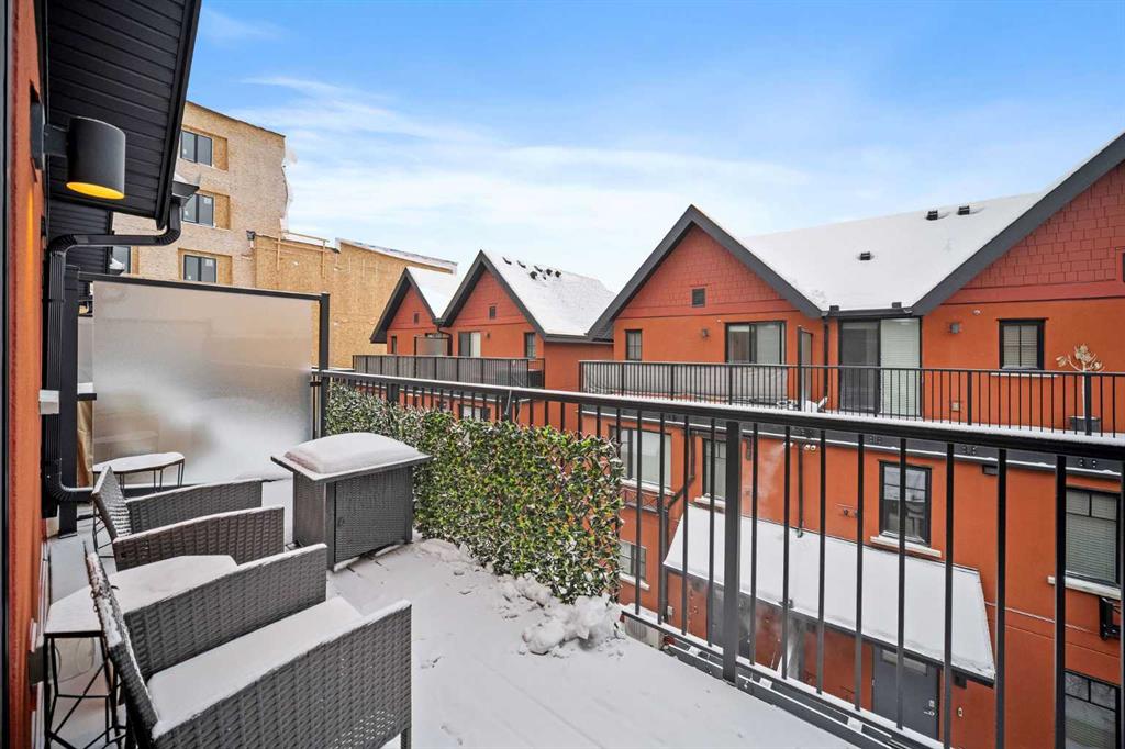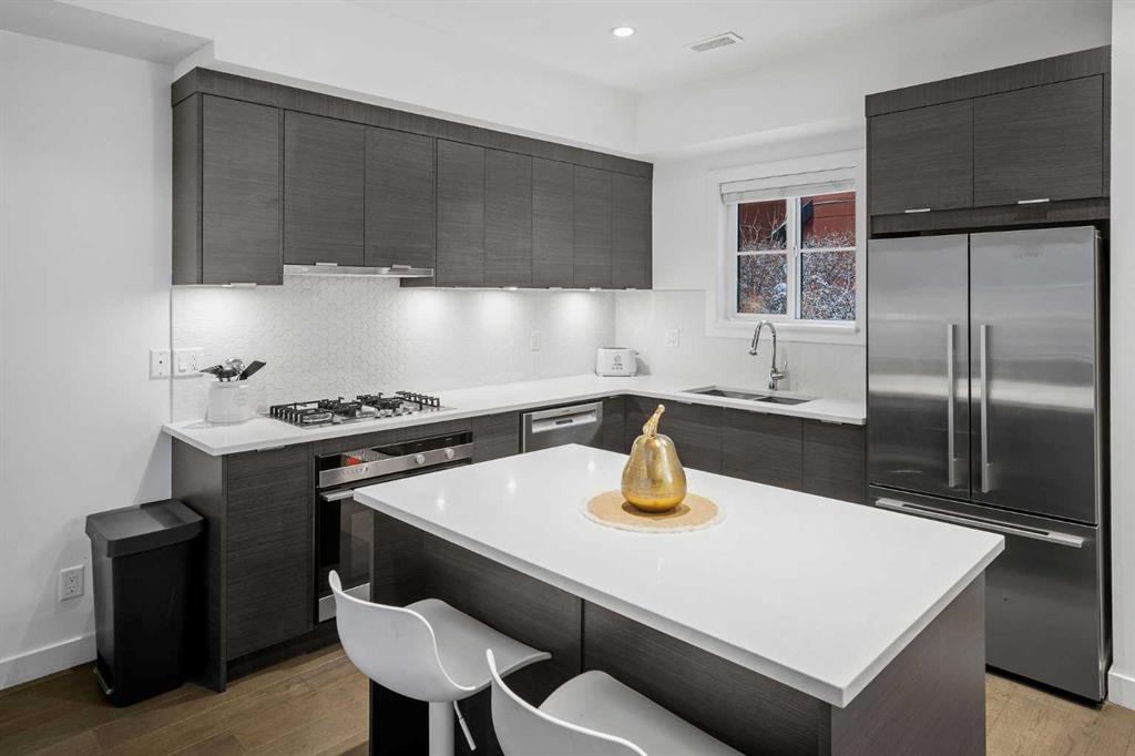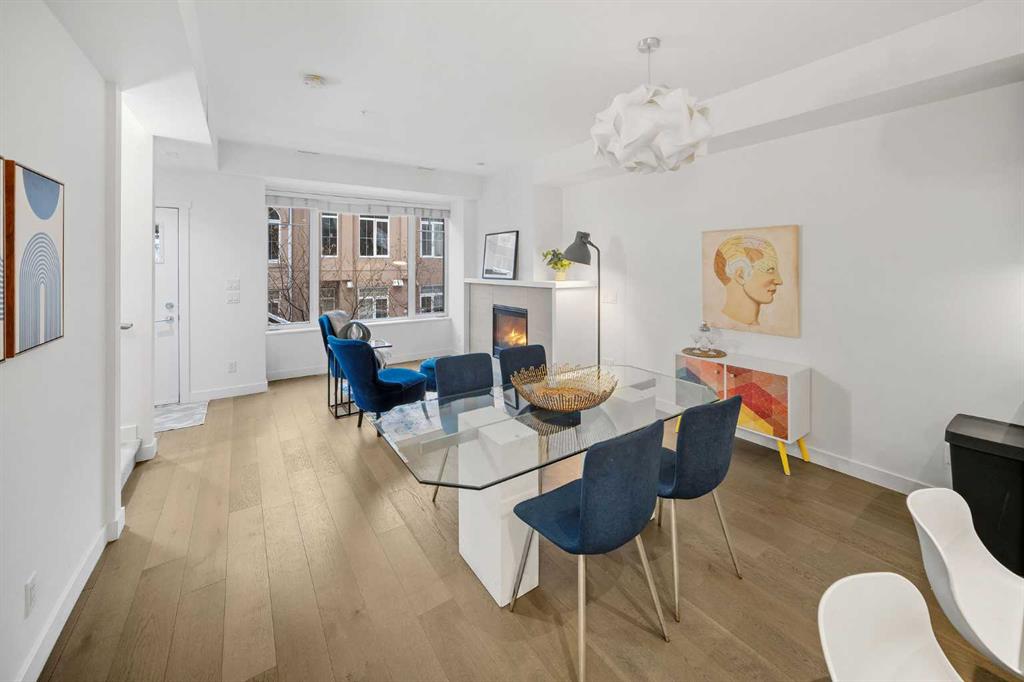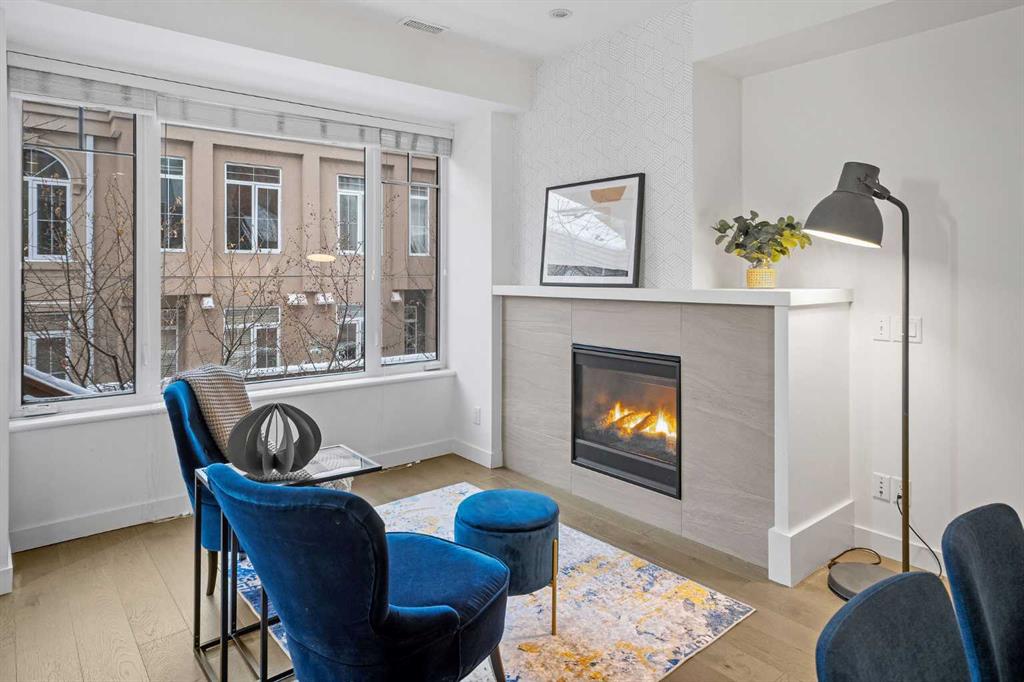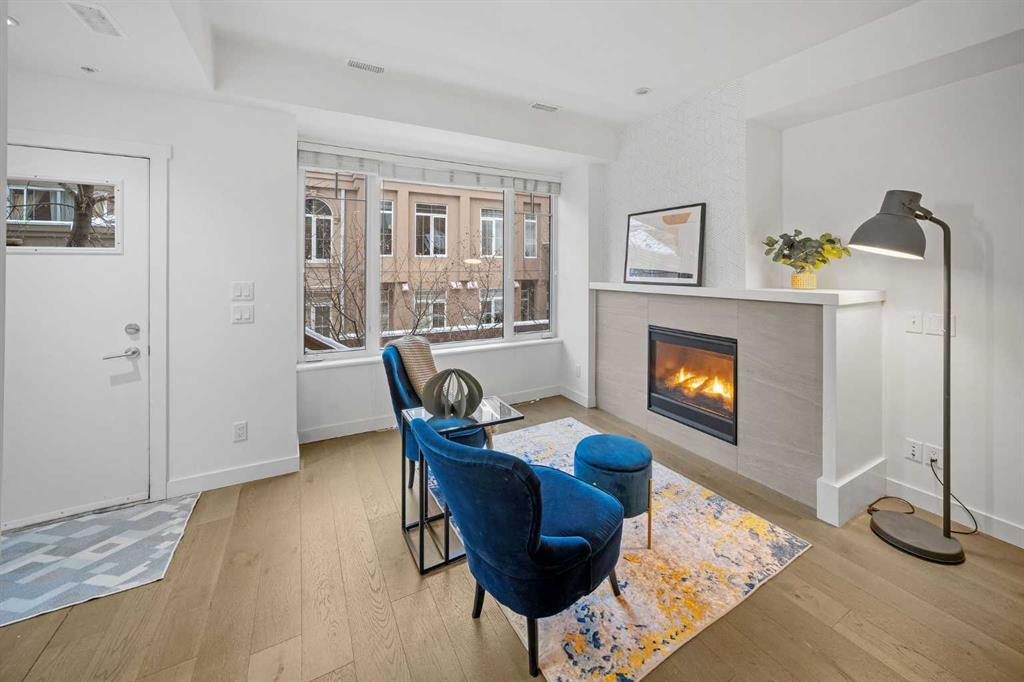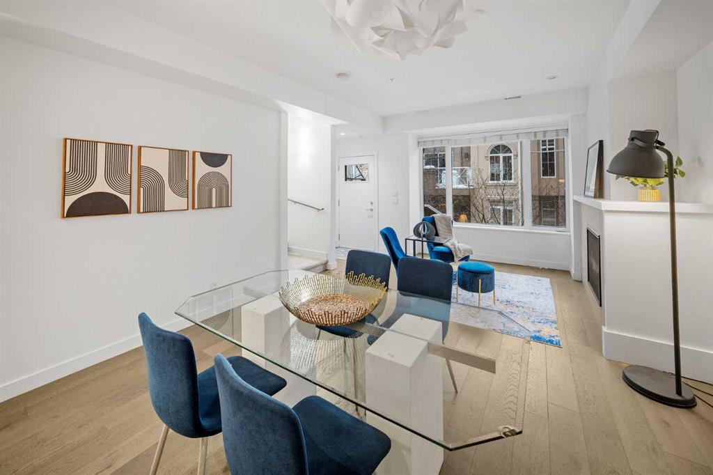 Three bedrooms, two bathrooms, dedicated storage, and titled parking come together in a boutique brick row building with subtle brownstone vibes and classic urban styling. This townhome blends vibrancy, privacy, and low maintenance living in one of Calgary’s most walkable locations. Just moments from the energy of 17th Avenue and the Beltline, you are surrounded by fabulous local dining, cafes, boutique fitness, and everything that makes inner city living so coveted. Tucked away from the street for added peace, the secure setting of the building creates an inviting atmosphere where, in the warmer months, neighbours often unwind on their own private terraces with barbecues or a glass of wine, adding a warm community feeling while maintaining personal privacy. Inside, this home offers the spaciousness of a traditional layout with the ease of condominium living. The modern kitchen features quartz counters, stainless steel appliances including a five burner gas range, generous cabinetry, a breakfast bar for casual meals, and the option to take dinner parties to the dining table that easily seats six. It all flows naturally into the inviting living area where a cozy gas fireplace anchors the room. The second level includes two comfortable bedrooms, a four-piece bathroom, and full size laundry. One more level up is the dedicated entirely to the primary retreat, the true showstopper of the home. This primary bedroom feels both serene and elevated with its soaring vaulted ceilings, wrapped in windows and offers a truly calming sense of space. A generous walkthrough closet offers abundant hanging space and leads to the relaxing spa inspired ensuite complete with double vanities, a glass shower, a deep soaker tub, and the added luxury of heated floors. Topping off this decadent level is the private balcony, perfectly positioned to overlook the front courtyard while capturing beautiful westerly views. The lower parkade entry level has a spacious flex or storage room which provides loads of shelving for effortless organization. This home also includes two additional outdoor lounging spaces; A charming backyard area offers a quiet spot for al fresco dining and relaxing, while the welcoming front terrace is ideal for morning coffee, evening wine, and summer barbecuing with friends. Small pets are welcome too (with board approval), and some owners have created a cute outdoor relief spot in their backyard – on leash or with board approved fencing, ideal for quick winter outings with your furry friend. Your secured and titled indoor/heated parking stall is conveniently located beside your parkade door with room for a bike. This beautifully maintained unit is also offered turn-key (move-in ready) with it’s furnishings & all kitchen items … for a seamless move. With only nine units in the building and close proximity to parks, schools, gyms, hot yoga, shopping, transit, and major routes, this home delivers elevated inner city living at its finest.