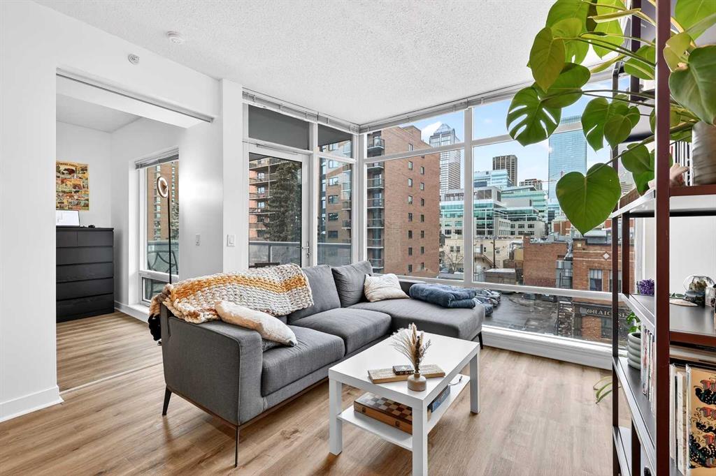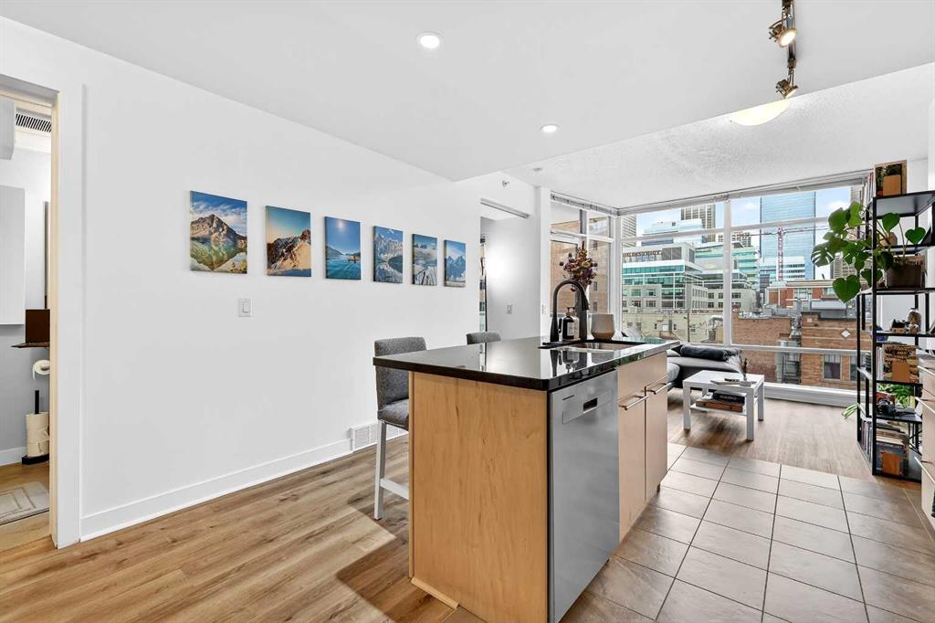 Floor-to-ceiling windows flood the home with natural light and showcase stunning panoramic views of the downtown skyline. Thoughtfully finished with warm-toned millwork and durable luxury vinyl plank flooring, the space feels both modern and inviting.