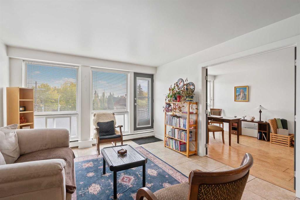 Welcome to this spacious 2-bedroom, 1-bath unit that offers over 860 sq. ft. of thoughtfully designed living space in one of Calgary’s most vibrant inner-city communities. Located on the top floor of a solid concrete building, this corner unit is filled with natural light from multiple exposures and enjoys downtown views from its northeast-facing balcony. Inside, the open-concept kitchen is both stylish and functional, featuring stainless steel appliances including a new Miele dishwasher, espresso cabinetry, modern hardware, soft-close drawers, a breakfast bar, and plenty of cabinet and counter space. The kitchen flows seamlessly into the dining area and living room, where large windows brighten the space. Tile flooring flows throughout for easy upkeep, and the bedrooms are lined with warm cork. From the living room, French doors open to the second bedroom that can be used as a home office, complete with cork flooring and a closet. The spacious primary bedroom offers a large closet and sits next to 4-piece bathroom with soaker tub and a full-size LG washer/dryer combo, adding everyday convenience. There’s also a deep in-unit storage closet, perfect for keeping your belongings organized. Additional shared storage is available in the building. This pet-friendly condo welcomes your furry friends (no size restrictions, board approval required), and nearby off-leash dog parks make it easy to get outside and explore. Covered parking is included, with the option for additional permit parking out front.