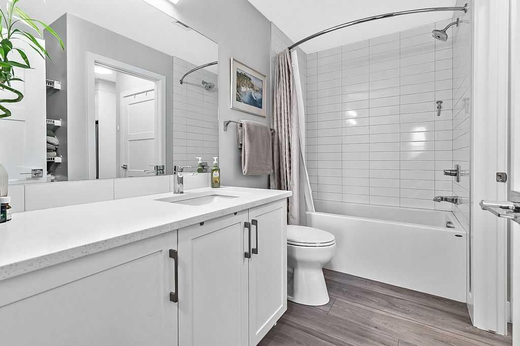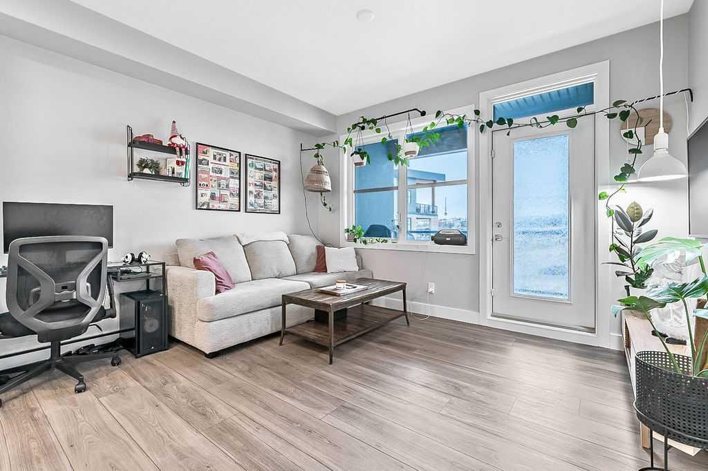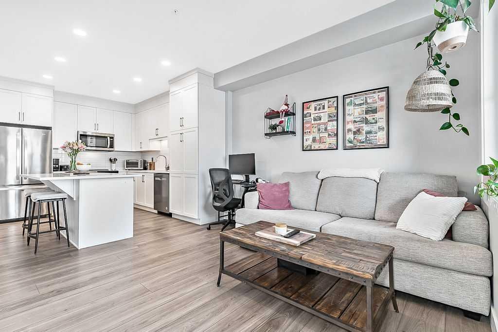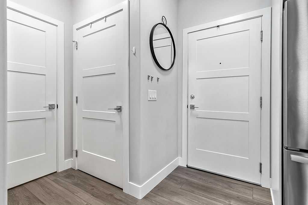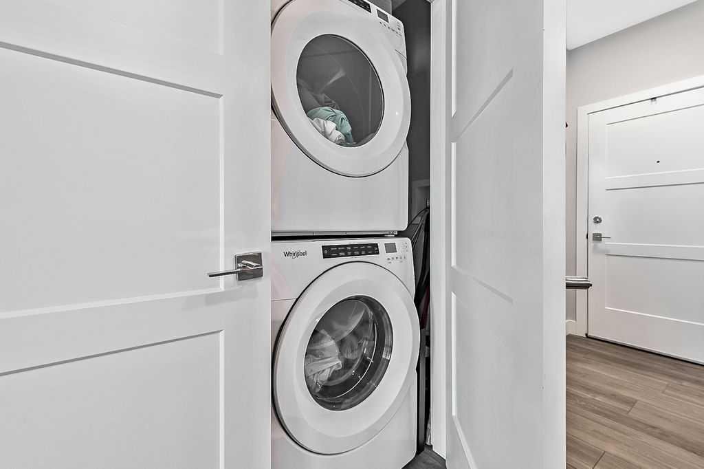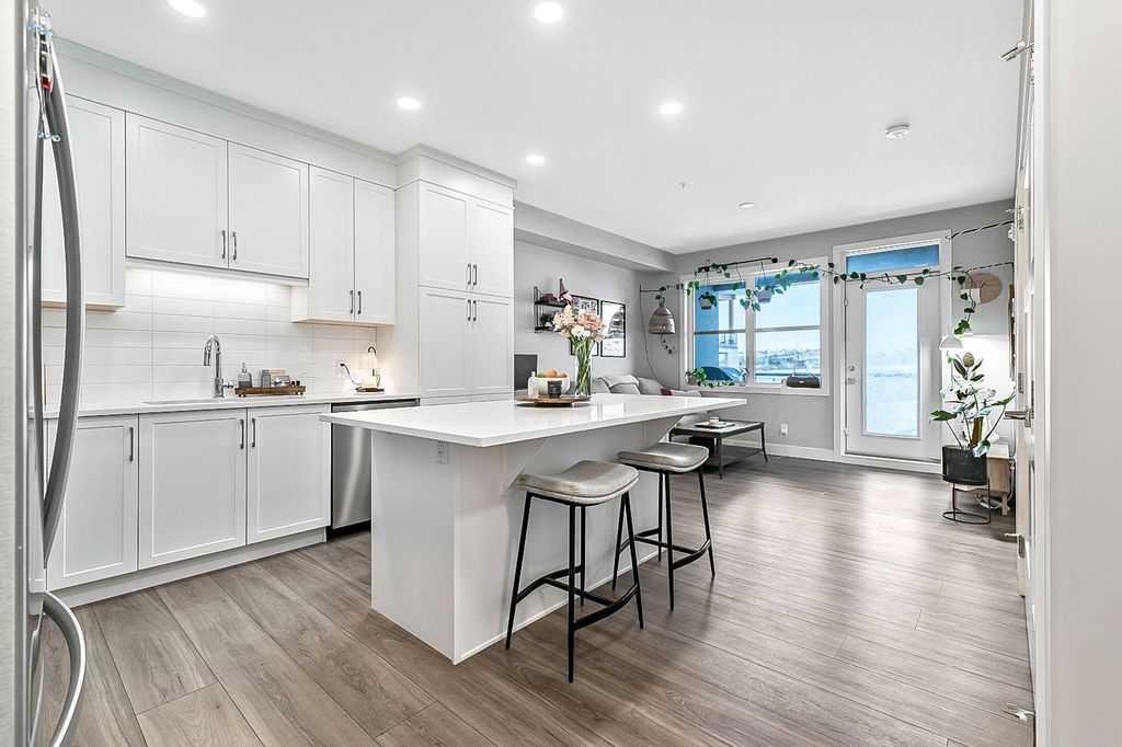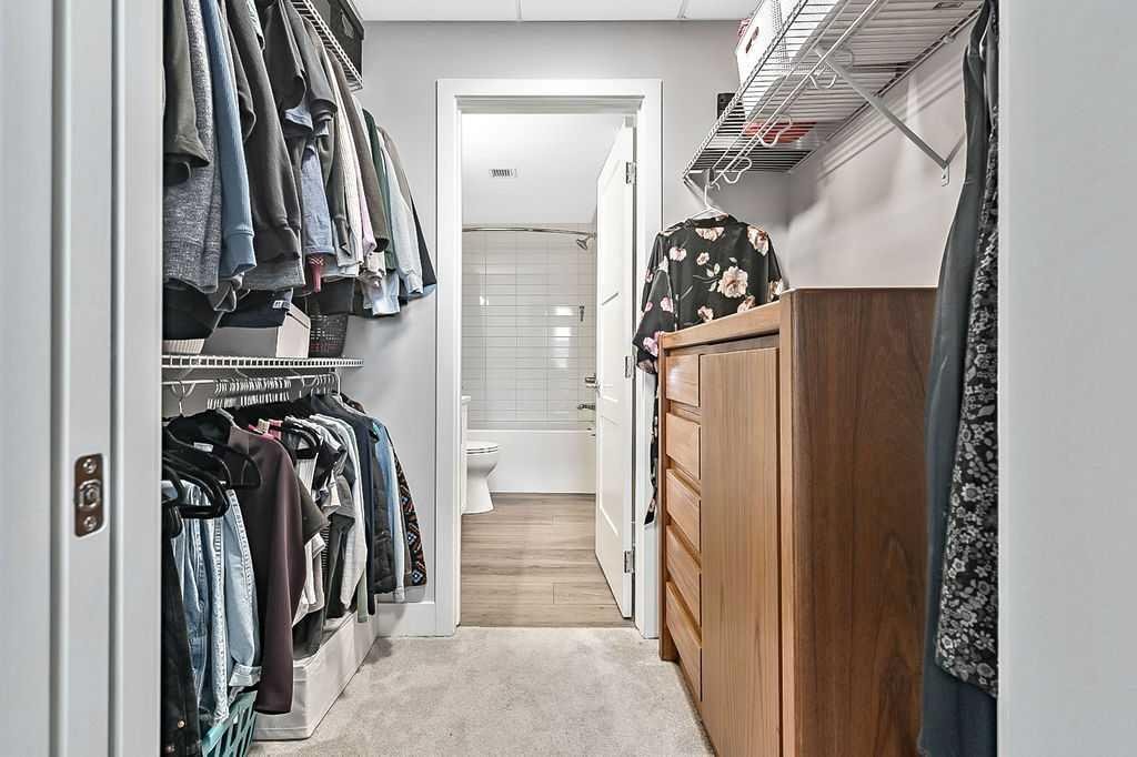 Welcome to stylish, low maintenance living in the heart of Calgary. This beautifully upgraded one bedroom condominium offers the perfect balance of modern finishes and everyday functionality, ideal for first time buyers, investors, or anyone looking to simplify without sacrificing style. From the moment you step inside, you will appreciate the bright open layout, enhanced by large windows and luxury vinyl plank flooring that flows throughout the main living space. The atmosphere is warm and inviting, with a layout designed to make the most of every square foot. The kitchen is sure to impress with 40 inch upper cabinets extended to the ceiling with filler, sleek quartz countertops, stainless steel appliances including a fridge with ice and water, and generous cabinet and counter space. Whether you love to cook or prefer to entertain, this kitchen delivers both beauty and practicality. The in suite laundry is thoughtfully tucked away in its own dedicated closet, keeping everything neat and out of sight. The spacious living room has patio doors to your private balcony, offering room for comfortable seating and complete with a gas line for your BBQ. It is the perfect place to relax at the end of the day or host friends on warm evenings. The bedroom easily fits a king size bed and features a convenient walkthrough closet leading to the elegant four piece bathroom. Here you will find quartz counters, excellent storage, and tile that extends to the ceiling in the tub and shower, creating a polished, upscale feel. This home also includes a prime end unit parking stall in the heated parkade, complete with additional storage and the added bonus of a private EV plug. The pet friendly building welcomes your furry companions with approval. Set within a walkable community filled with scenic pathways, easy access to transit and the LRT, and an array of shops, restaurants, and amenities just steps away, the location is truly exceptional. You may find you rarely need your car. With modern upgrades, smart design, and an unbeatable setting, this is an incredible opportunity to enter the Calgary market in style.