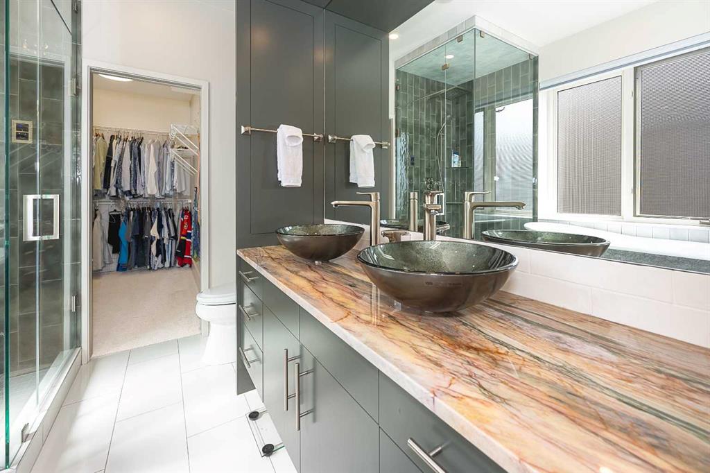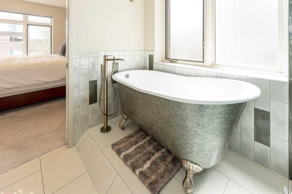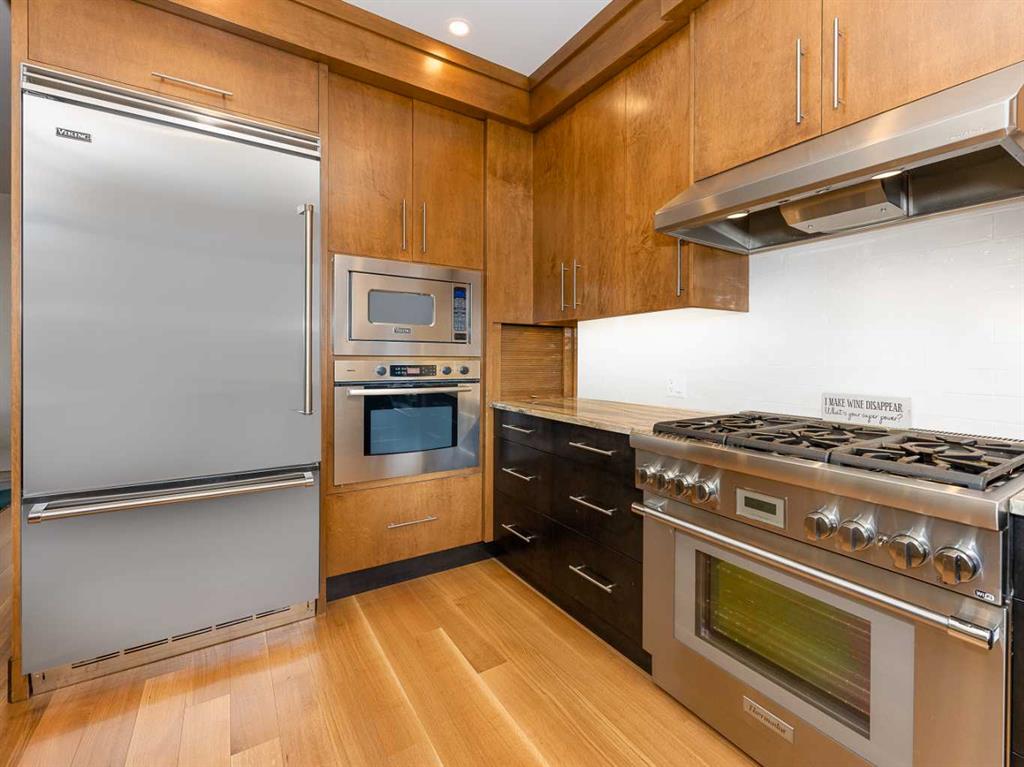 Luxury and sophistication converge in this meticulously renovated penthouse in the heart of Hillhurst. Just steps from Kensington’s vibrant shops and restaurants, the Bow River pathways, and the downtown core, this exceptional residence offers an elevated urban lifestyle. Situated in the boutique 12-unit Villagio building, constructed with superior ICF for outstanding soundproofing and energy efficiency, the home features a semi-private elevator that opens directly to the unit’s entrance. A grand foyer with soaring ceilings and an overhead skylight sets the tone as you enter this impressive two-level residence. The open-concept design is highlighted by dramatic 18-foot ceilings and a stunning south-facing wall of windows that fills the space with natural light. The central living room showcases a custom stone gas fireplace and a striking imported 120-piece hand-blown glass chandelier. Patio doors lead to one of two south-facing outdoor spaces, ideal for relaxing or entertaining. The chef’s kitchen is a true showpiece, featuring premium appliances including a Thermador dual-fuel gas range, Sapphire dishwasher, Viking refrigerator, and built-in microwave. Hand-selected quartzite countertops complement the space, while imported custom light fixtures add refined character. Adjacent to the kitchen, the dining area features a custom wine display with oak racking and a built-in buffet complete with a wine fridge and quartzite counters. A distinctive custom light fixture adds warmth and elegance to the space. The main-level primary retreat offers built-in cabinetry and a luxurious spa-inspired ensuite with dual sinks, Hansgrohe fixtures, quartzite countertops, a steam shower, and a custom cast-iron slipper tub. The suite is completed by a spacious walk-in closet. A powder room and convenient laundry area complete the main floor. The upper level features a second bedroom with access to a large in-suite storage room, a three-piece bathroom, and a versatile flex space ideal for a home office. A catwalk overlooking the living area below leads to patio doors that open onto the second south-facing patio, creating another private outdoor retreat. Extensive renovations throughout the home include new quarter-sawn engineered oak flooring on the main level, newer carpeting upstairs, modern railings overlooking the living room, fresh paint, and new remote-controlled window coverings. Comfort is enhanced by a newly installed Fujitsu mini-split four-zone inverter system, providing flexible climate control with independent heating, cooling, or fan settings for individual areas. The unit also includes two titled parking stalls, both generously sized to accommodate a full-size truck. This remarkable penthouse must be experienced in person to be fully appreciated.