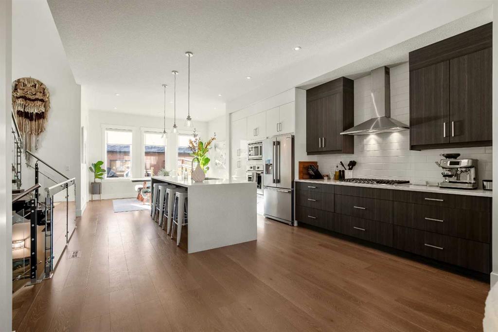 EXCLUSIVE HOME IN TUXEDO PARK | SHOW HOME STATUS | GREAT LOCATION | TONS OF UPGRADES + MUCH MORE! This home has been well maintained & upgraded to mirror a Show Home level of integrity + presents a rare opportunity to own a high end property in an excellent inner City location. Not far from amenities, schools & major routes, yet tucked into the vibrant & established neighbourhood of Tuxedo Park, this property offers the best of City living. This impressive home extends to 1,909 sq ft above grade, has been highly upgraded & delivers a fully developed basement (an extra 831 sq ft). The 4 Bedrooms & 3.5 Bathrooms will undoubtedly suit you & your family, delivering space, comfort & a flowing design throughout. The stucco/brick exterior creates a striking curb appeal that will hone the quality of craftsmanship + your pride of ownership. Inside the open concept main floor vibrantly flows & soars with 10 foot ceilings, wide plank oak hardwood flooring & invites plenty of natural light through large windows, making it ideal for both everyday living & entertaining. The kitchen is the true heart of the house, featuring a waterfall countertop, a built-in wall oven, a built-in microwave, a gas range cooktop + ample cabinetry for storage. Built-in shelving throughout the home adds both style & functionality, while the upgraded 10 mil glass railing enhances the vibe & creates a more modern design. Other notable items to mention: The primary ensuite offers a private retreat, with a spa inspired demeanour, featuring in-floor heating & a calming, luxurious feel. The basement is fully developed with an open media/rec room that is perfect for watching the big game- This area is ideal for entertaining, relaxing or hosting family/friends. Soak up the sun while enjoying your morning coffee in this south facing backyard. The 20×20 detached garage is heated, providing convenience over the colder months + the interior of the home is temperature controlled with A/C during Calgary’s hotter months. The high spec party wall exceeds building code requirements, contributing enhanced soundproofing & privacy with the adjacent unit. Did I mention there is 3 gas fireplaces, 1 for every level! It is safe to say this property is best appreciated in person. Come take a look & experience everything it has to offer!