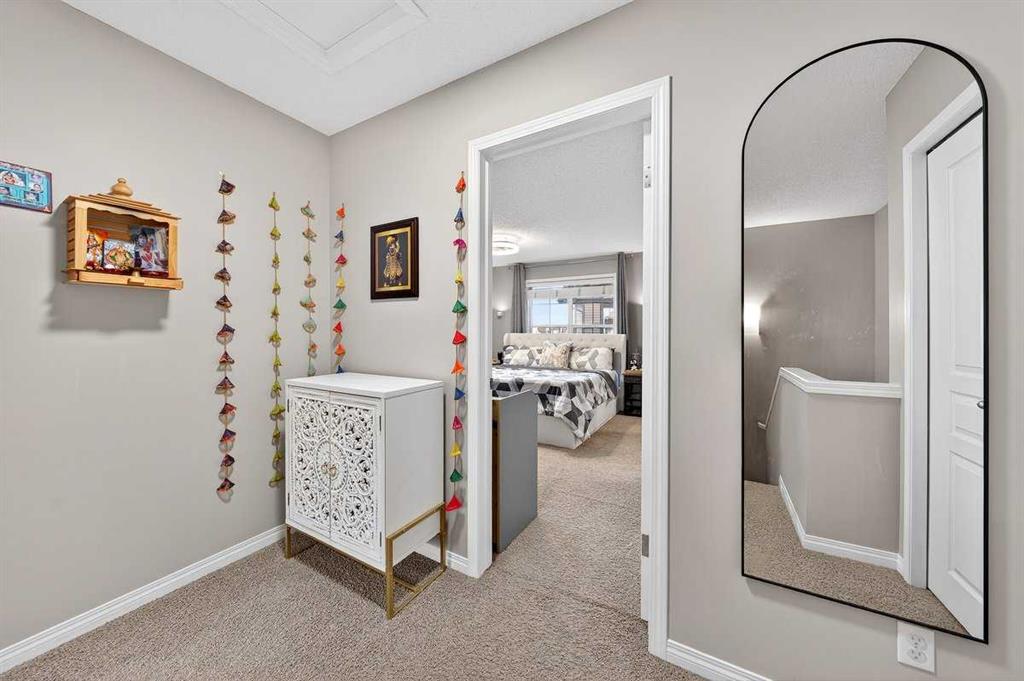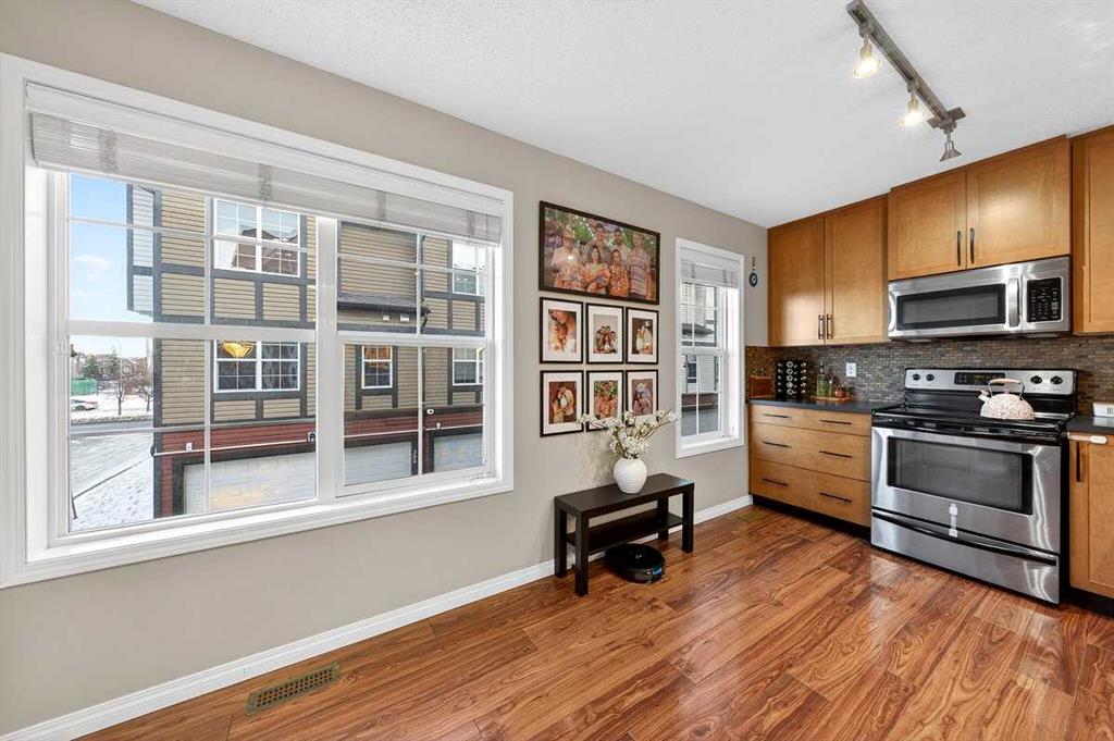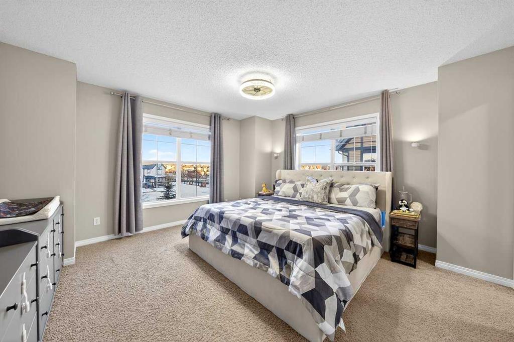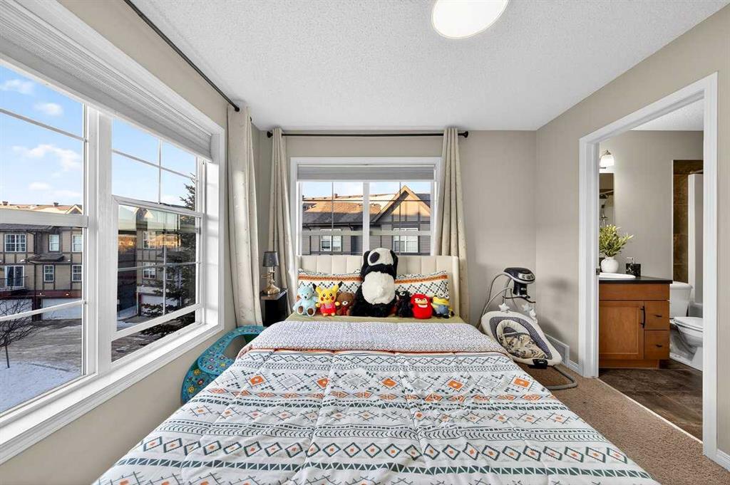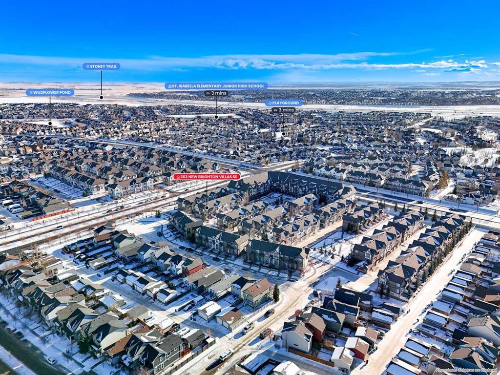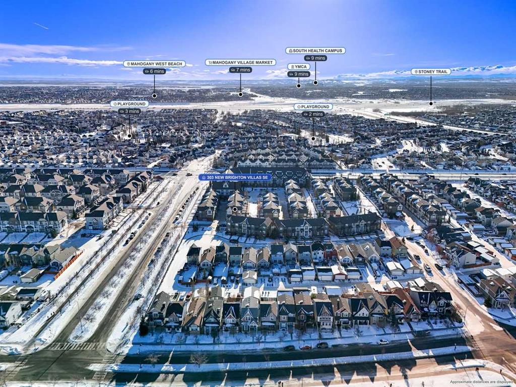 *** OPEN HOUSE SATURDAY JANUARY 10TH AND SUNDAY JANUARY 11TH 12-4 PM *** Welcome to your new home at 303 New Brighton Villas SE! A truly impressive and majestic end unit townhome that immediately captivates right as you enter with its high ceiling, tiled entryway, stunning chandelier, and an abundance of natural light streaming through the extra windows that only an end unit like this can offer. The bright, airy, and thoughtfully designed open concept main level is ideal for both everyday living and entertaining, featuring a spacious living room that flows effortlessly into a dining room and beautiful kitchen with ample cabinetry, generous counter space, and a convenient breakfast bar. A 2 piece bathroom completes the main floor, while air conditioning ensures year round comfort throughout your home. Adding exceptional value and convenience is the fully drywalled double attached garage, perfect for secure parking that can fit 2 bigger SUV’s and additional storage. Upstairs, the home truly shines with two impressively large primary bedrooms, each designed as its own private retreat, both complete with a walk in closet and a full ensuite bathroom, a rare and highly desirable layout that offers outstanding comfort, flexibility, and privacy. Pride of ownership is evident throughout with numerous updates including a new hot water tank (2022), dishwasher (2022), microwave hood fan (2023), hand held shower head (2023), washer and dryer (2023), and all lighting upgraded in 2023. The well managed complex has also seen a full roof replacement approximately three years ago, offering peace of mind while maintaining impressively low condo fees. Enjoy the charming front patio for relaxing mornings or evenings, and take advantage of the unbeatable location in the vibrant community of New Brighton, close to playgrounds, schools, walking and biking paths, and nearby shopping plazas. This is a home that feels special from the moment you arrive and continues to impress at every turn. Make it yours today!
