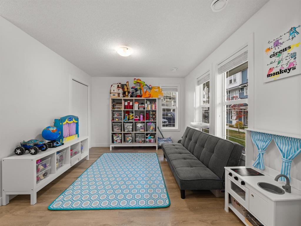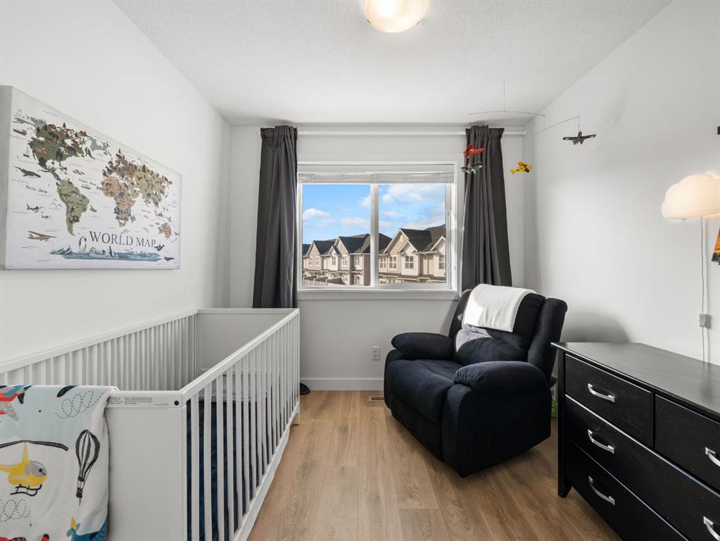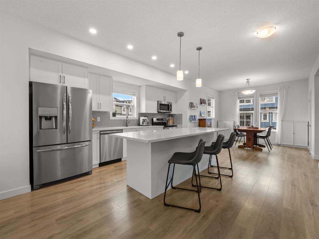 Welcome to this large, fully finished, CORNER UNIT townhome in the heart of Copperfield! This 3 bedroom 3.5 bathroom home blends modern design with everyday comfort. The bright open concept home features upgraded pot lights, wide plank laminate flooring (carpet only on stairs), an electric fireplace, and a spacious kitchen with quartz countertops, stainless steel appliances, herringbone backsplash, large island, and an induction stove with a gas line available if preferred. The rare WRAP AROUND SOUTH FACING balcony is perfect for relaxing or entertaining and includes a gas line for your BBQ. The lower level flex space with a full bathroom offers endless possibilities for a home office, gym, living room, or guest area. Upstairs, all 3 bedrooms let in a ton of natural light and the primary suite features a double sink ensuite and walk-in closet. Additional highlights include AIR CONDITIONING, a water filtration system, upgraded shaker style cabinetry, vanity with extra storage in the powder room, extra windows, and a DOUBLE ATTACHED GARAGE with a MAN DOOR and extended driveway; rare to only specific corner units in the complex. Ideally located just a 3 minute walk to Copperfield School, close to parks, pathways, and all community amenities, this bright and well maintained home is move in ready. Reach out to book your showing today and make sure to check out the 3D Tour!