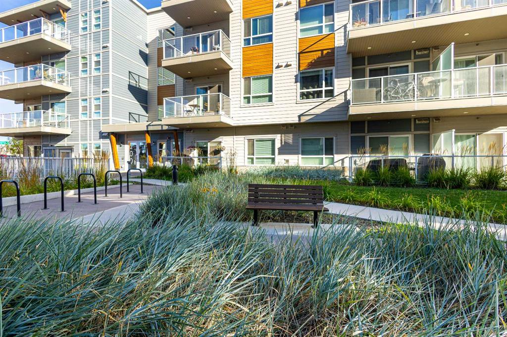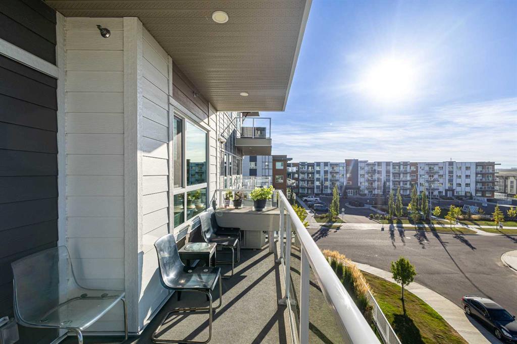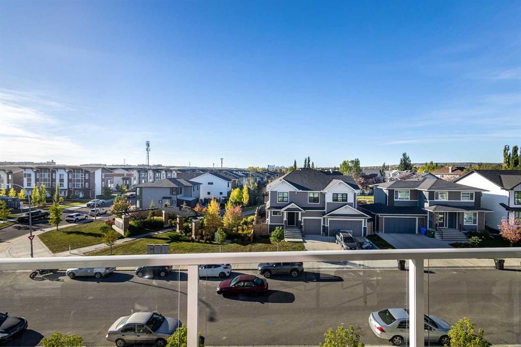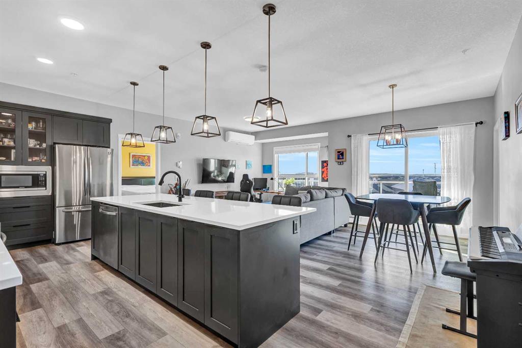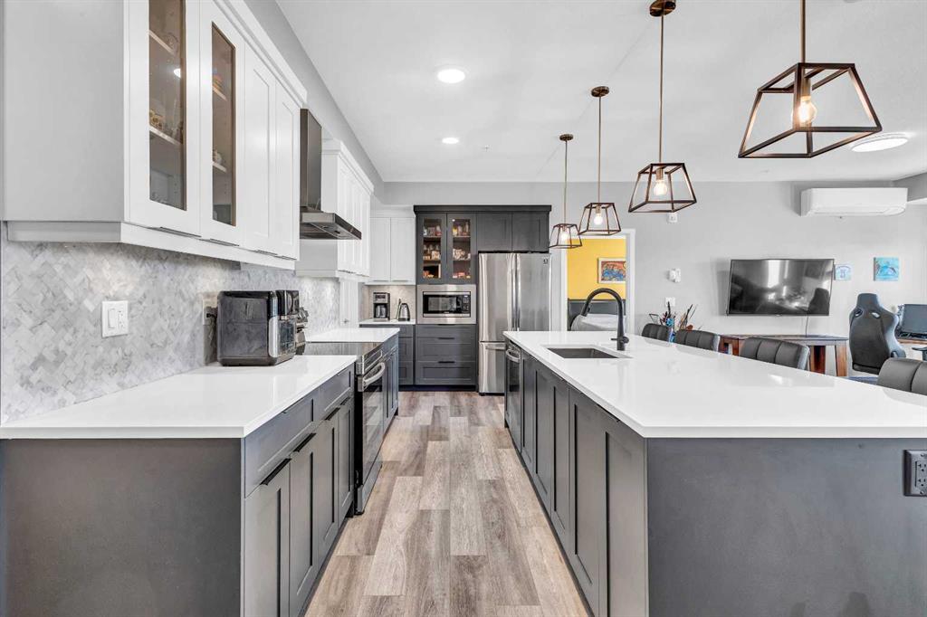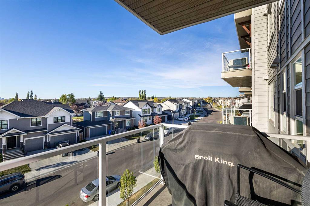 Welcome to this immaculate, like-new condo in The Rise, an award-winning building by Cedarglen Living.Offering THREE bedrooms, TWO bathrooms, and 1,165 sq. ft., this thoughtfully designed home combines modern finishes, functional living, and a low-maintenance lifestyle.The open-concept gourmet kitchen is a true highlight, featuring soft-close doors and drawers cabinets with sleek quartz countertops, a spacious pantry, and an oversized quartz island that’s perfect for entertaining. Modern stainless steel appliances—including a full-size fridge, stove, dishwasher, and built-in microwave—complete this well-appointed space. From the kitchen, the layout flows seamlessly into the bright and inviting living room, where nine-foot ceilings and expansive SOUTH-facing windows fill the space with natural light. The living area extends to a covered balcony with a BBQ gas line and scenic views, providing the perfect setting for morning coffee or evening relaxation.The primary suite is designed as a private retreat, complete with a generous walk-in closet and a spa-inspired four-piece ensuite. The secondary bedroom and versatile den offer flexibility for guests, a home office and are complemented by another full four-piece bathroom. A spacious laundry room with a handmade shelf and countertop adds both convenience and extra storage.This home is filled with upgrades, including luxury vinyl plank and tile flooring throughout, extended height cabinetry in the bathrooms and kitchen island, quartz countertops in both the kitchen and bathrooms, central air conditioning, and wall-mounted medicine cabinets in both bathrooms. A separate storage room and a TITLE underground parking stall with secure bike storage further enhance the convenience of this property.The Rise is surrounded by lifestyle amenities, including scenic walking paths, a pedestrian bridge, and a stormwater pond that create a peaceful setting for daily walks. The Harvest Hills community also offers HOA-managed amenities such as tennis courts and recreational spaces, while schools, playgrounds, parks, and the public library are just minutes away. Nearby shopping and dining options include Country Hills Towne Centre and Harvest Hills Crossing, with grocery stores, restaurants, a movie theatre, VIVO Recreation Centre, and T&T Supermarket all within easy reach. Quick access to Stoney Trail, Country Hills Boulevard, and Deerfoot Trail, along with just a 10-minute drive to Calgary International Airport, make this location as convenient as it is desirable. Meticulously maintained by the original owner, this home shows like new and offers a functional layout designed for both comfort and efficiency. With its blend of luxury finishes, vibrant community lifestyle, and prime location, this condo presents a rare opportunity in one of Calgary’s most sought-after neighbourhoods.Schedule your private showing today to experience the comfort, style, and convenience it has to offer.