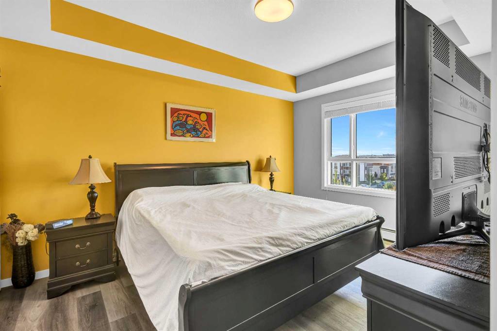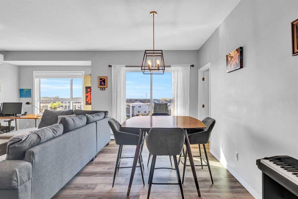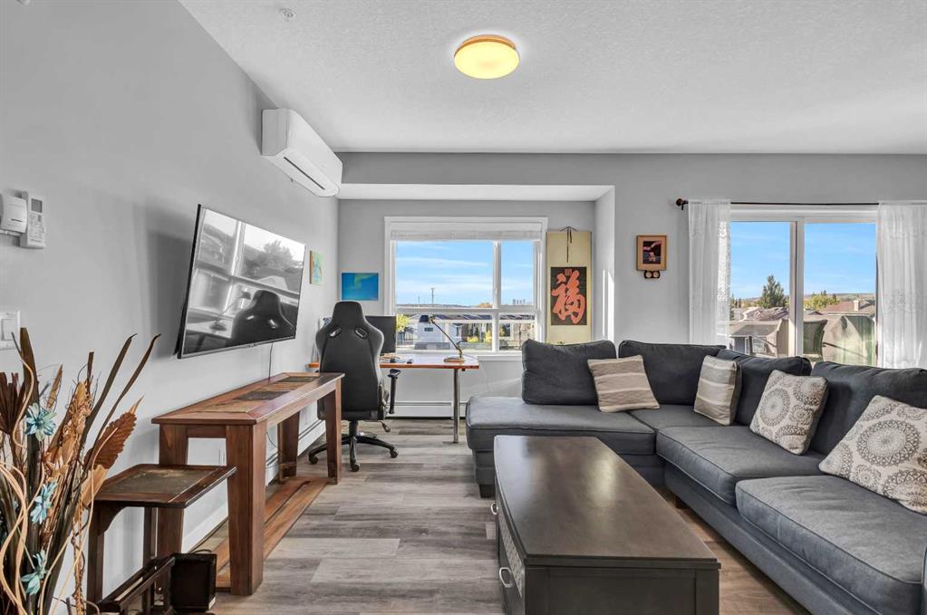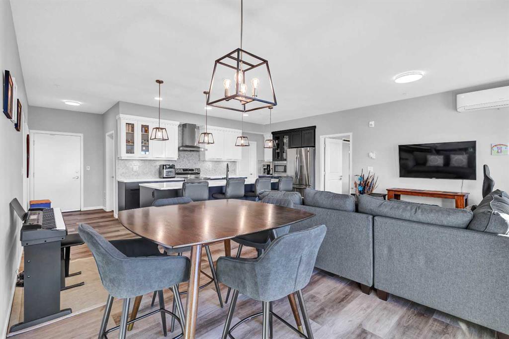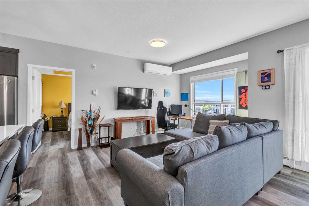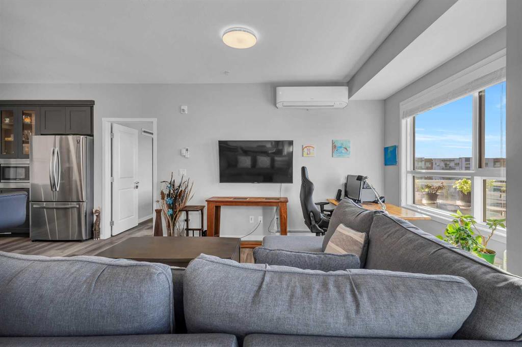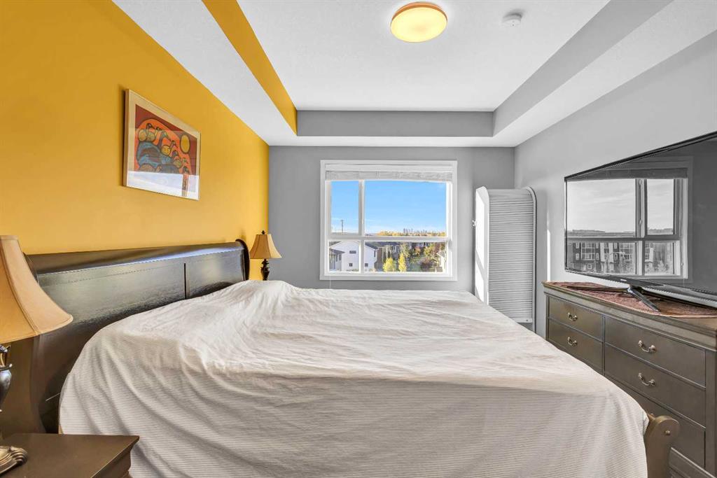 Welcome to this immaculate, like-new condo in The Rise, an award-winning building by Cedarglen Living.Offering THREE bedrooms, TWO bathrooms, and 1,165 sq. ft., this thoughtfully designed home combines modern finishes, functional living, and a low-maintenance lifestyle.The open-concept gourmet kitchen is a true highlight, featuring soft-close doors and drawers cabinets with sleek quartz countertops, a spacious pantry, and an oversized quartz island that’s perfect for entertaining. Modern stainless steel appliances—including a full-size fridge, stove, dishwasher, and built-in microwave—complete this well-appointed space. From the kitchen, the layout flows seamlessly into the bright and inviting living room, where nine-foot ceilings and expansive SOUTH-facing windows fill the space with natural light. The living area extends to a covered balcony with a BBQ gas line and scenic views, providing the perfect setting for morning coffee or evening relaxation.The primary suite is designed as a private retreat, complete with a generous walk-in closet and a spa-inspired four-piece ensuite. The secondary bedroom and versatile den offer flexibility for guests, a home office and are complemented by another full four-piece bathroom. A spacious laundry room with a handmade shelf and countertop adds both convenience and extra storage.This home is filled with upgrades, including luxury vinyl plank and tile flooring throughout, extended height cabinetry in the bathrooms and kitchen island, quartz countertops in both the kitchen and bathrooms, central air conditioning, and wall-mounted medicine cabinets in both bathrooms. A separate storage room and a TITLE underground parking stall with secure bike storage further enhance the convenience of this property.The Rise is surrounded by lifestyle amenities, including scenic walking paths, a pedestrian bridge, and a stormwater pond that create a peaceful setting for daily walks. The Harvest Hills community also offers HOA-managed amenities such as tennis courts and recreational spaces, while schools, playgrounds, parks, and the public library are just minutes away. Nearby shopping and dining options include Country Hills Towne Centre and Harvest Hills Crossing, with grocery stores, restaurants, a movie theatre, VIVO Recreation Centre, and T&T Supermarket all within easy reach. Quick access to Stoney Trail, Country Hills Boulevard, and Deerfoot Trail, along with just a 10-minute drive to Calgary International Airport, make this location as convenient as it is desirable. Meticulously maintained by the original owner, this home shows like new and offers a functional layout designed for both comfort and efficiency. With its blend of luxury finishes, vibrant community lifestyle, and prime location, this condo presents a rare opportunity in one of Calgary’s most sought-after neighbourhoods.Schedule your private showing today to experience the comfort, style, and convenience it has to offer.